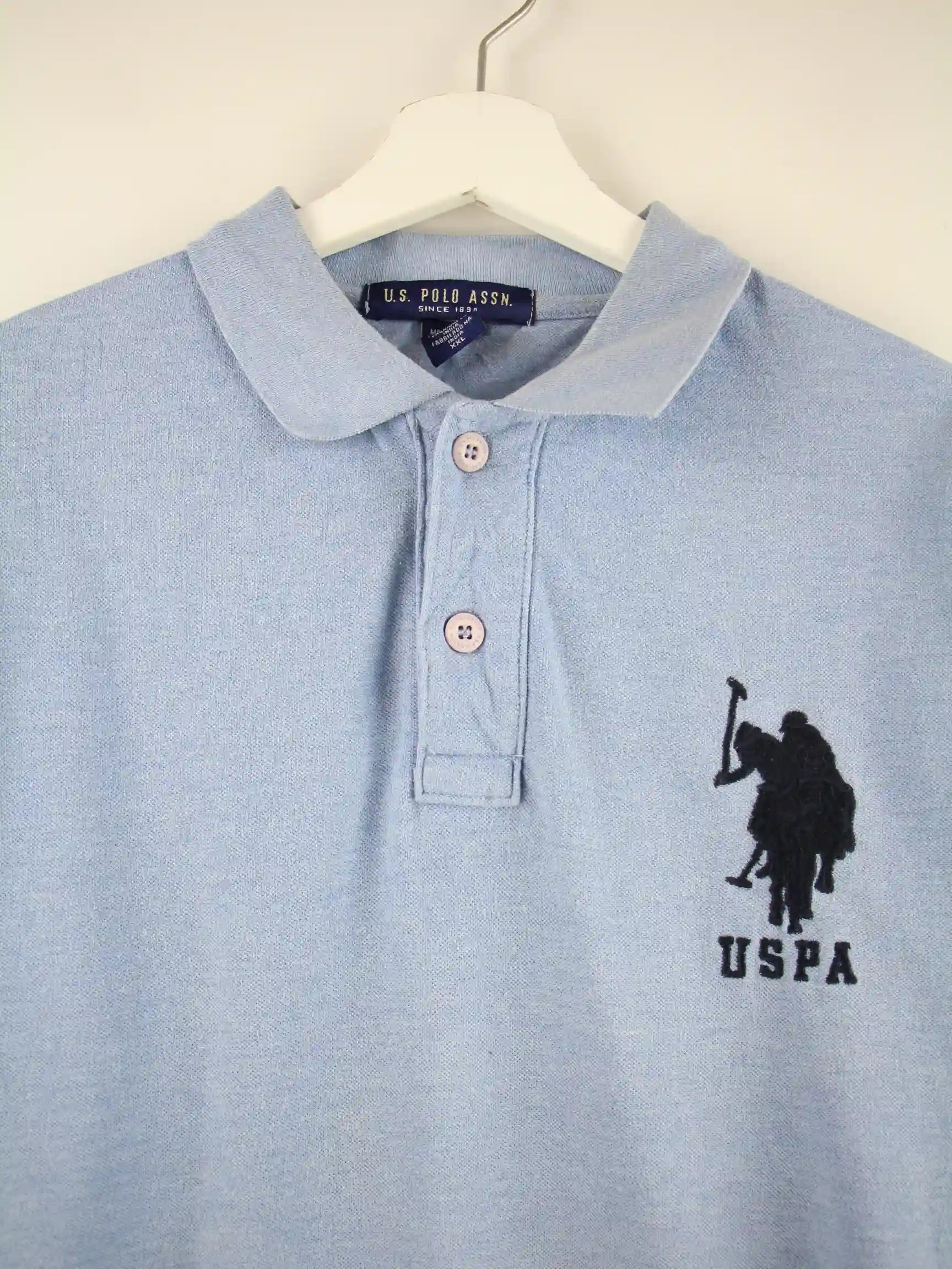 Blaues Poloshirt vom Label U.S. Polo ASSN. in Größe XXL. Es ist aus Baumwolle hergestellt. Den Zustand würden wir als 'In Ordnung' bezeichnen (vergl. Bilder).