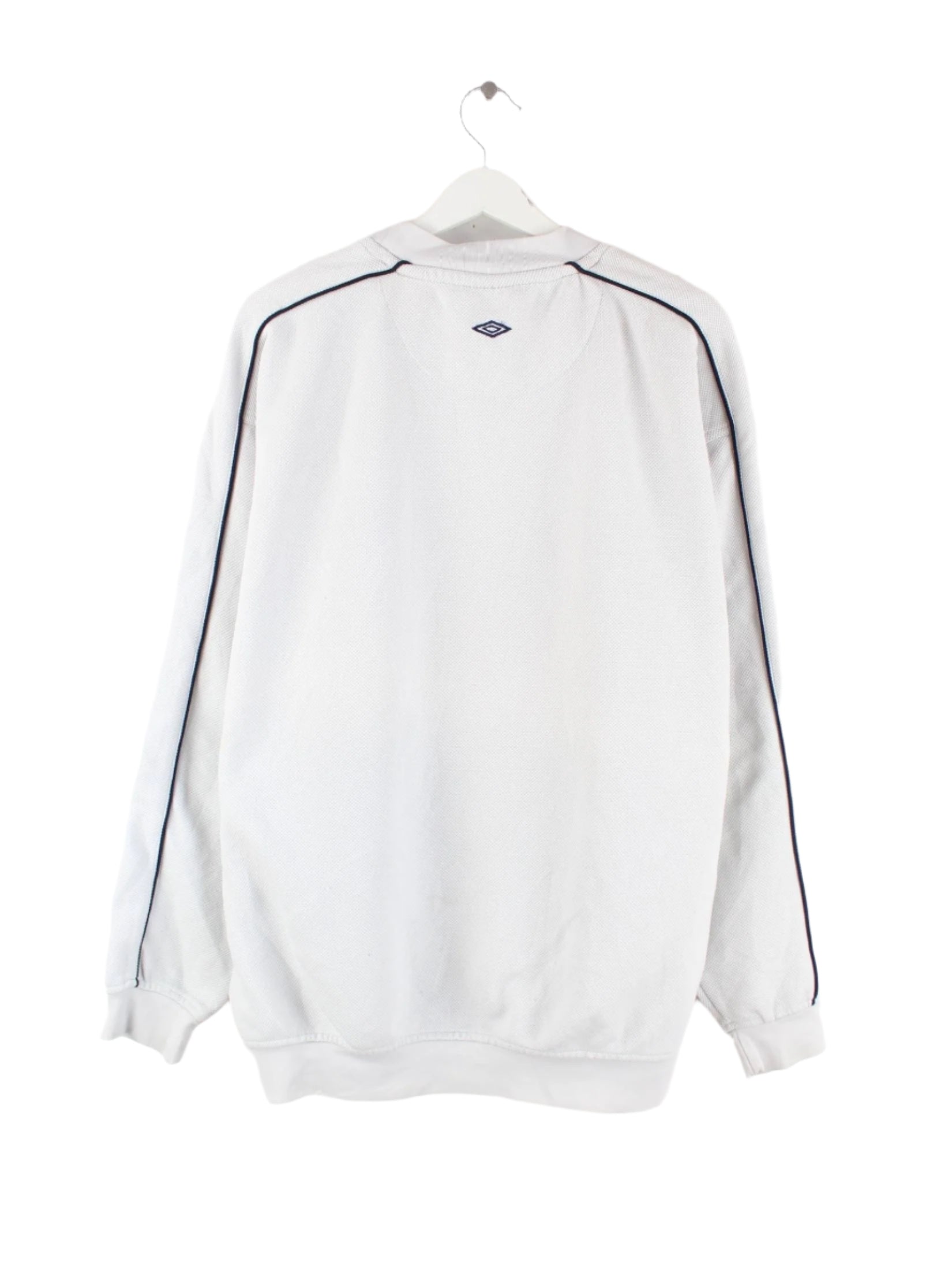 Sweater der Marke Umbro mit Stick in Größe L aus den 90'ern. Er ist aus einer Synthetikmischung hergestellt und in Weiß zu haben.