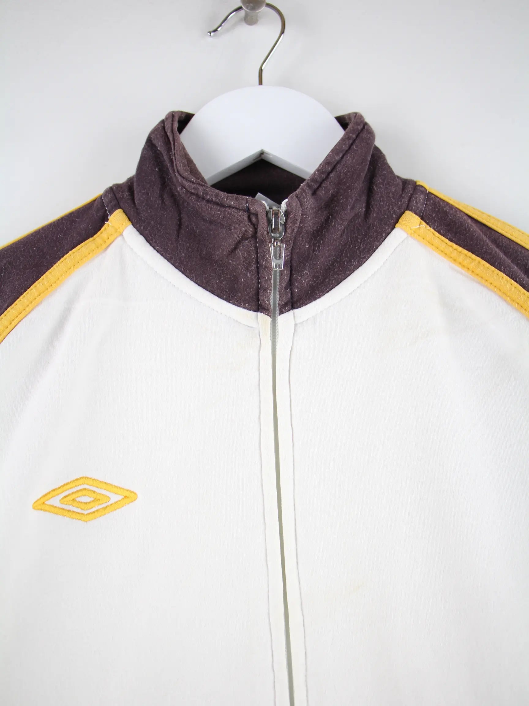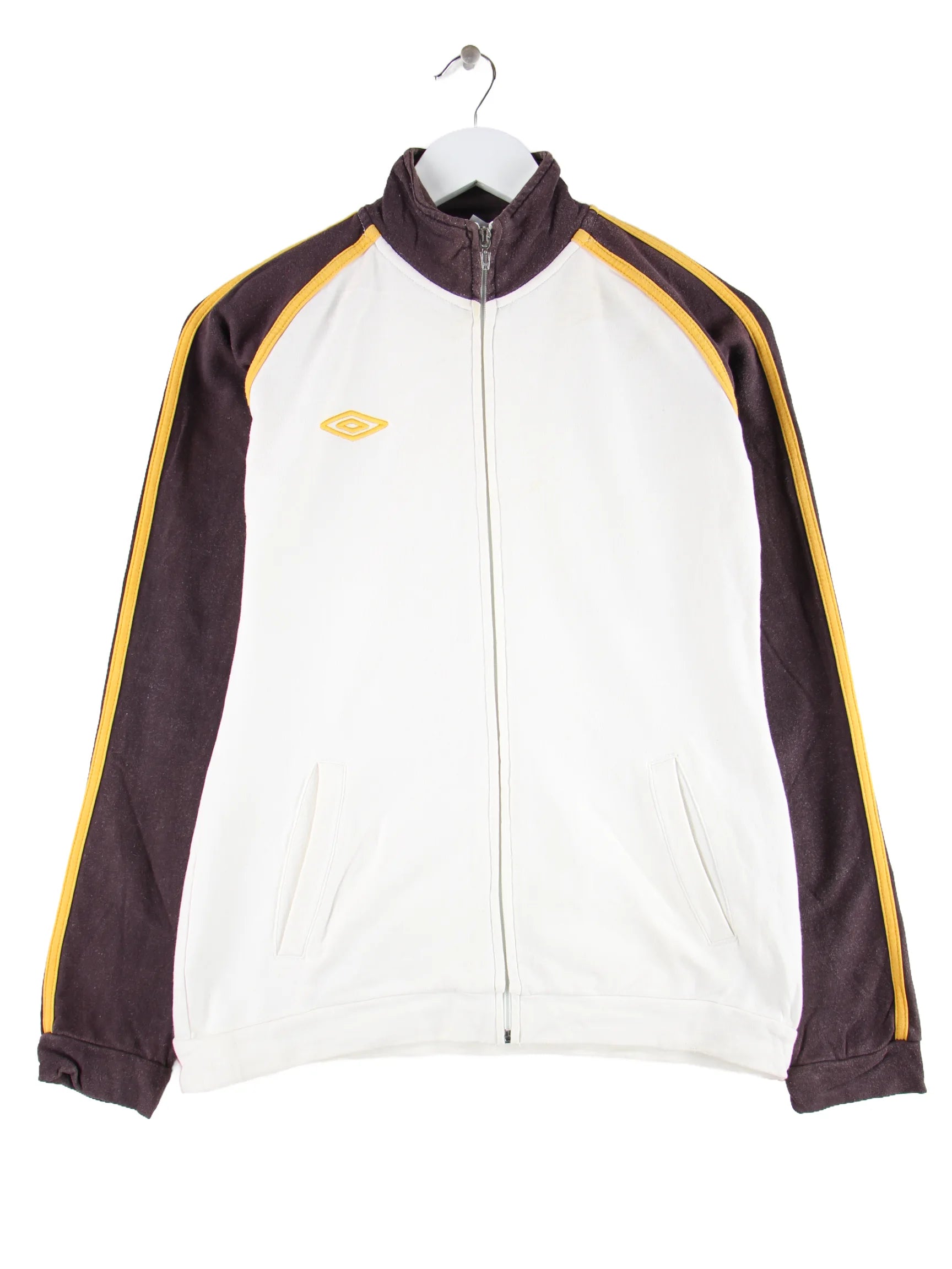 Sweatjacke der Marke Umbro in Größe M. Sie ist aus einer Baumwollmischung und in Weiß vorrätig.