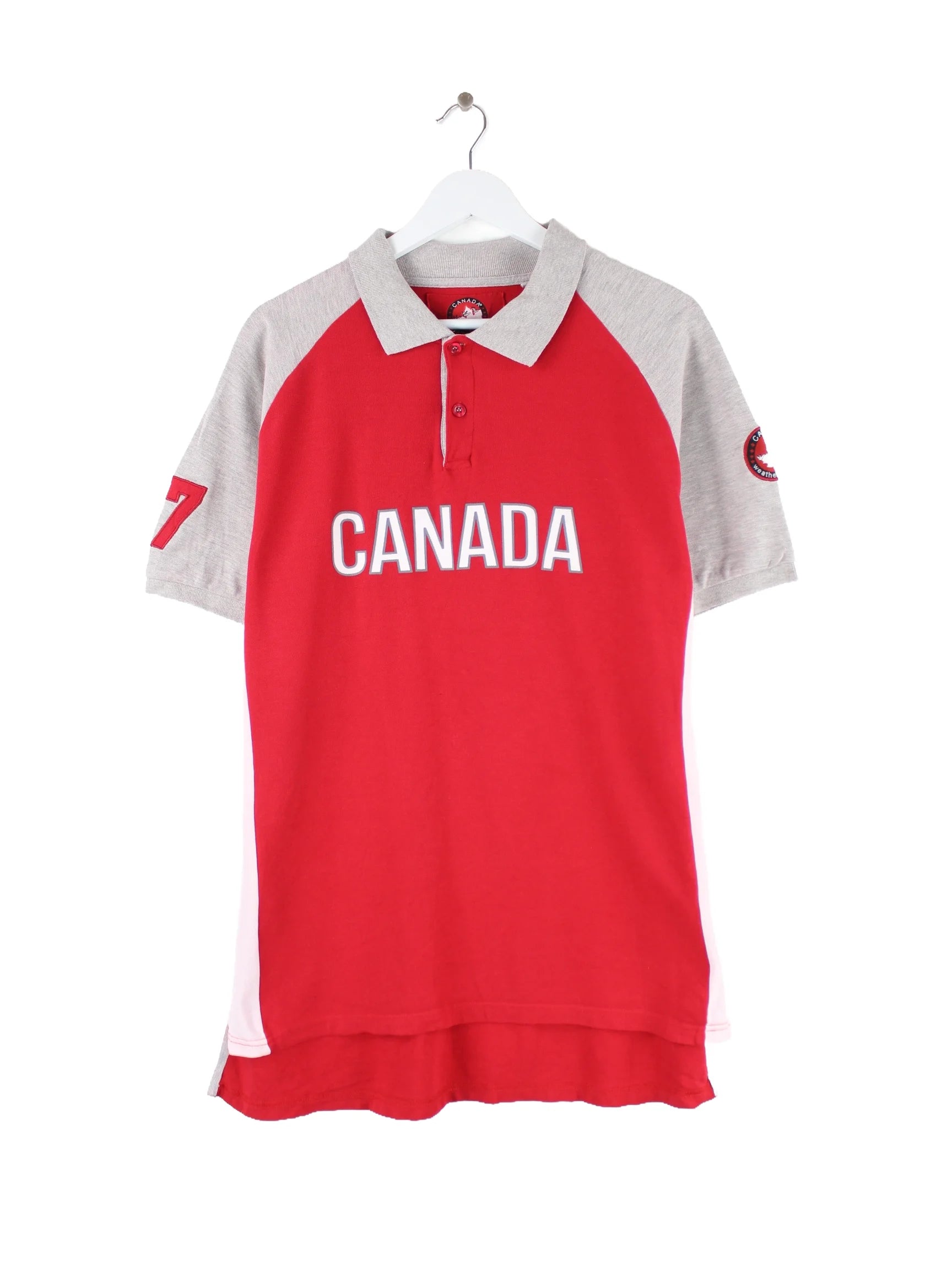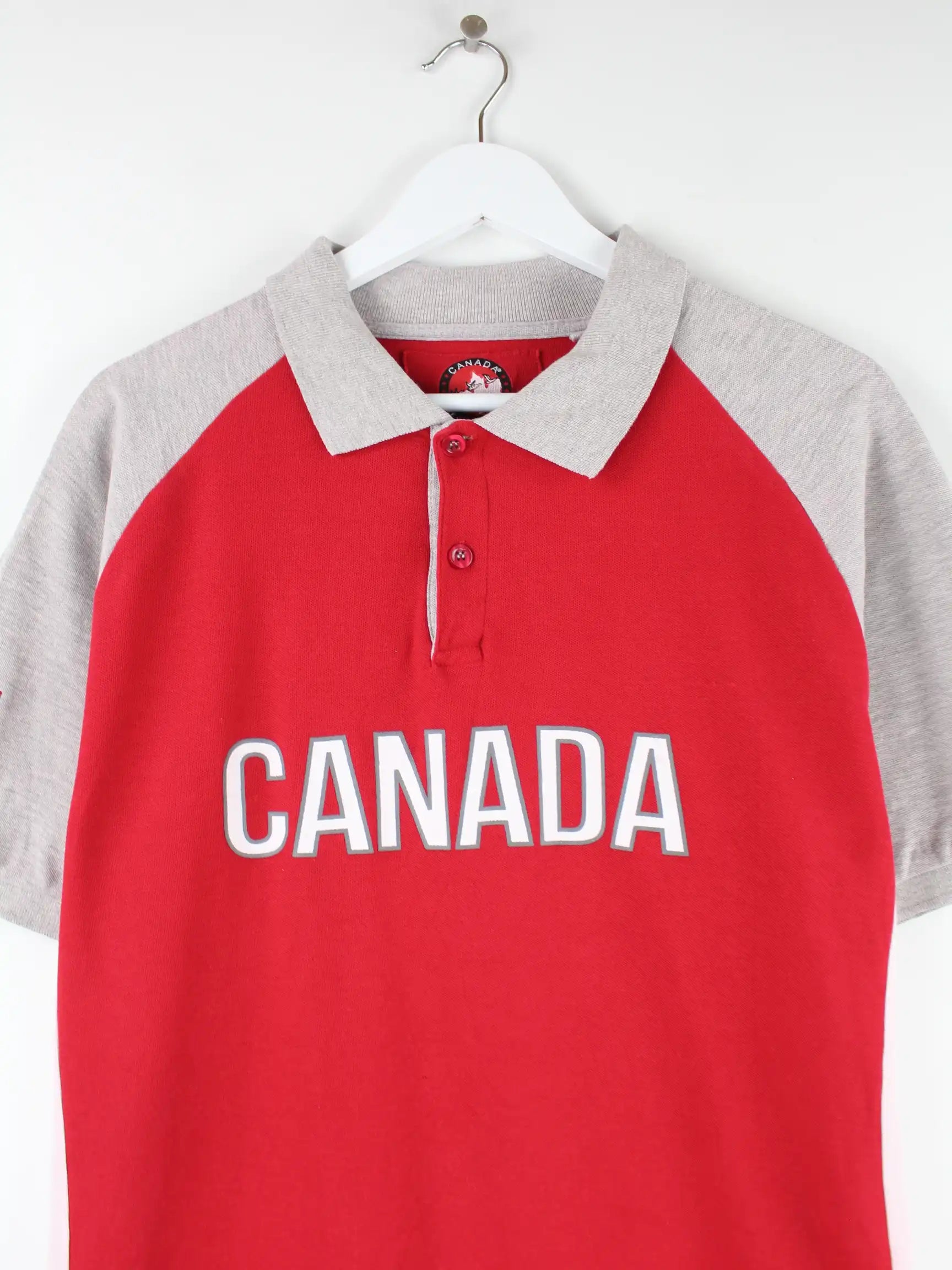 Vintage Poloshirt in Größe XL. Es ist aus Baumwolle gefertigt und in Rot im Bestand. Mit seltenem Canada Print.