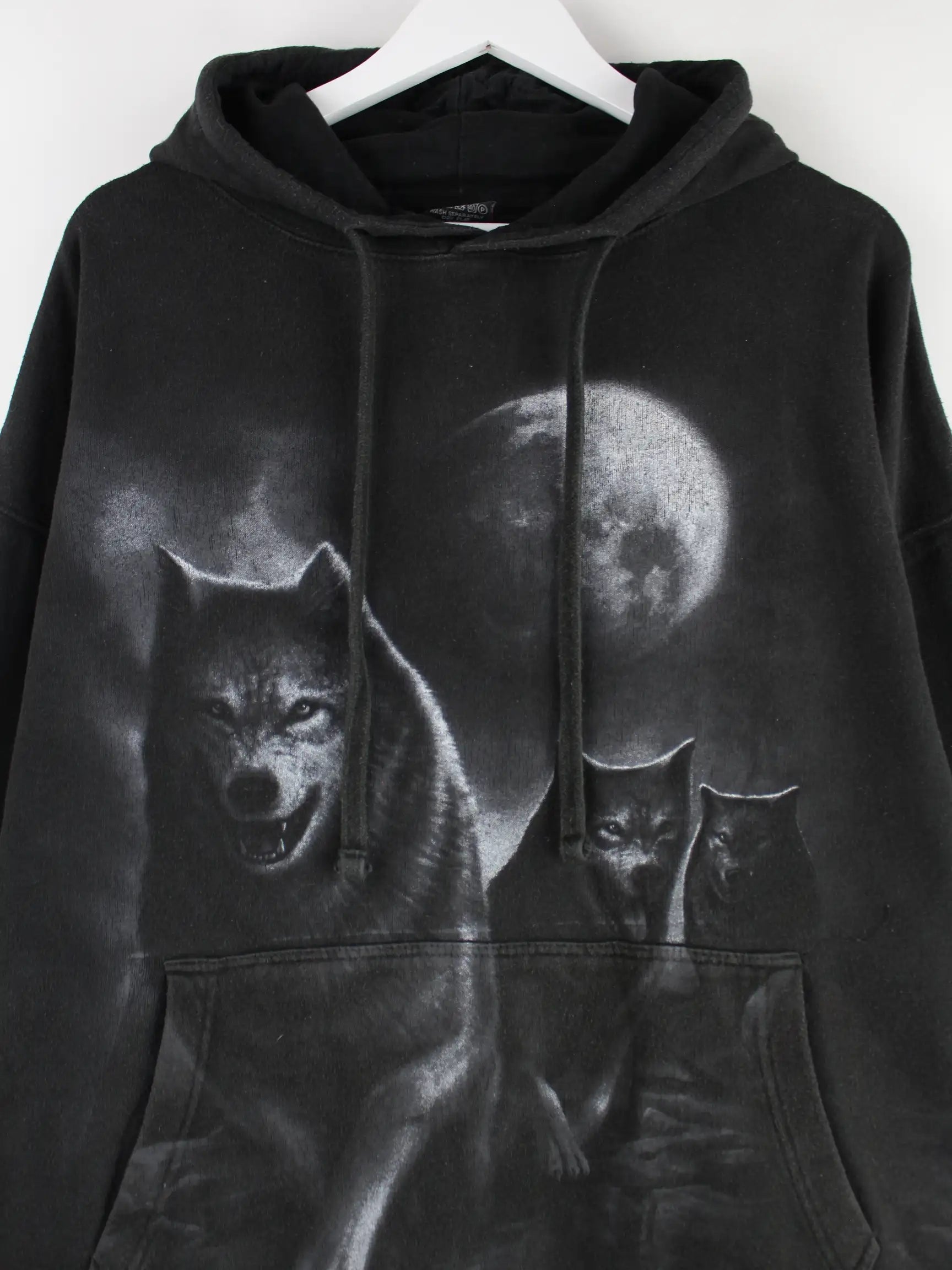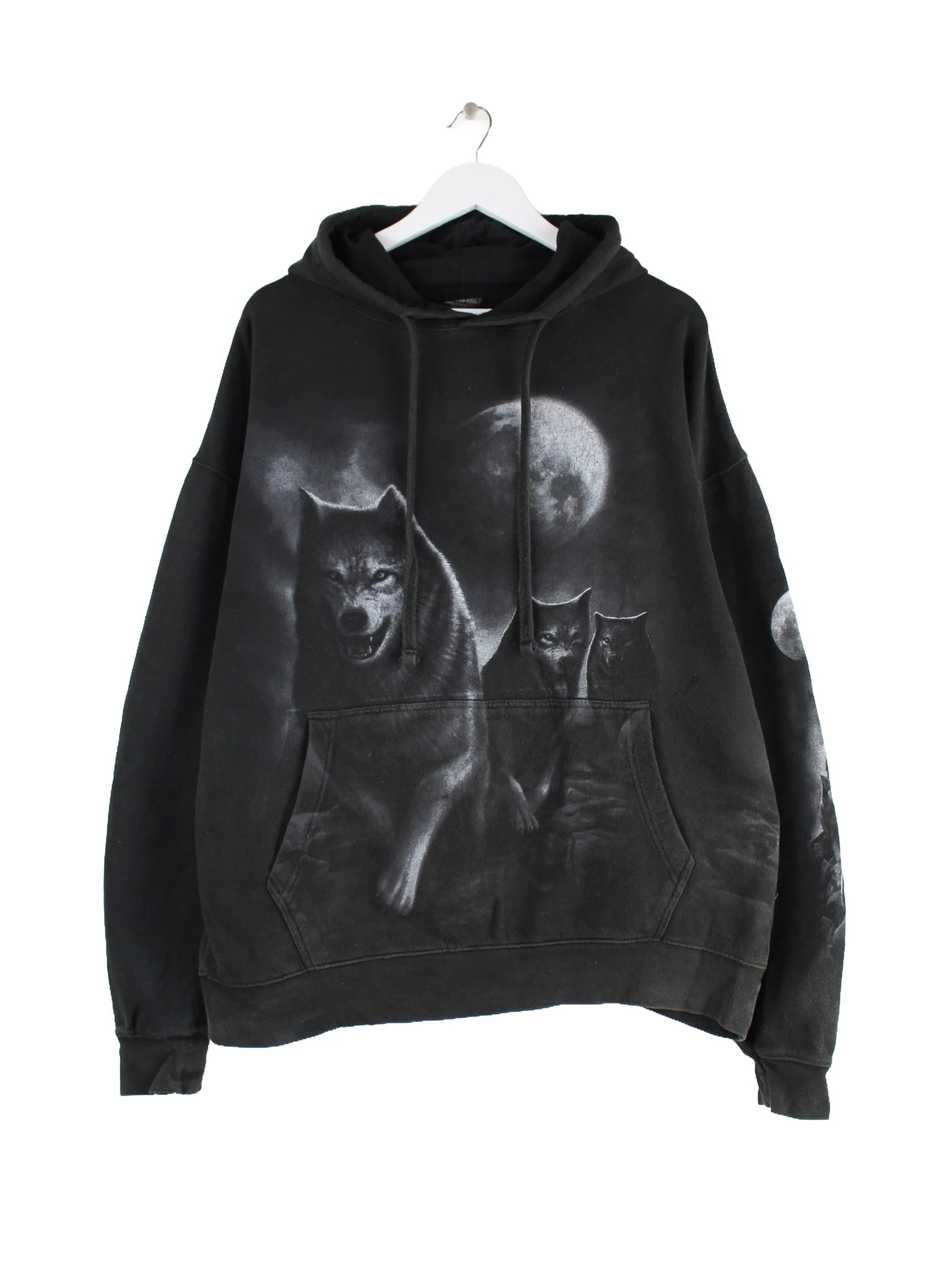 Schwarzer Vintage Hoodie in Größe XXL. Er ist aus einer Baumwollmischung hergestellt. Den Zustand würden wir als 'In Ordnung' bezeichnen (vergl. Bilder).Mit tollem Wolves Print.