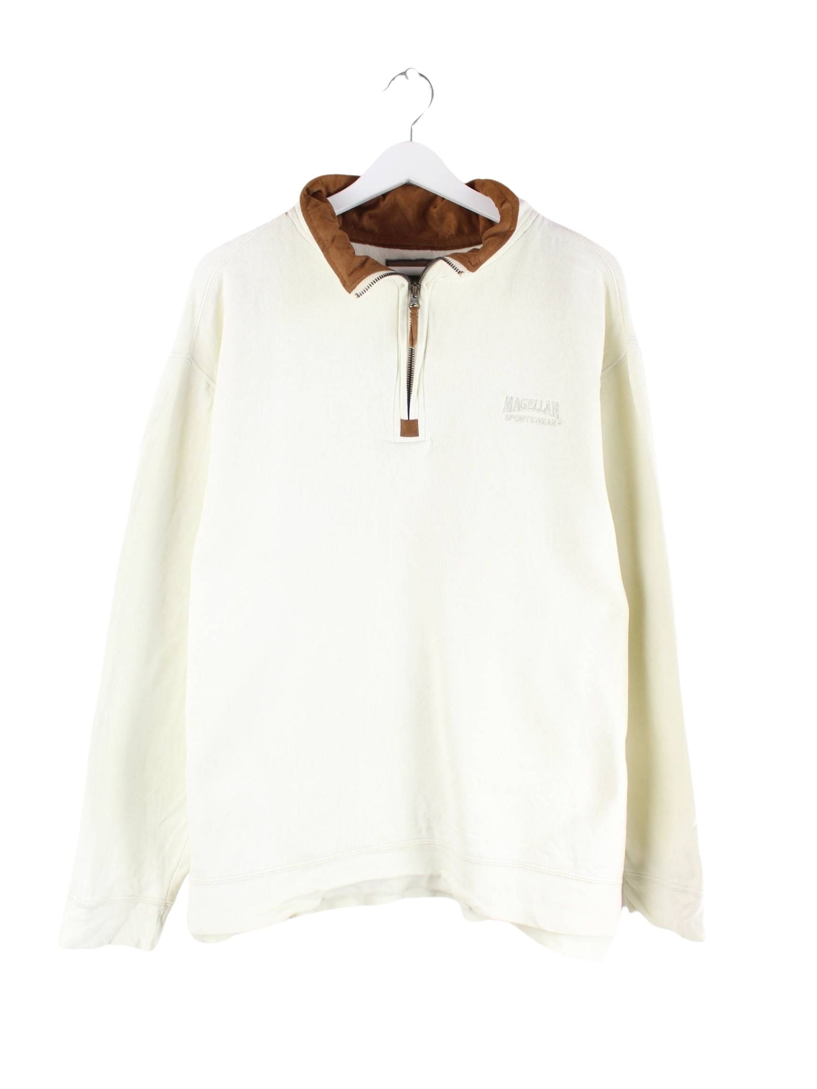 Vintage Sweater mit gesticktem Logo und halbem Reißverschluß in Größe XL. Er ist aus einer Baumwollmischung produziert und in Beige im Angebot.