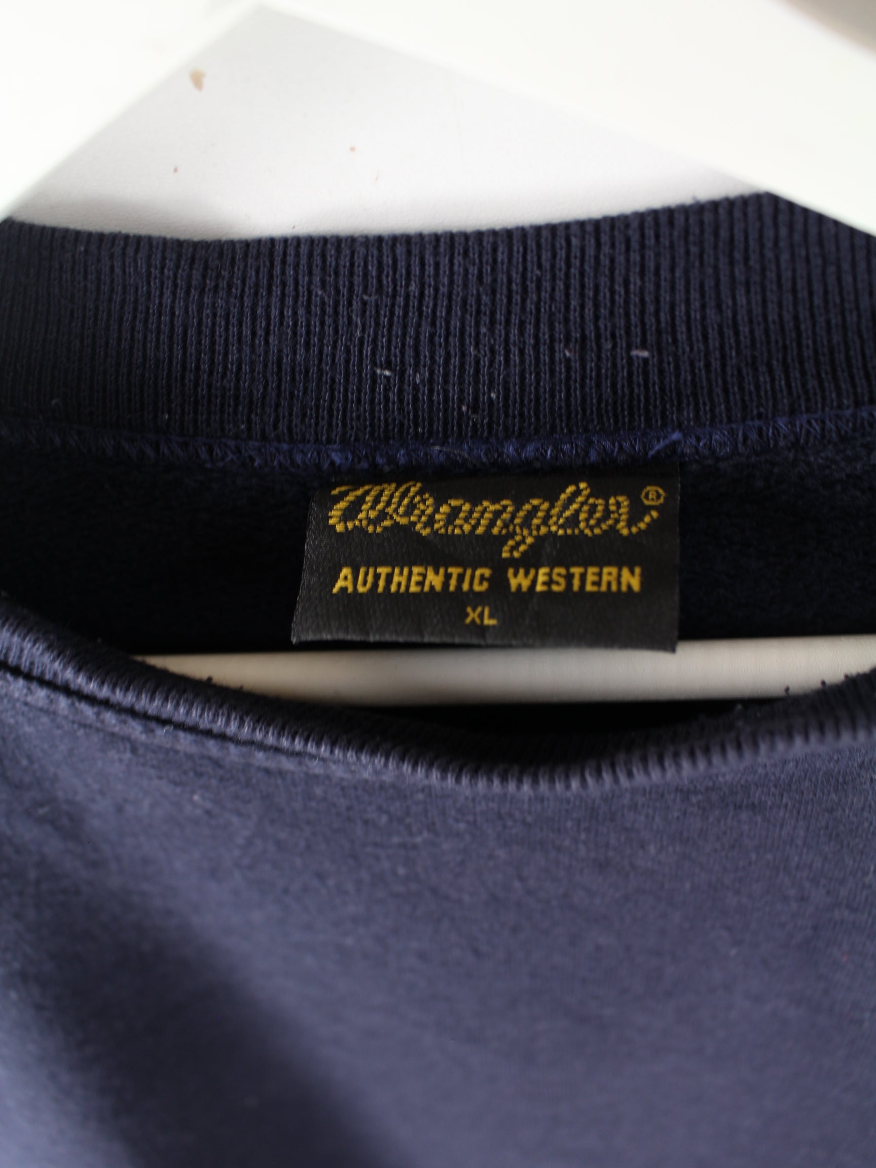 Blauer Vintage Wrangler Sweater mit großem Logo Backprint aus den 90er Jahren.