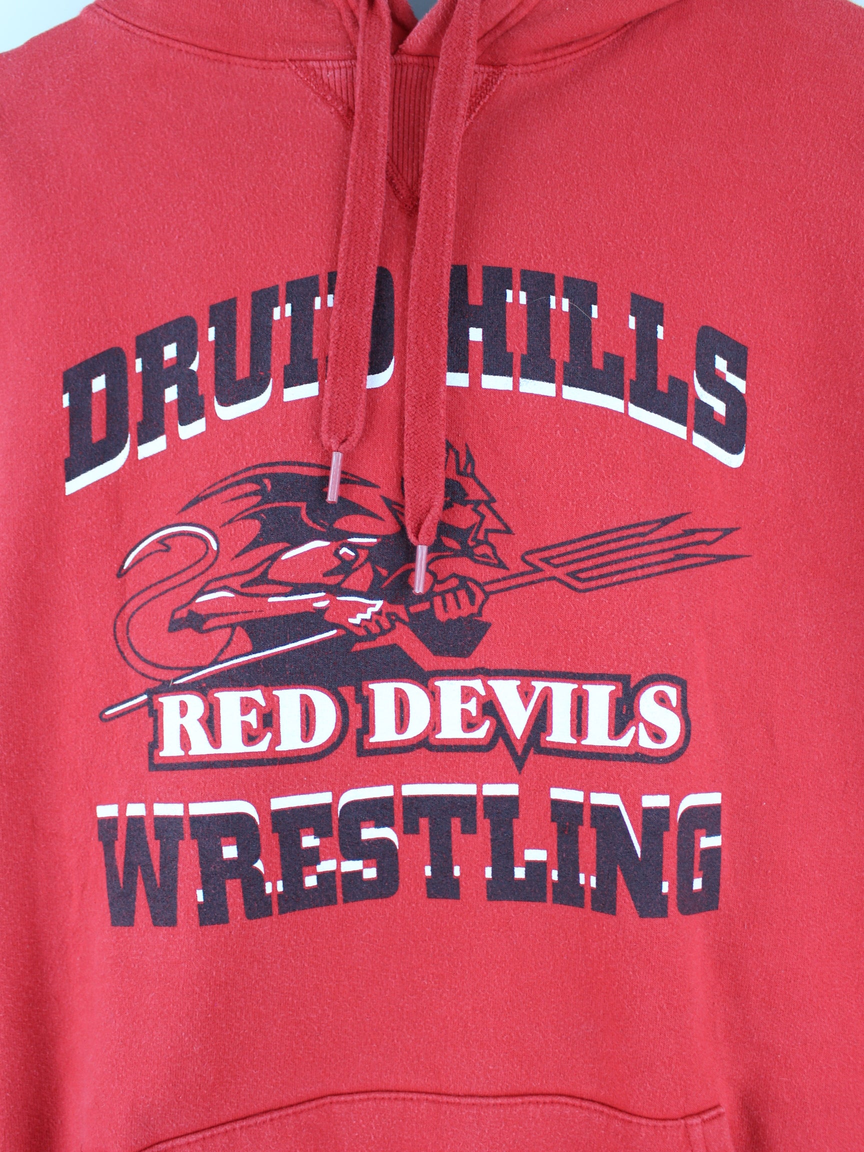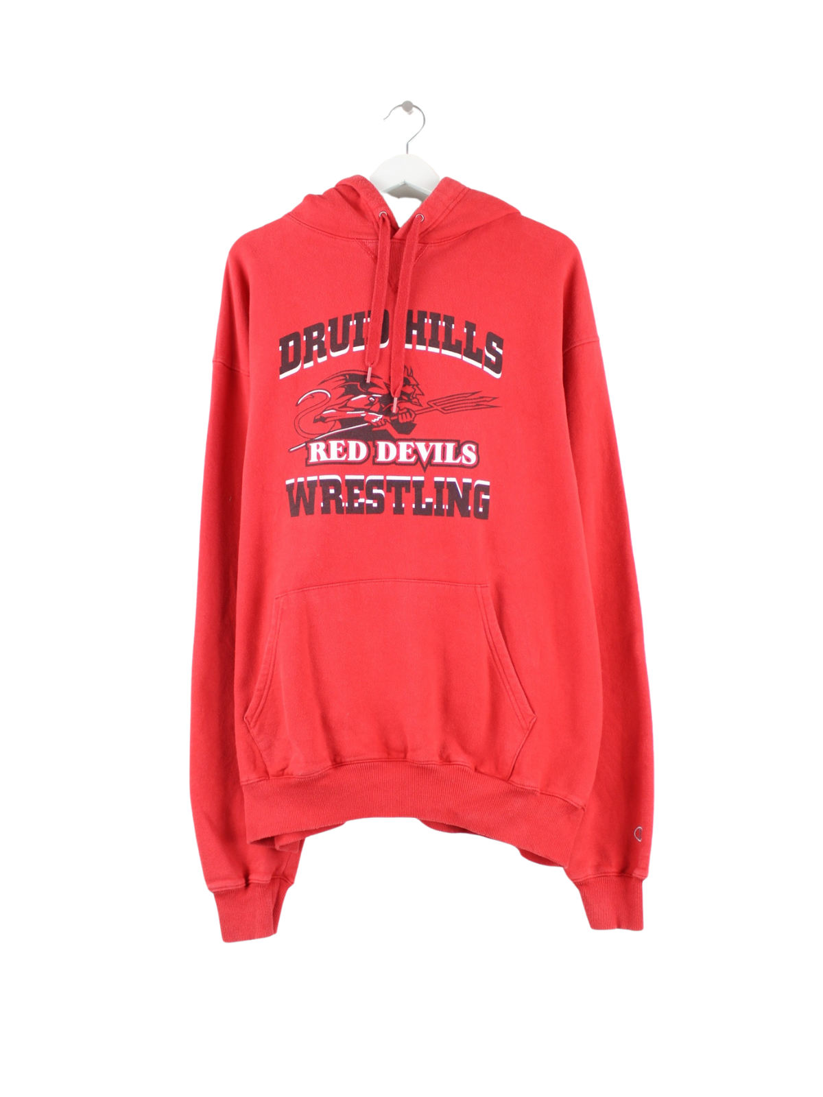 Hoodie der Marke Champion in Größe XL. Er ist aus einer Baumwollmischung produziert und in Rot lieferbar. Mit chiquem Devils Print.