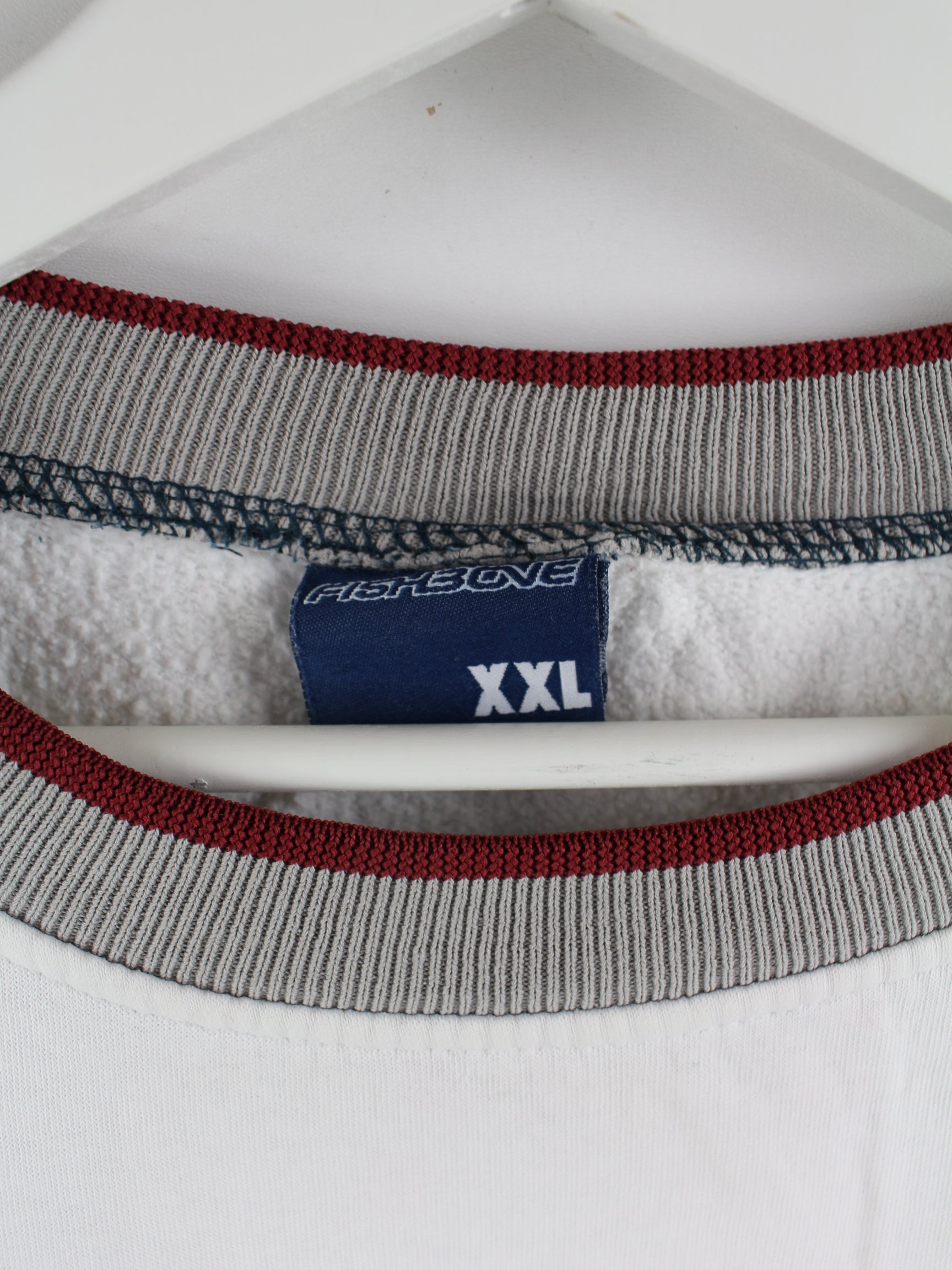 Weißer Sweater der Marke Fishbone aus Anfang der 2000'er in Größe XXL. Er ist aus einer Baumwollmischung produziert und in gutem Zustand bei uns zu bekommen.