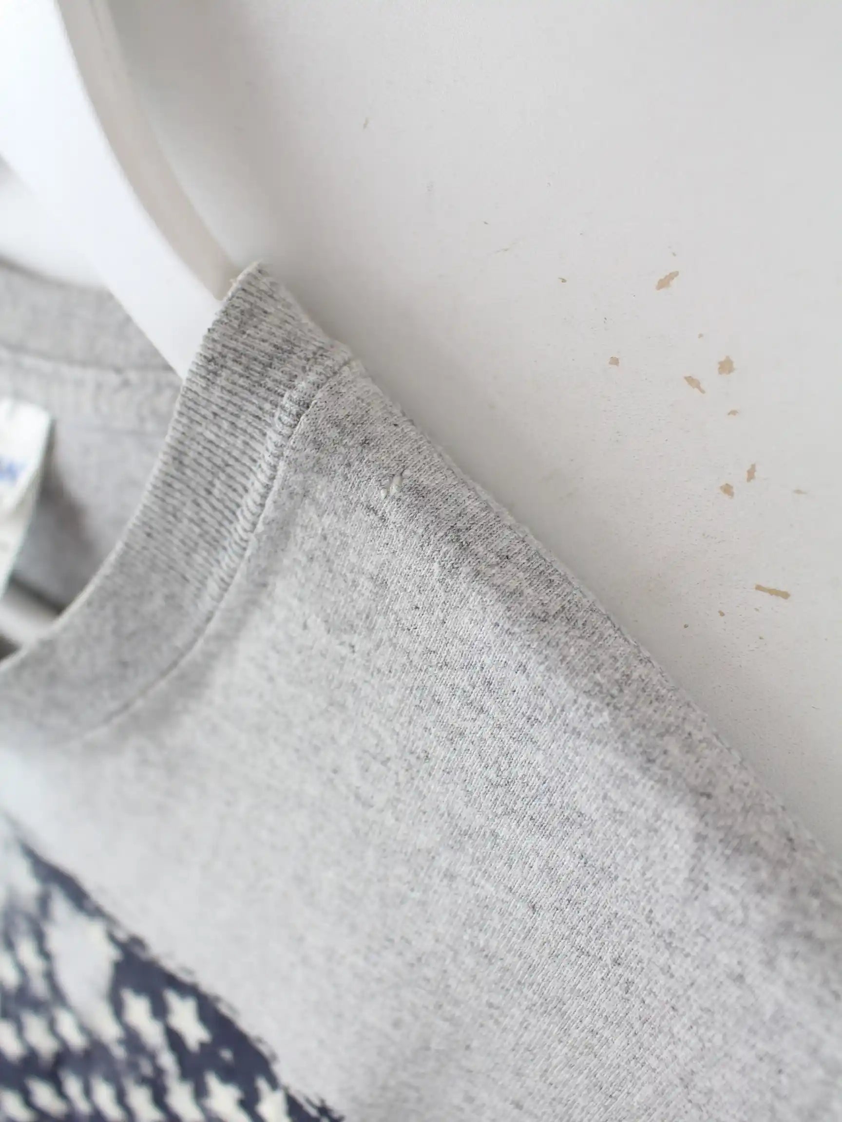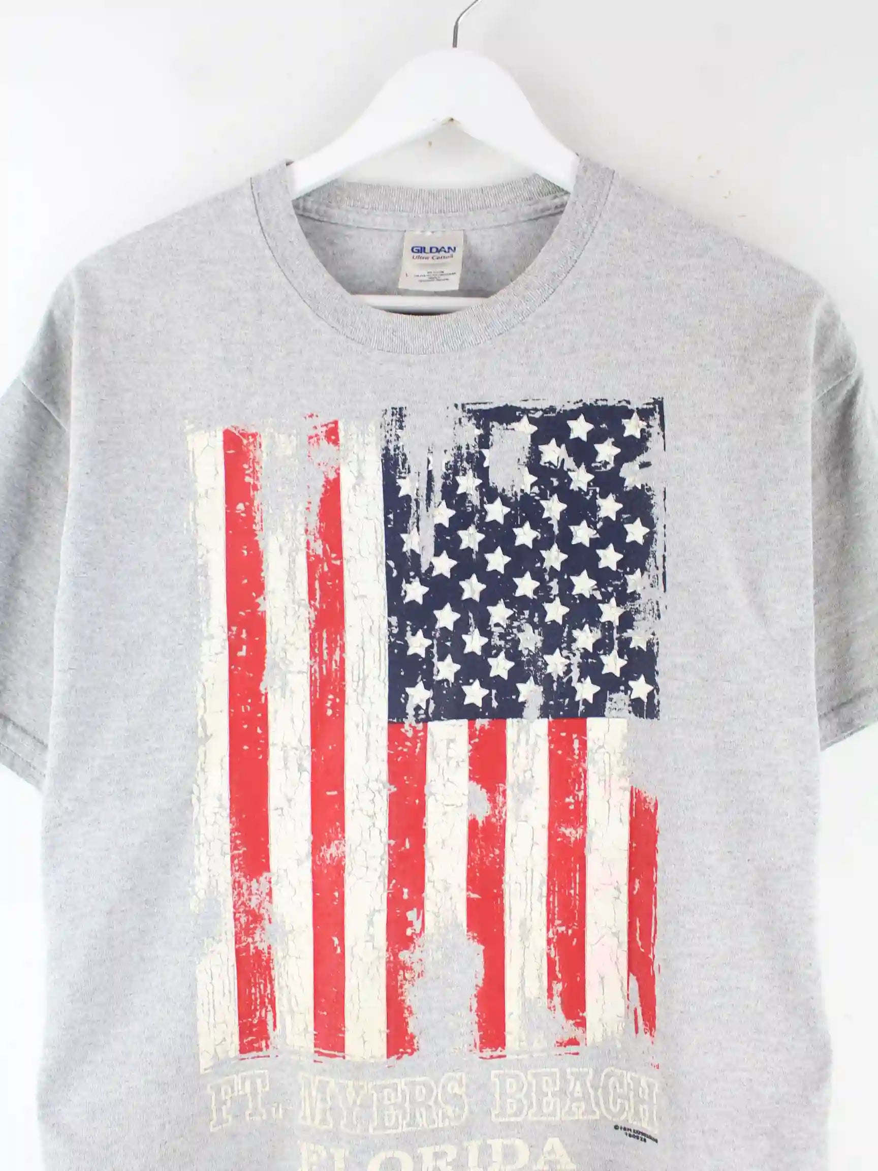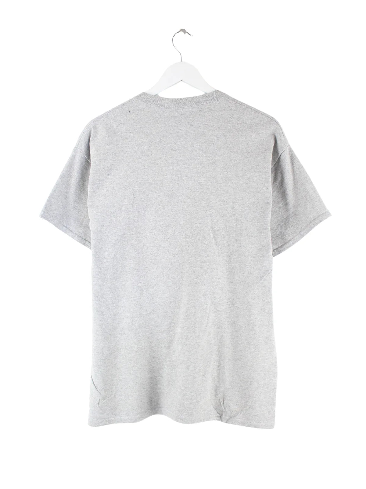 T-Shirt der Marke Gildan in Größe L. Es ist aus einer Baumwollmischung angefertigt und in Grau im Angebot. Mit seltenem USA Print.