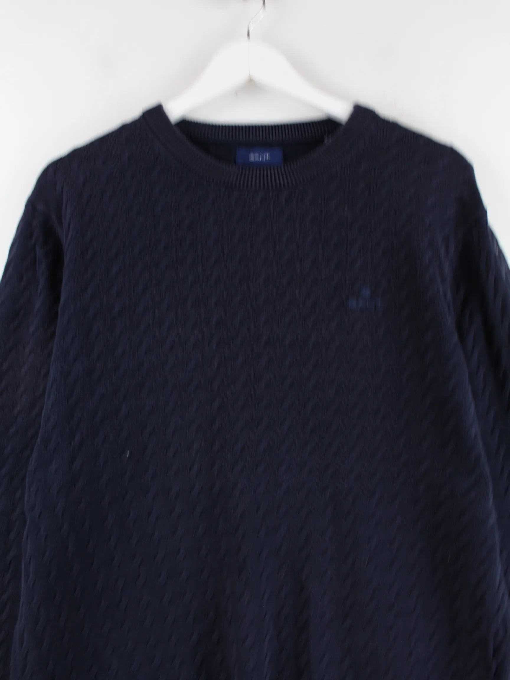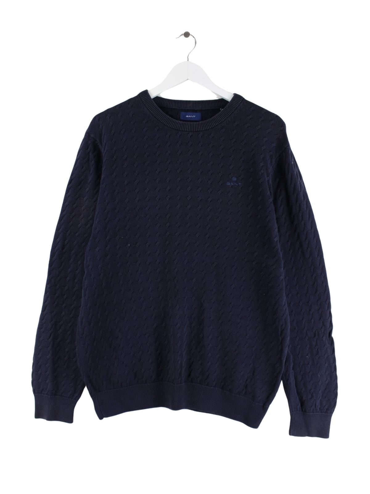 Blauer Pullover der Brand Gant in Größe L. Er ist aus Baumwolle gefertigt und in sehr gutem Zustand bei uns zu bekommen.