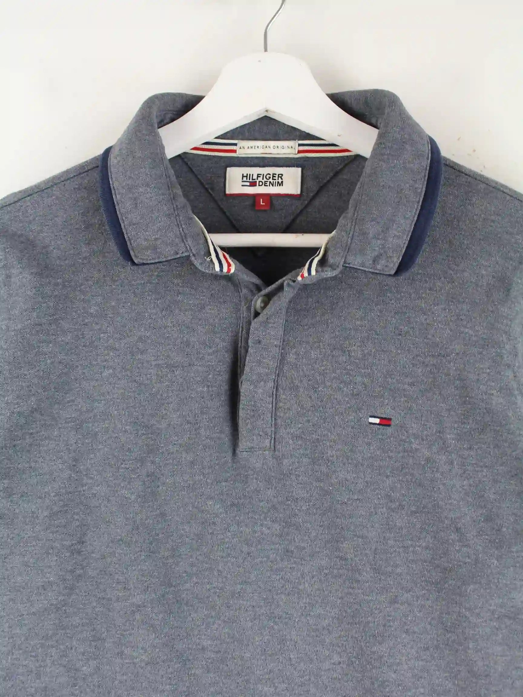 Blaues Poloshirt vom Brand Tommy Hilfiger in Größe L. Es ist aus Baumwolle hergestellt und in sehr gutem Zustand im Bestand.