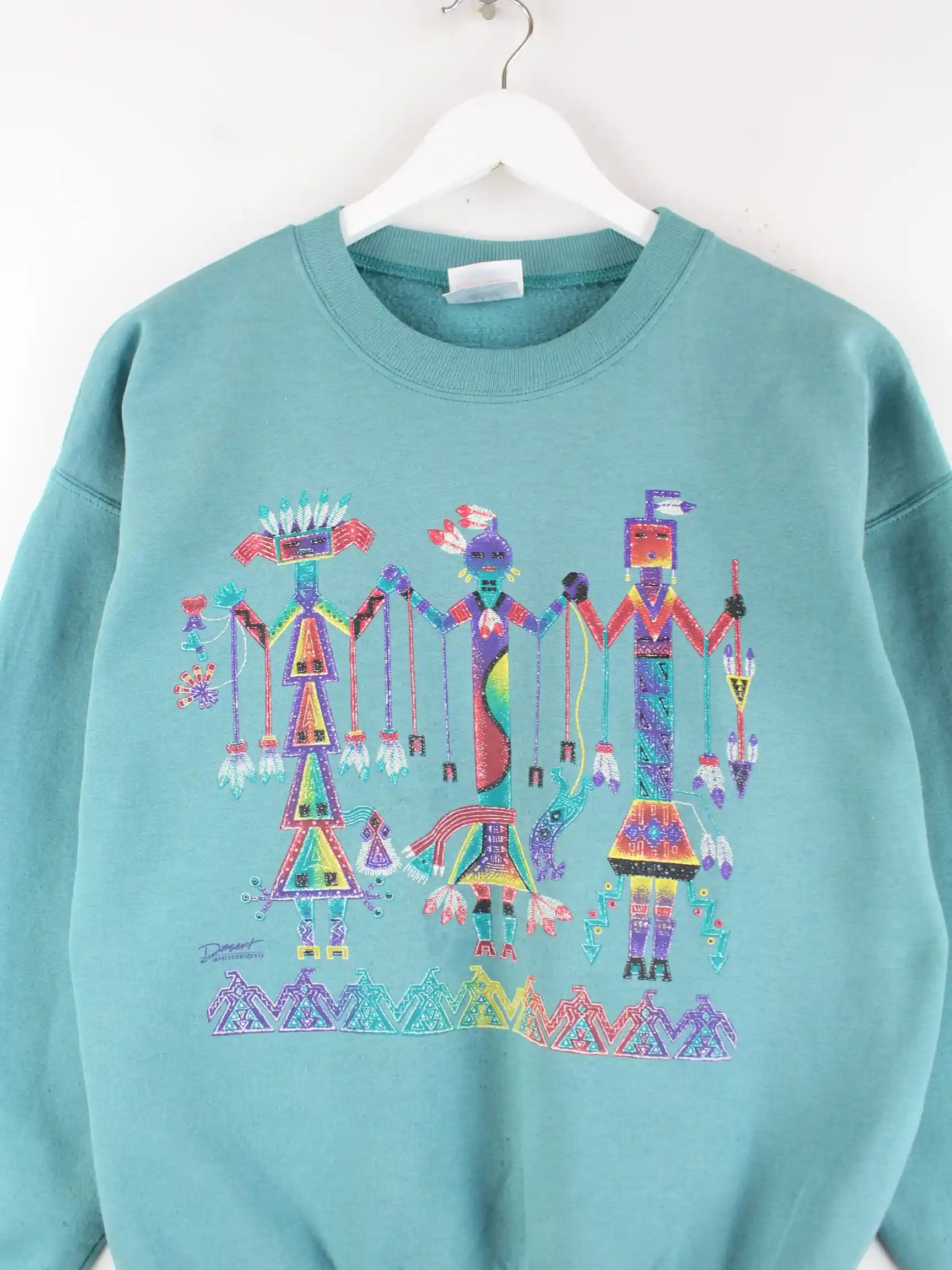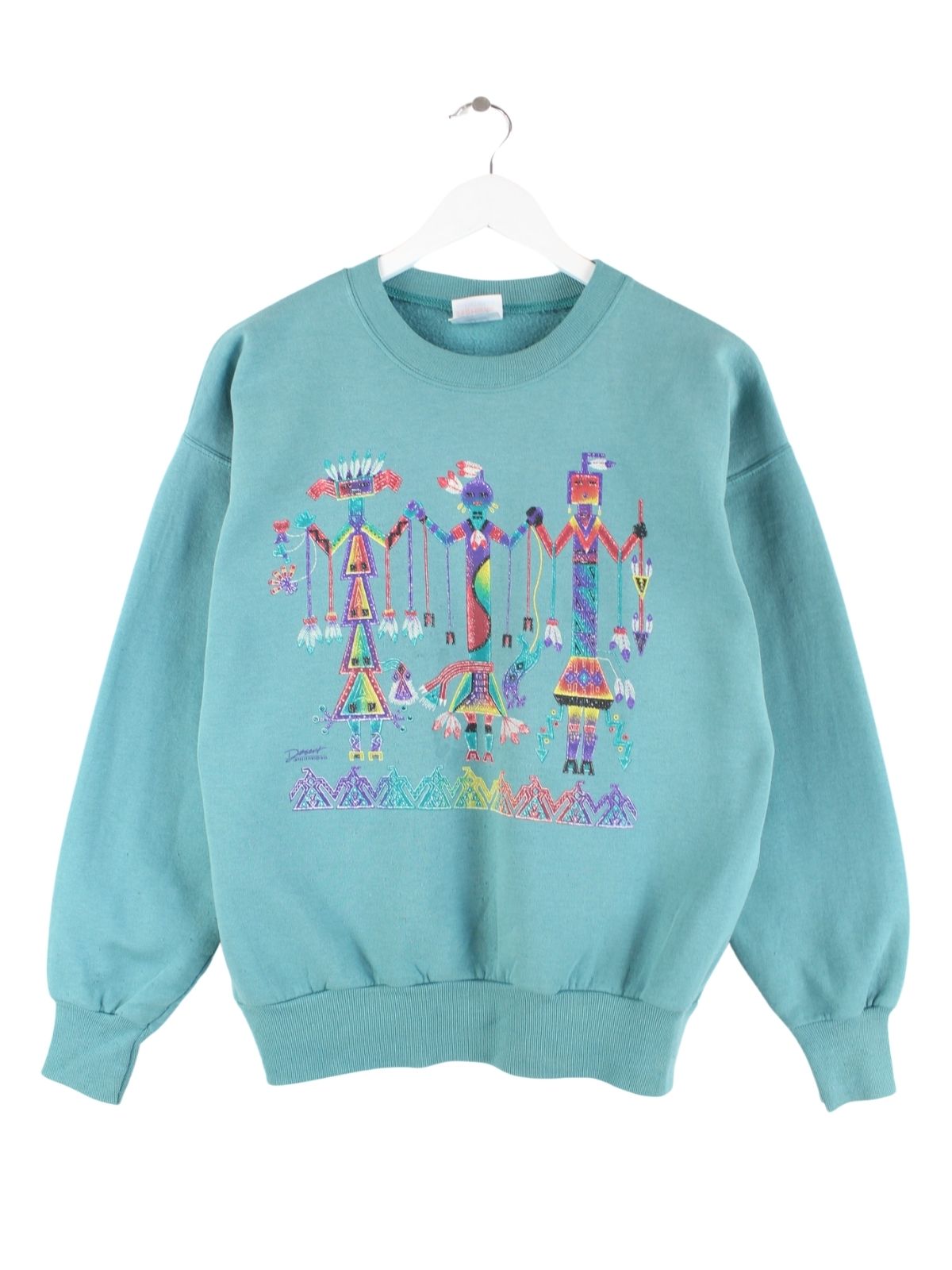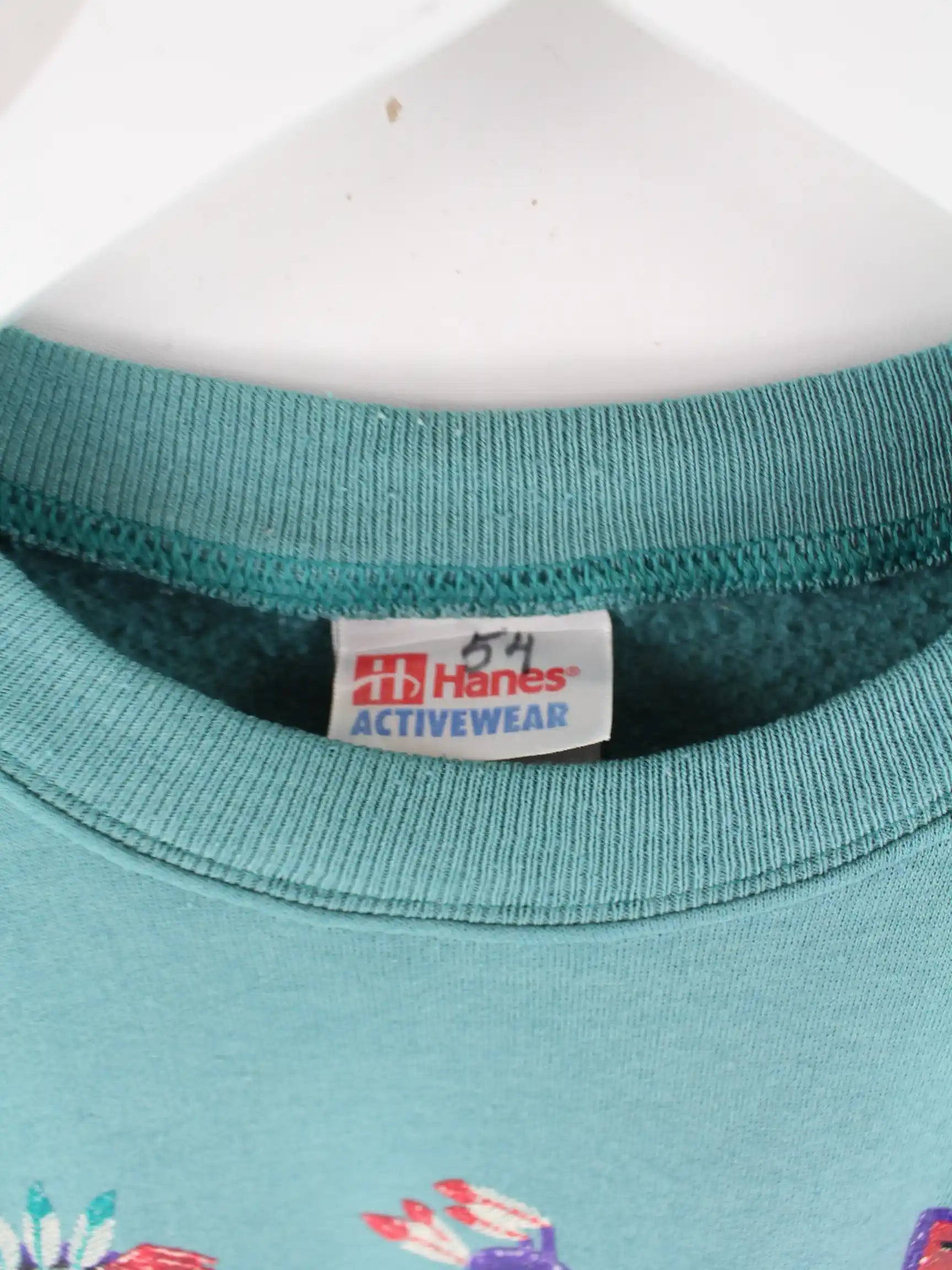 Sweater aus dem Hause Hanes in Größe M. Er ist aus einer Baumwollmischung und in Türkis in Stock. Mit schönem Tribe Print.