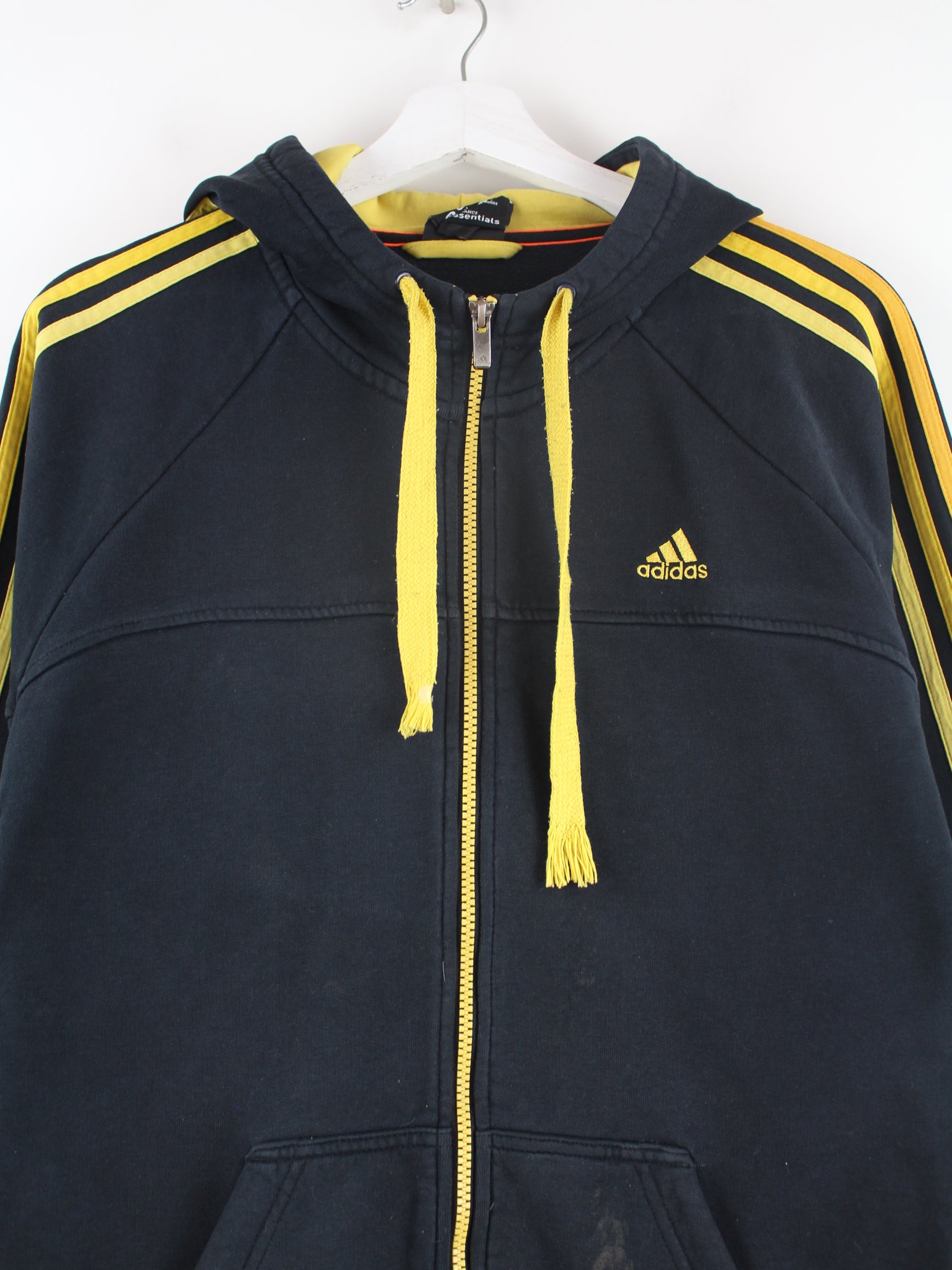 Hoodie vom Label Adidas mit Zip in Größe M. Er ist aus einer Baumwollmischung gefertigt und in Schwarz vorrätig.