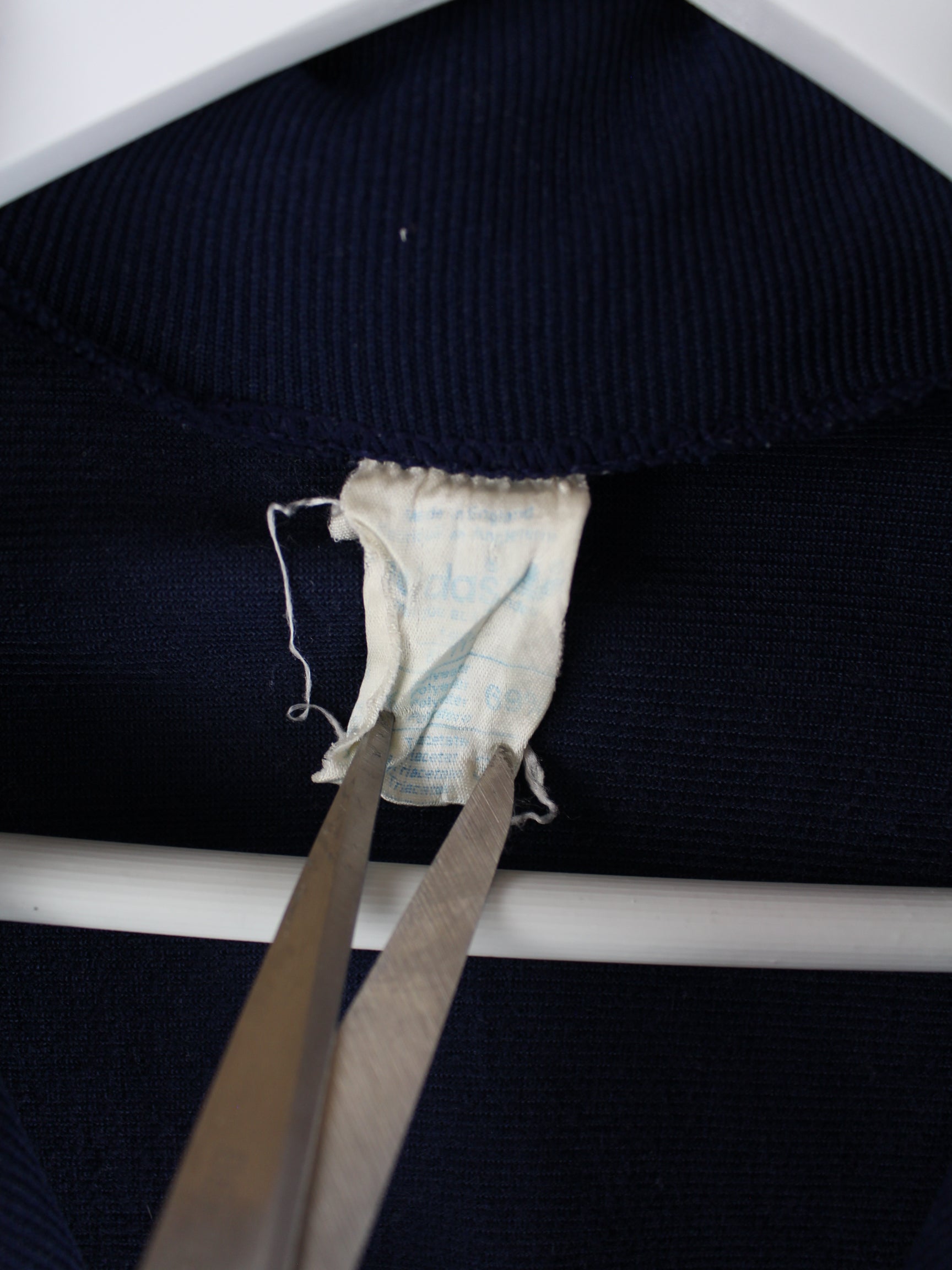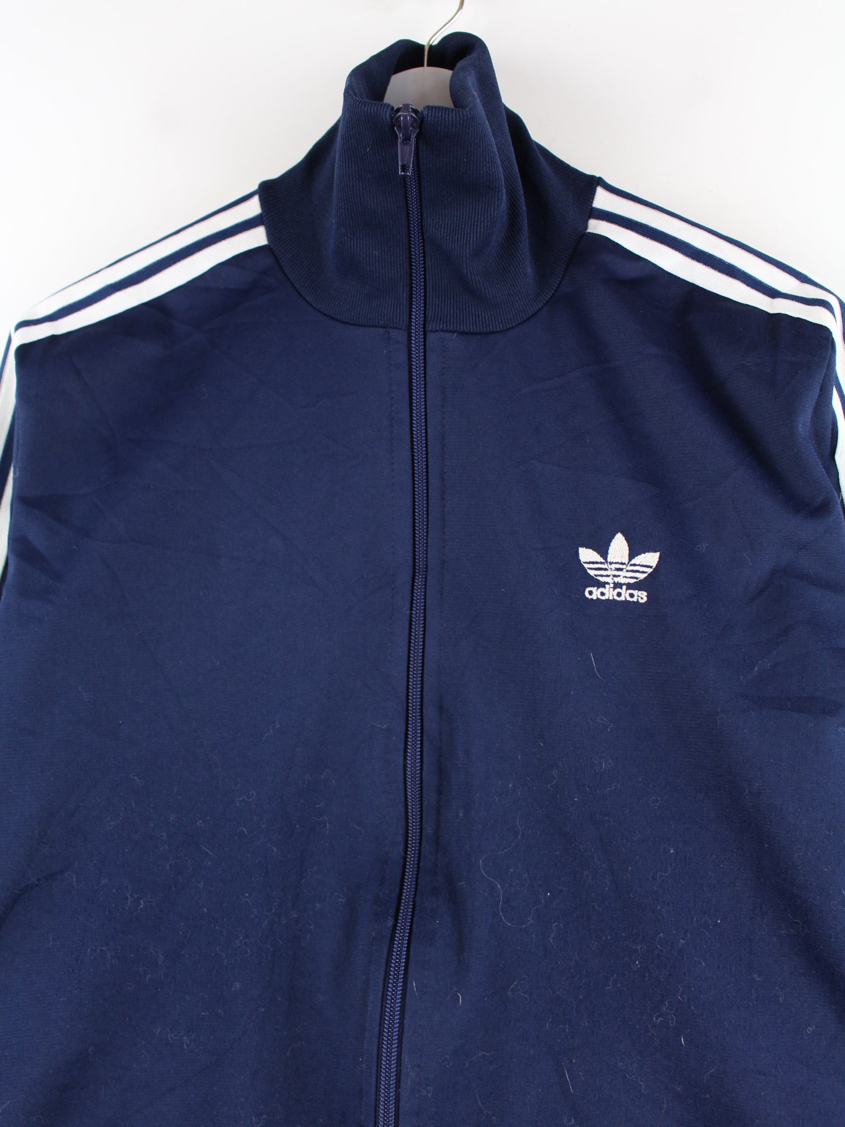 Blaue Trainingsjacke vom Label Adidas aus den 70'ern in Größe M. Es ist aus Baumwolle produziert und in gutem Zustand zu haben.