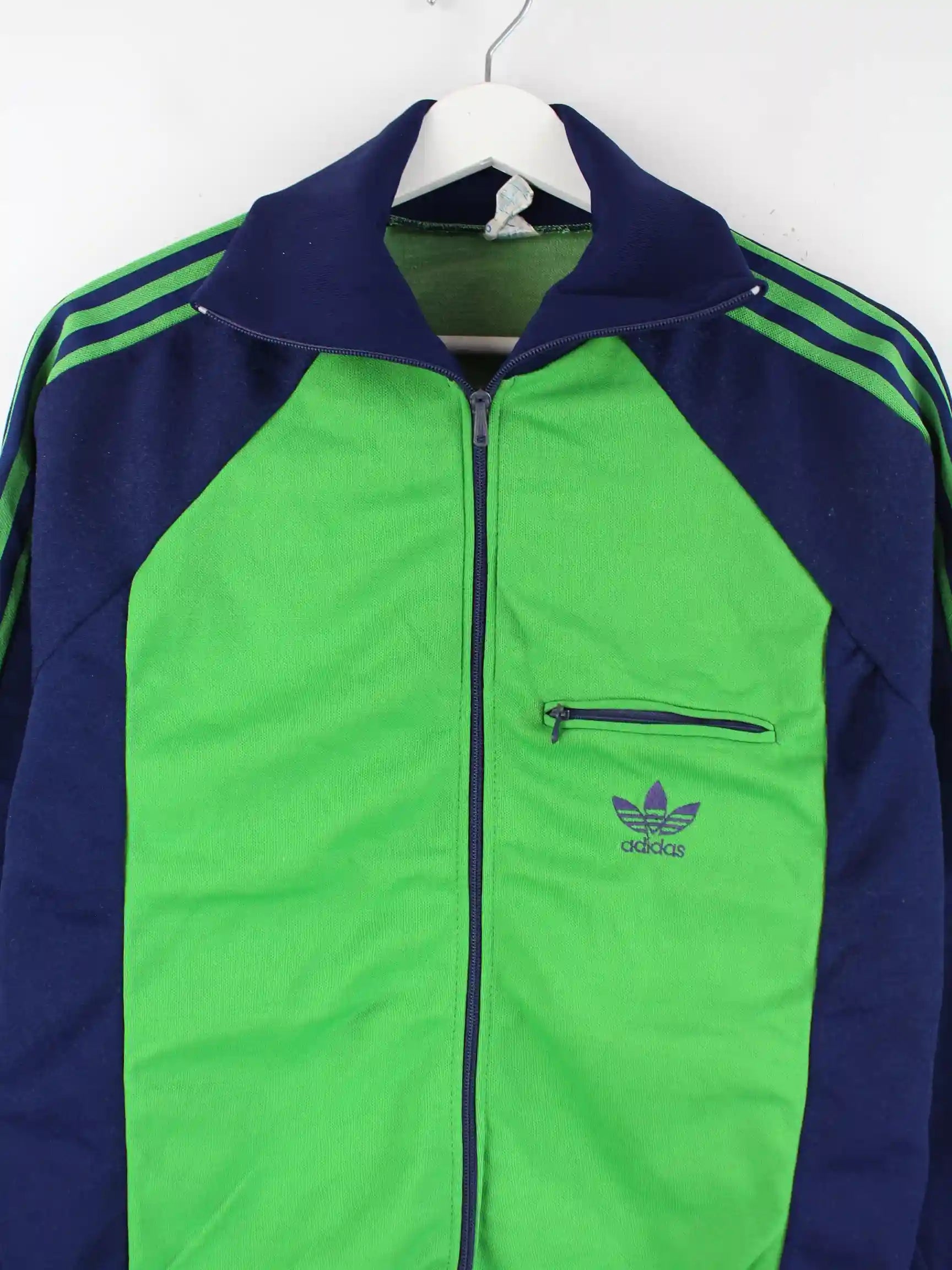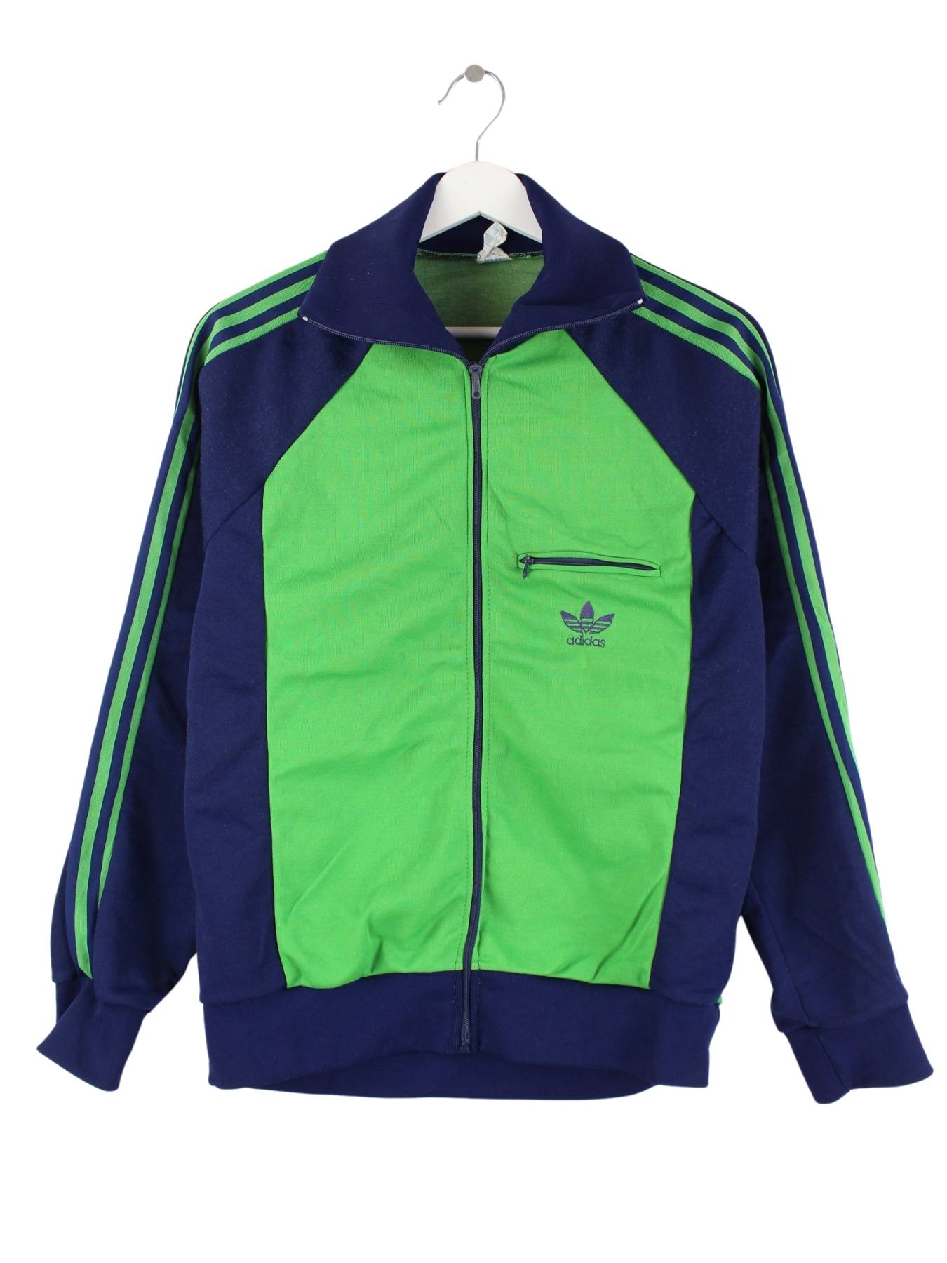 Grüne Trainingsjacke des Labels Adidas aus den 80'ern in Größe S. Sie ist aus Synthetik gefertigt und in sehr gutem Zustand im Angebot.