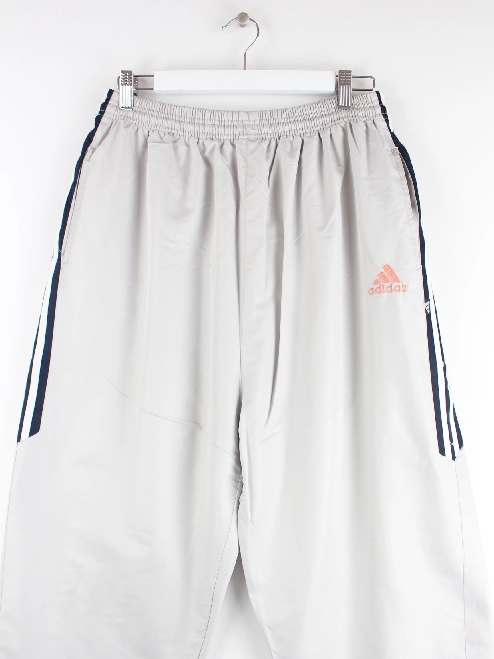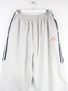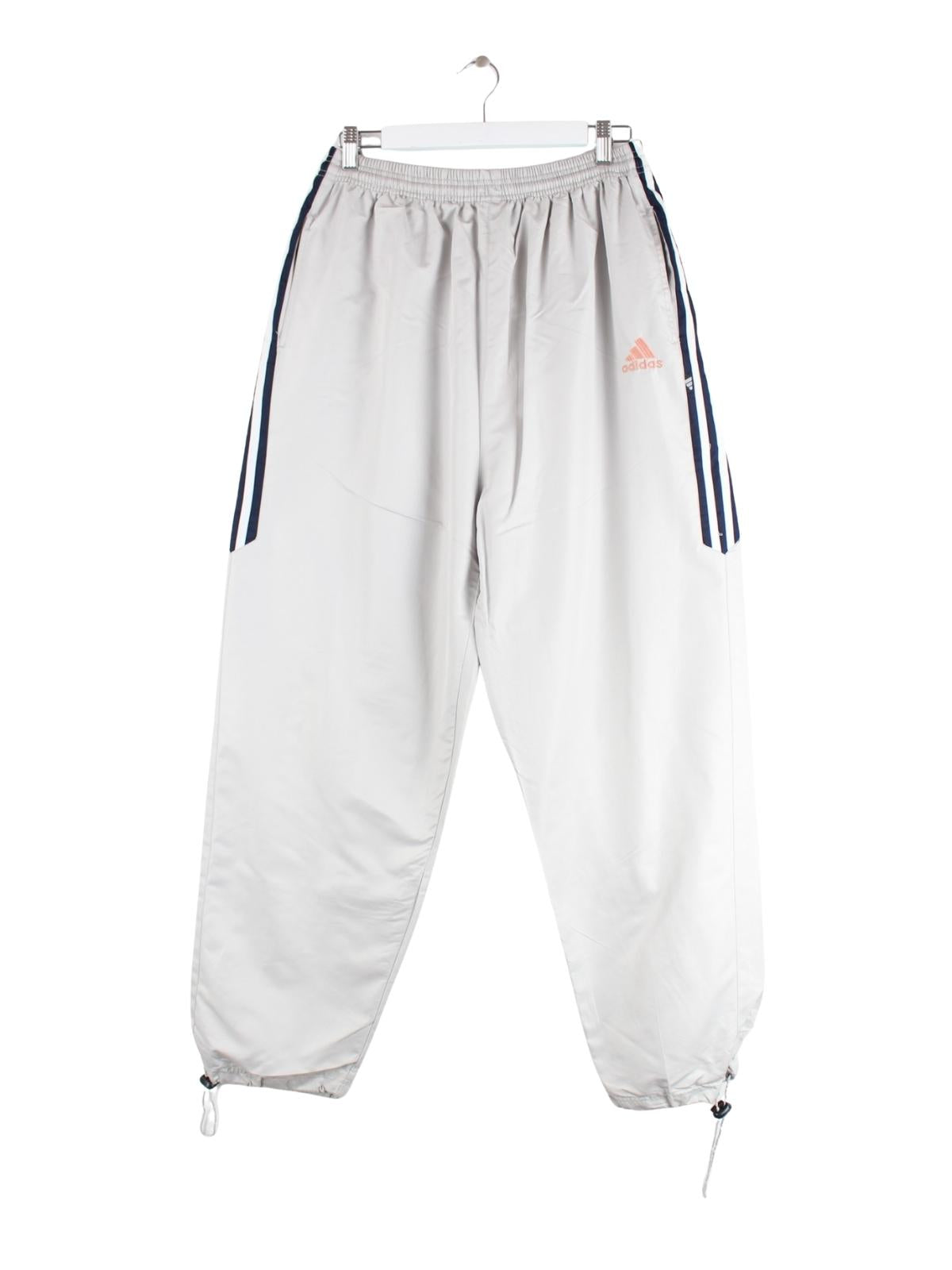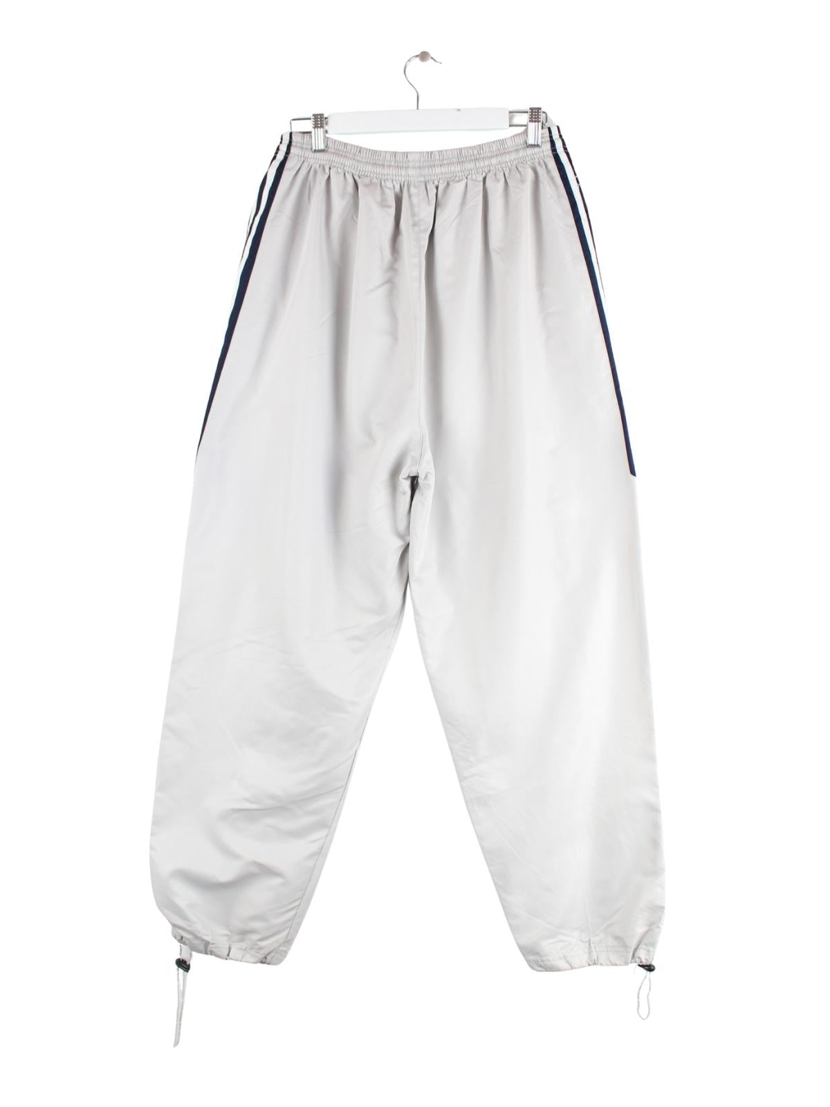 Graue Track Pants aus dem Hause Adidas aus den 90'ern in Größe XL. Sie sind aus Synthetik gefertigt und in sehr gutem Zustand zu haben.