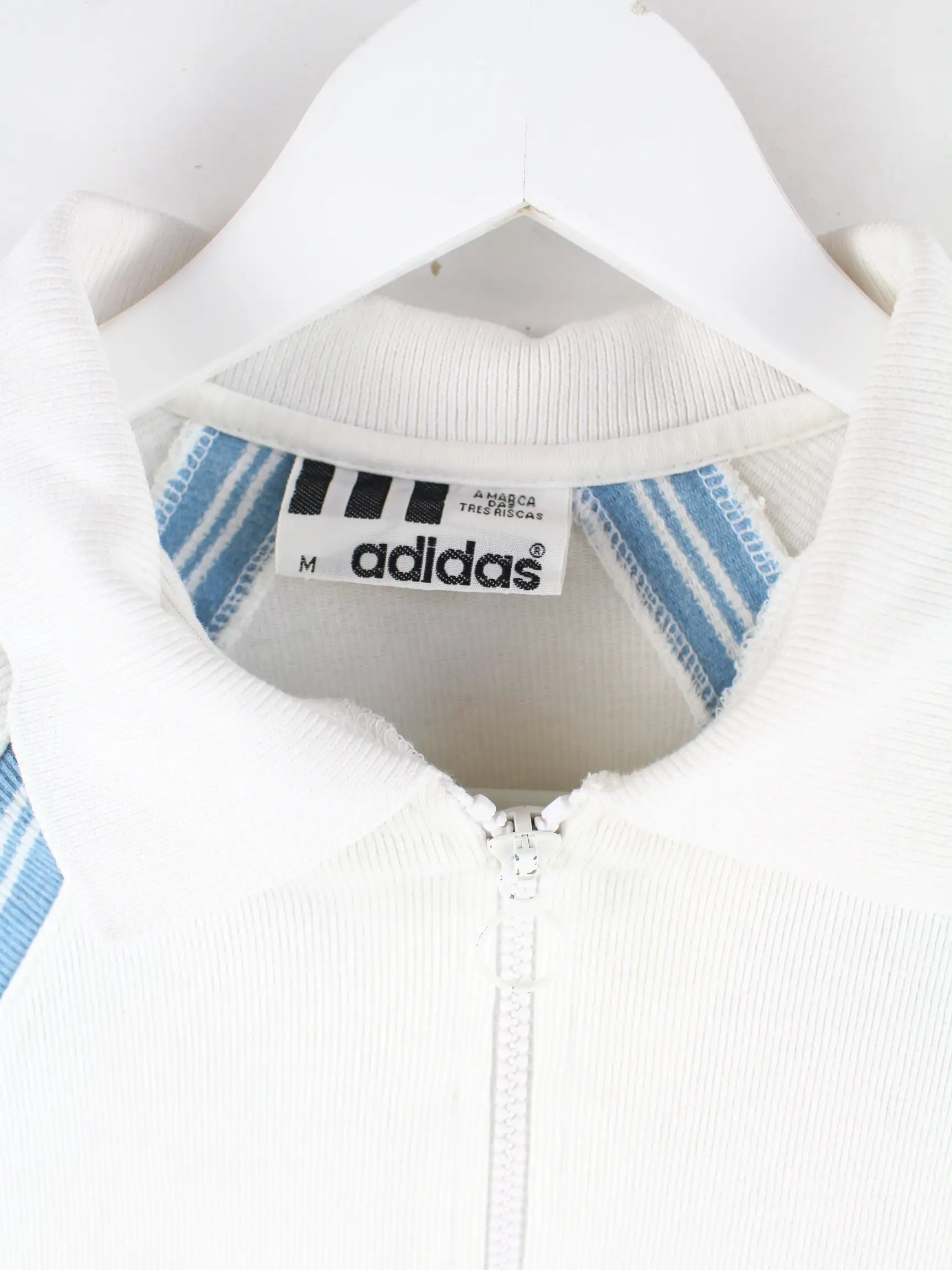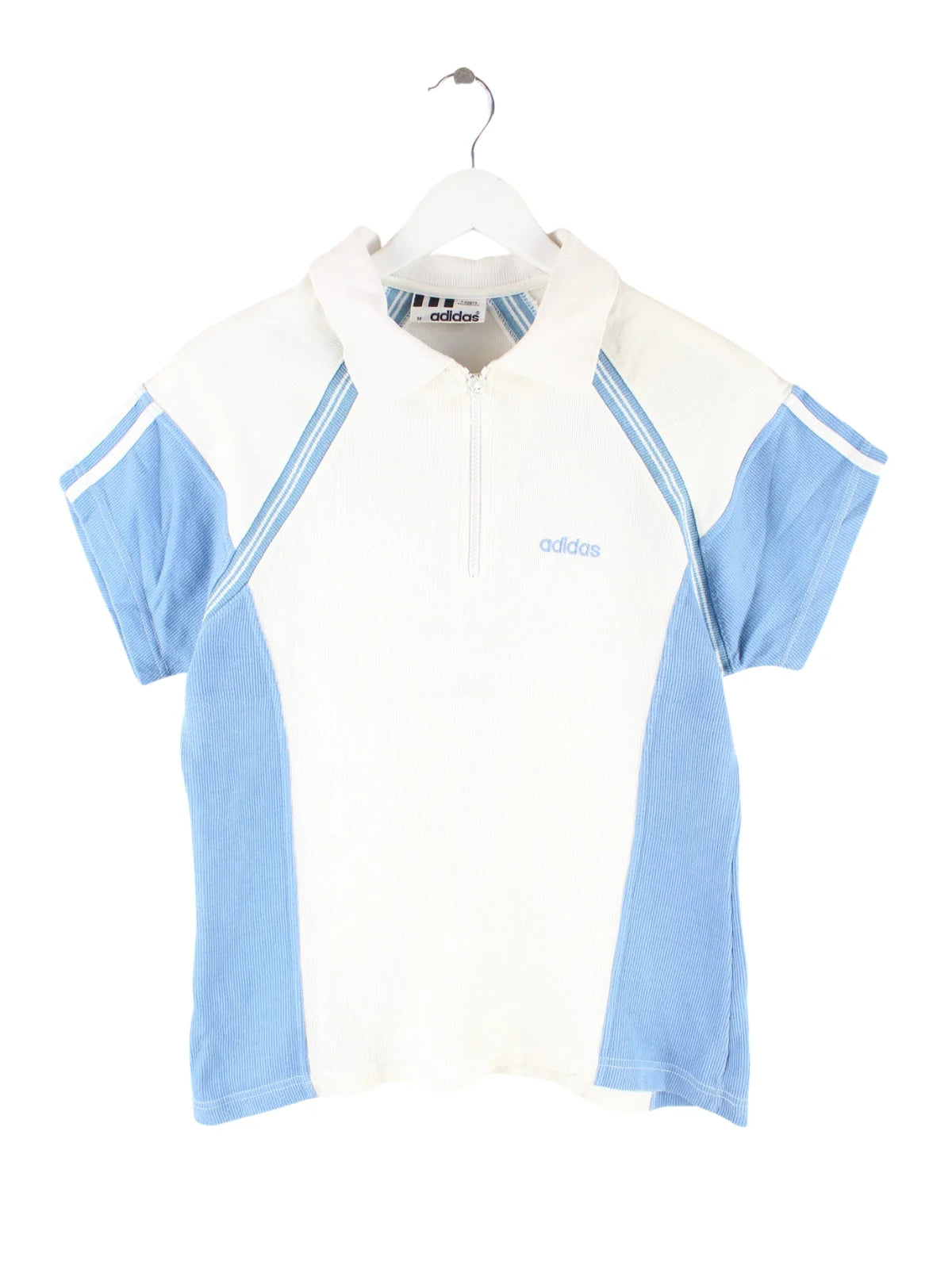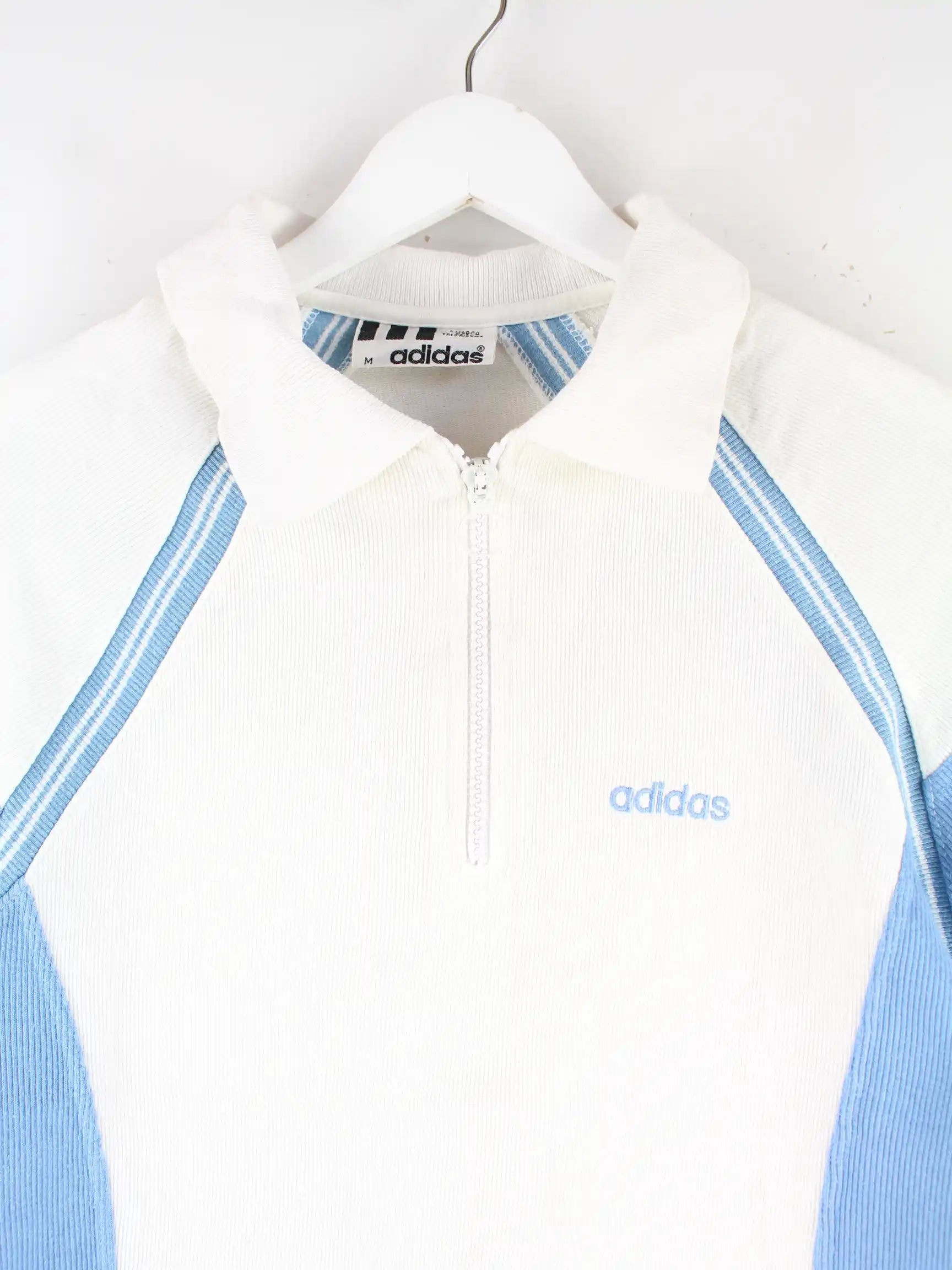 Poloshirt des Labels Adidas mit half Zip in Größe M aus den 80'ern. Es ist aus Baumwolle produziert und in Weiß vorrätig.