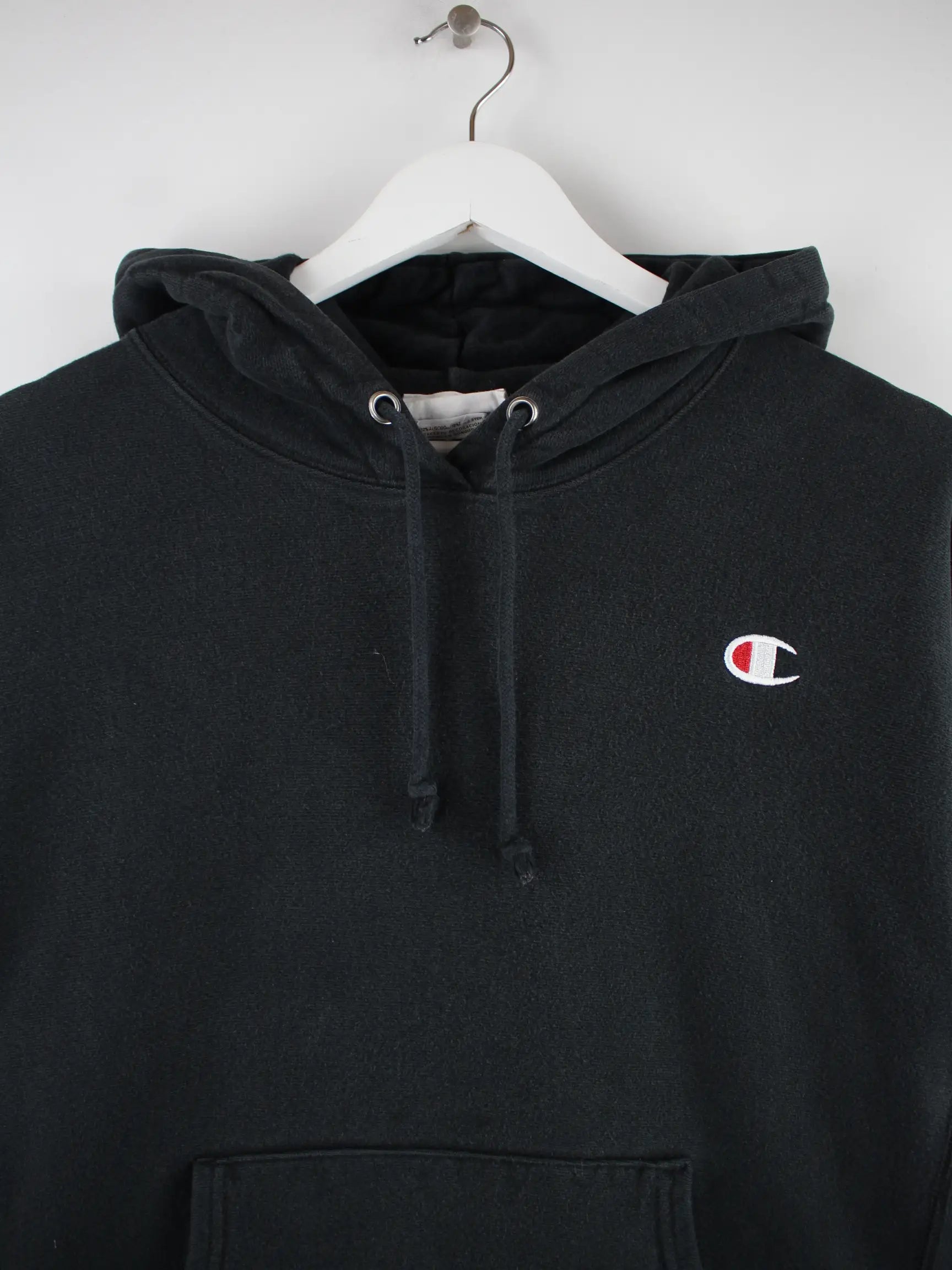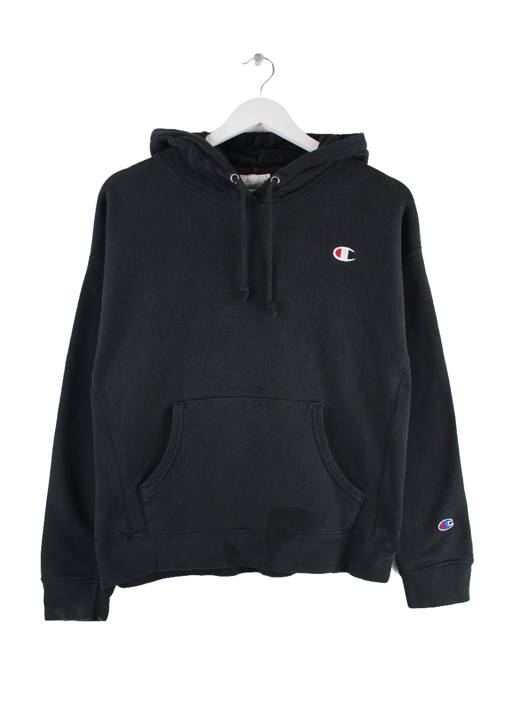Hoodie von Champion in Größe L. Er ist aus einer Baumwollmischung produziert und in Schwarz vorrätig.