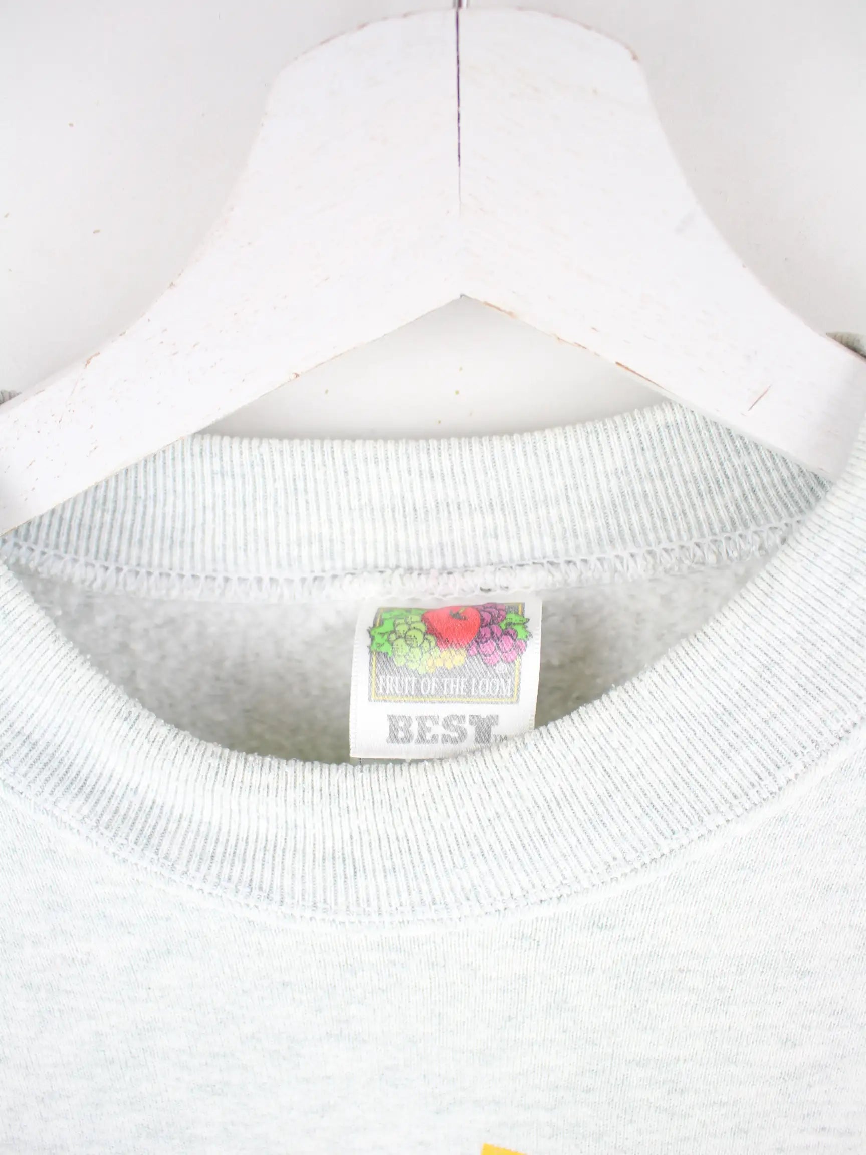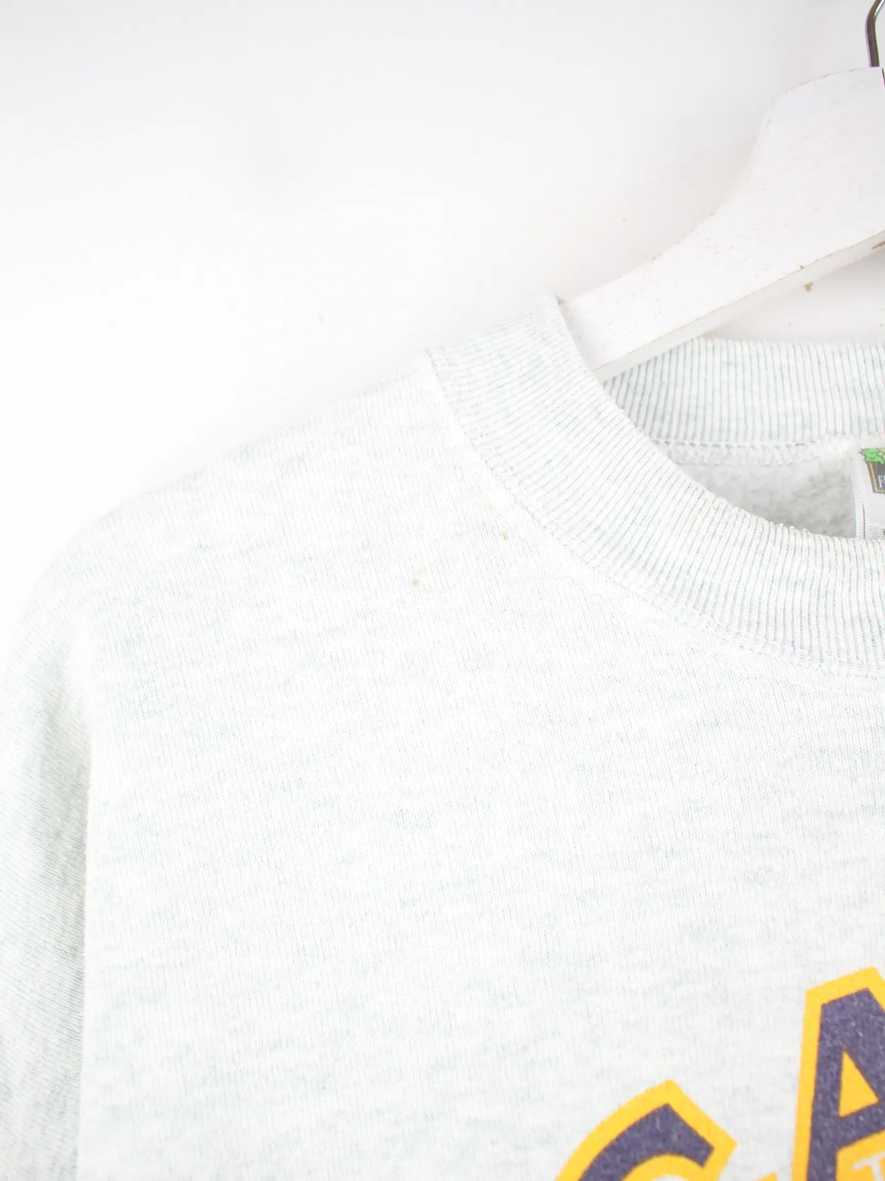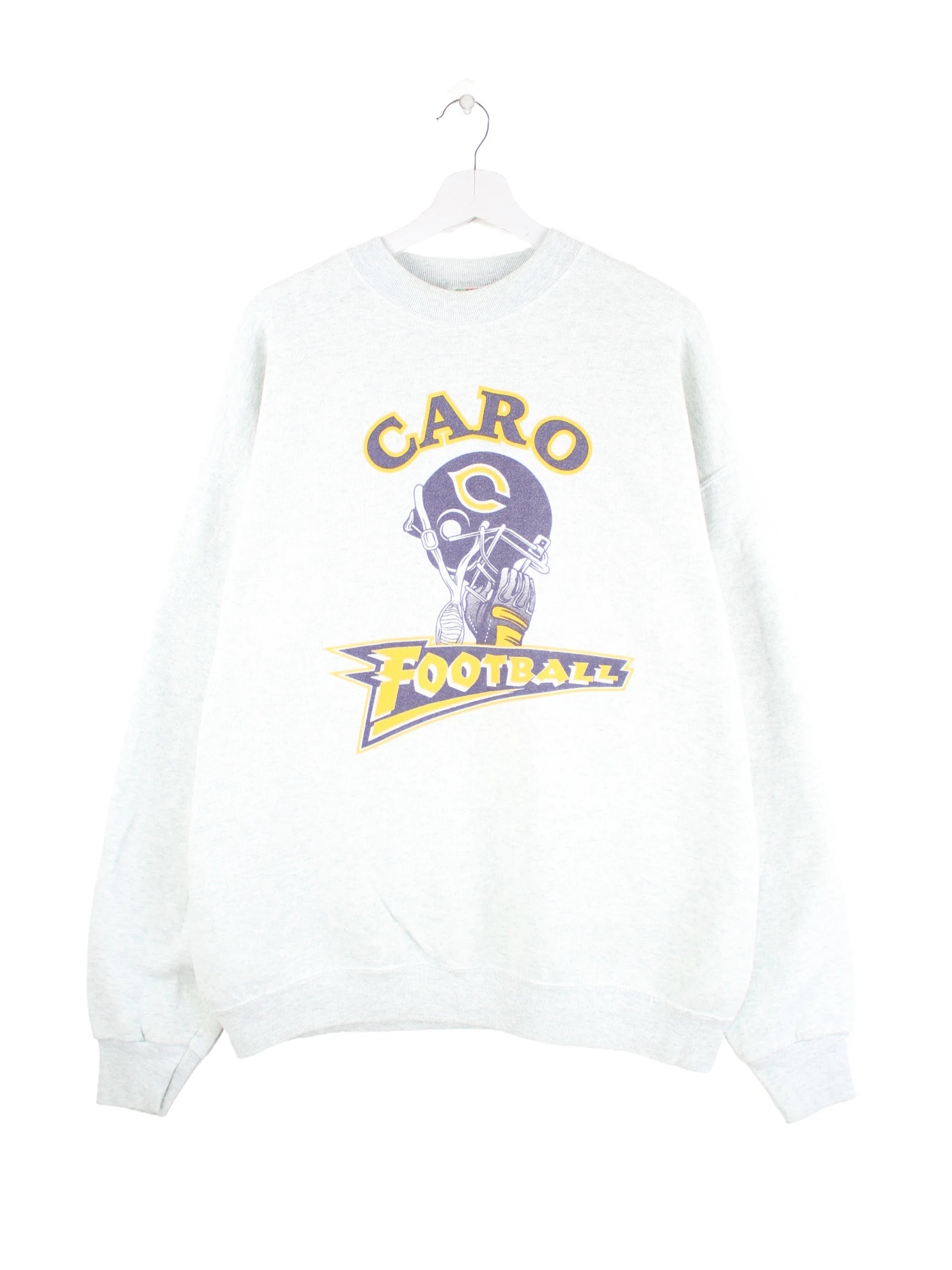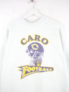 Sweater der Marke Fruit of the Loom in Größe XL aus den 90'ern. Er ist aus einer Baumwollmischung angefertigt und in Grau zu haben. Mit schickem Football Print.
