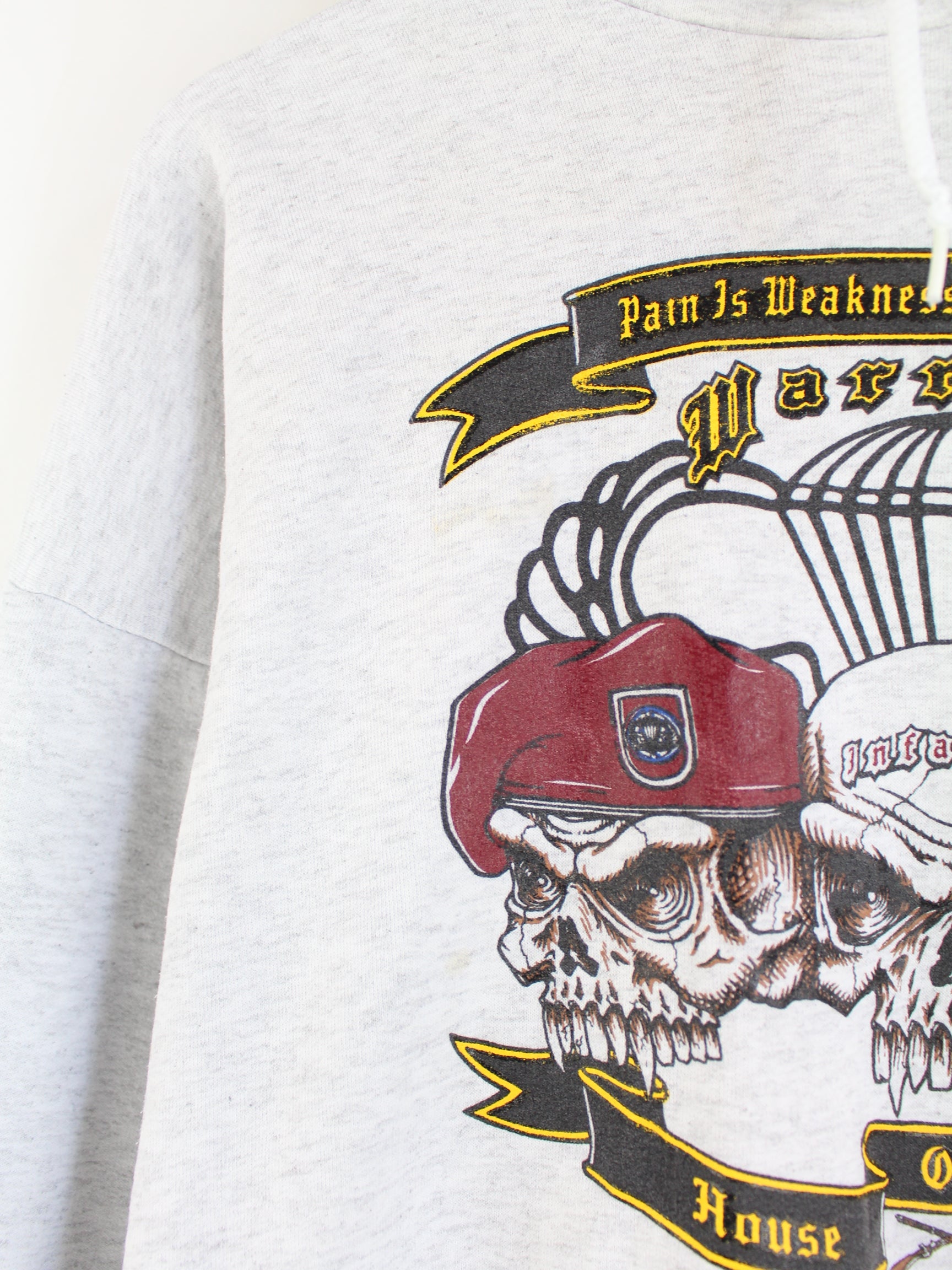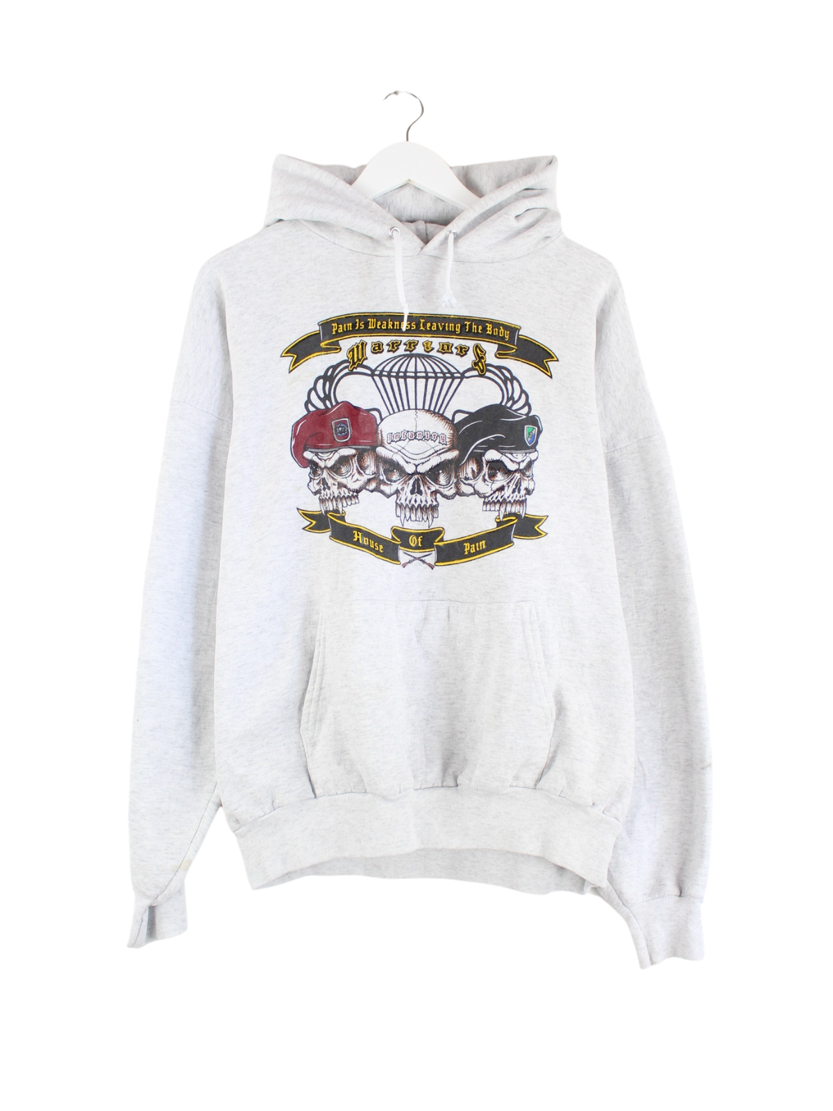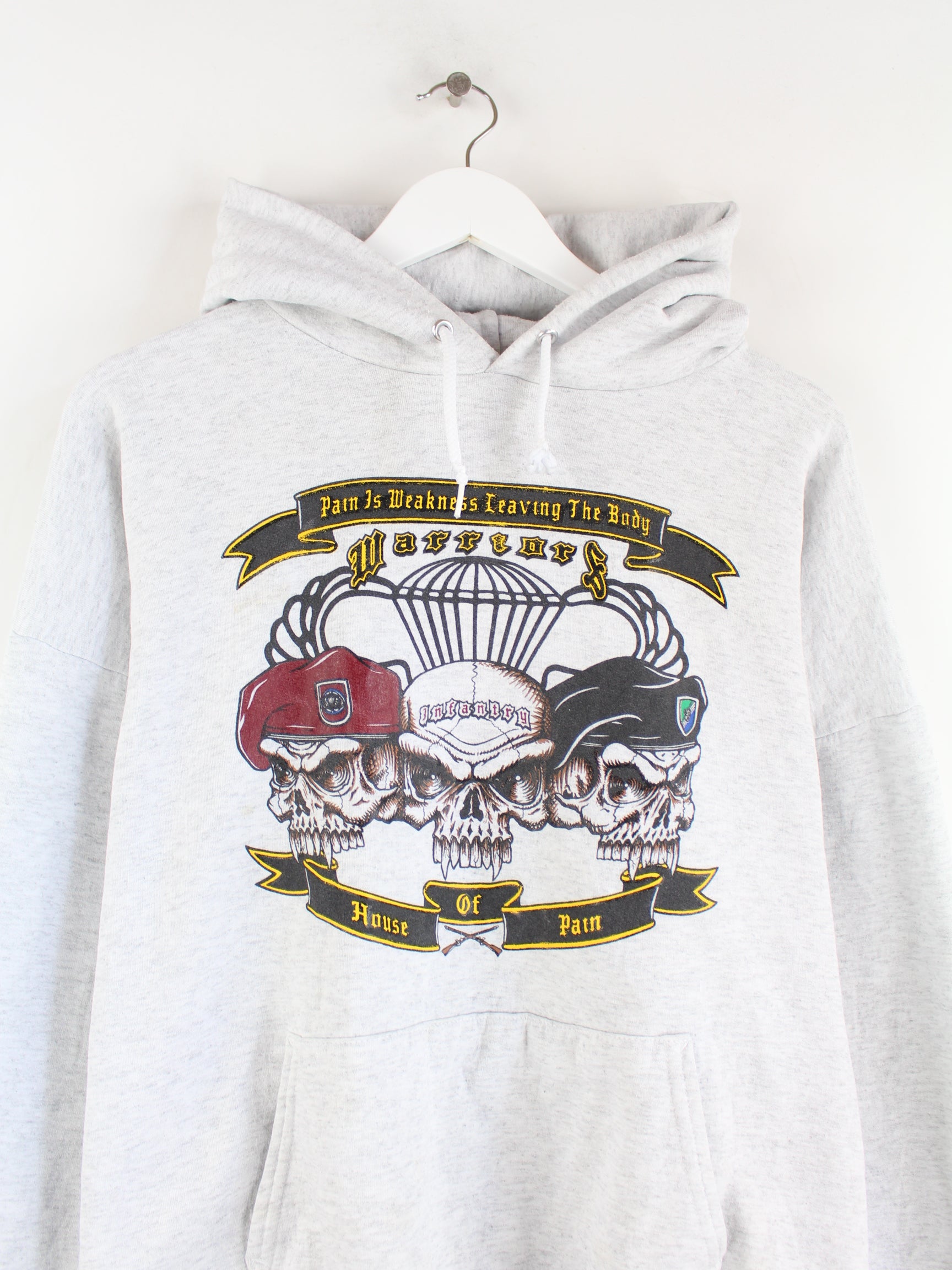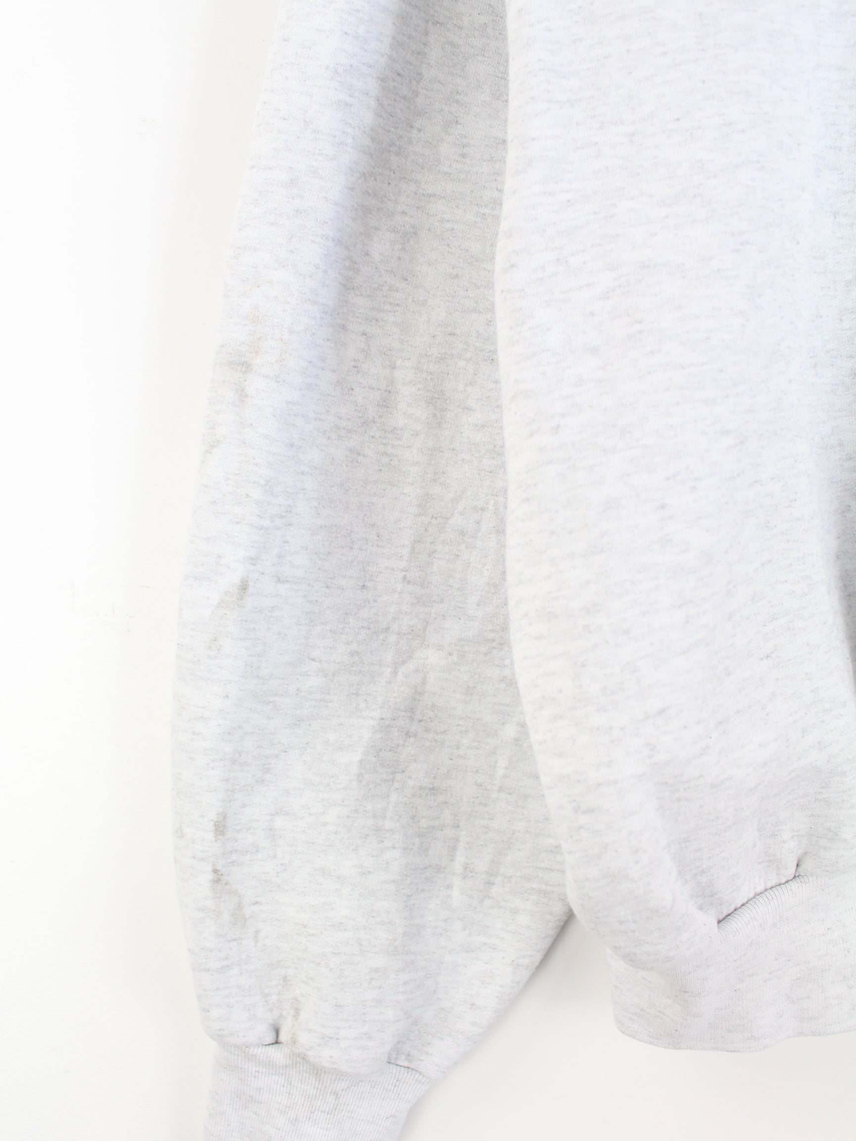Grauer Hoodie der Marke Hanes in Größe M. Er ist aus einer Baumwollmischung hergestellt und in gutem Zustand zu haben. Mit seltenem Vintage Print.