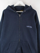 Hoodie vom Label Lee mit Zip in Größe L aus den 90'ern. Er ist aus einer Baumwollmischung angefertigt und in Blau vorrätig. Mit chiquem Vintage Print.
