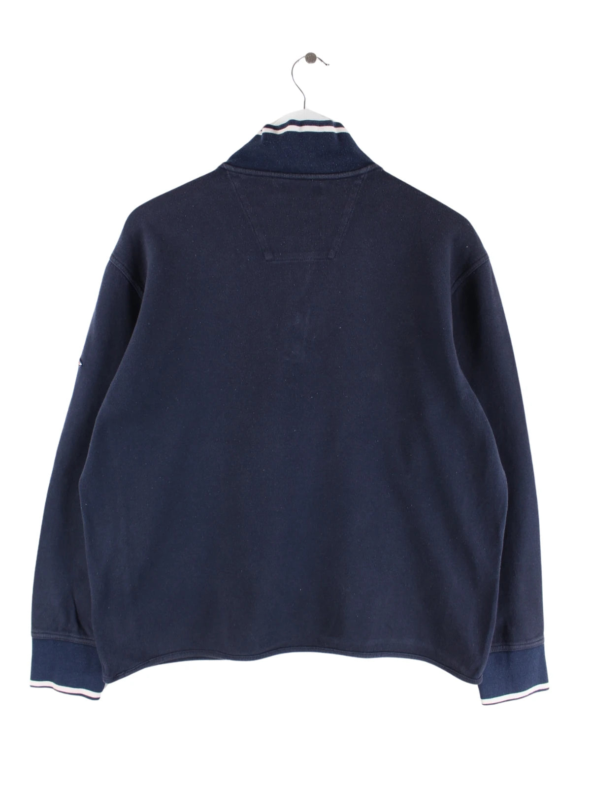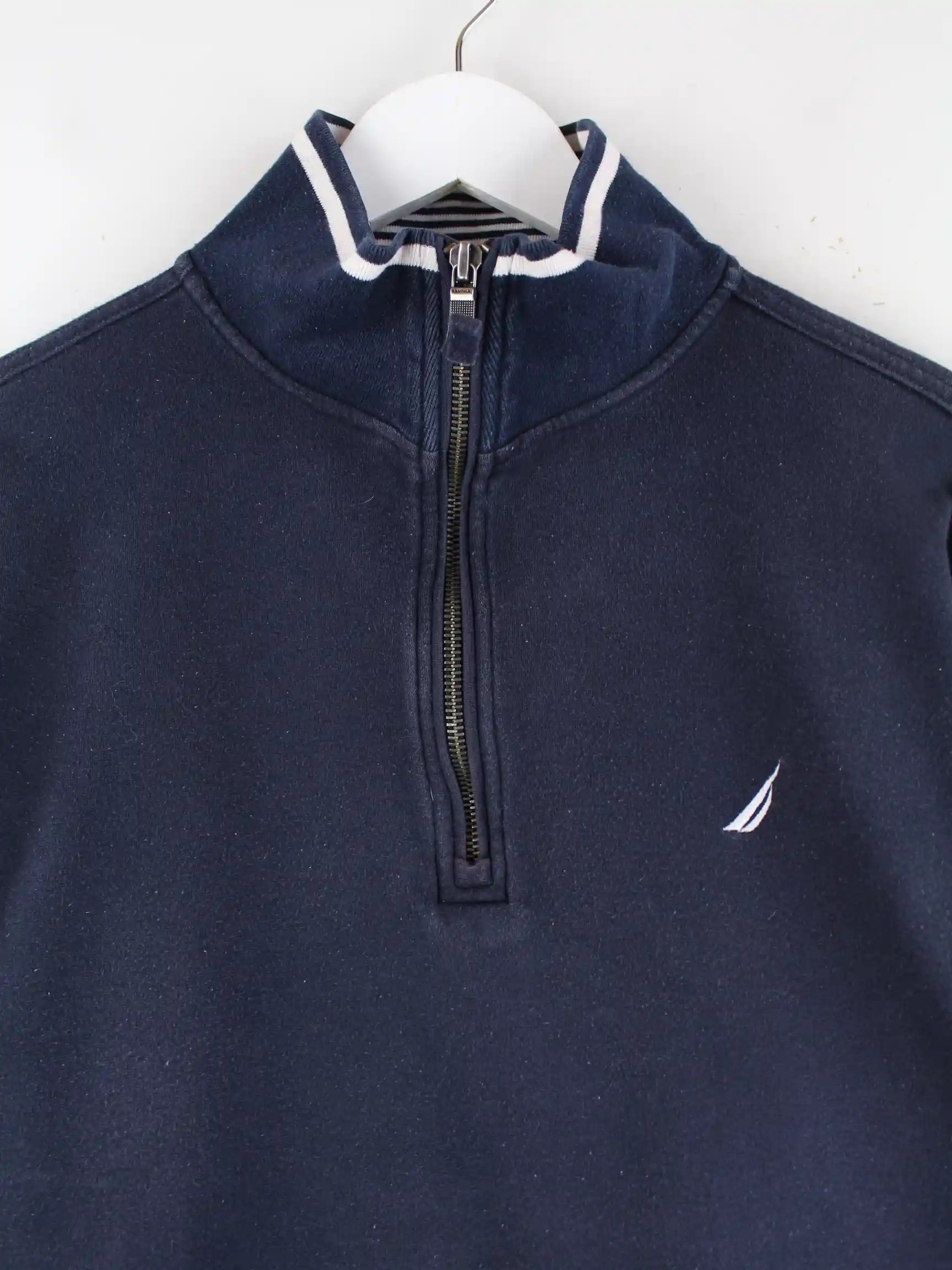 Sweater der Marke Nautica mit halbem Reißverschluß in Größe M. Er ist aus einer Baumwollmischung produziert und in Blau bei uns vorrätig.