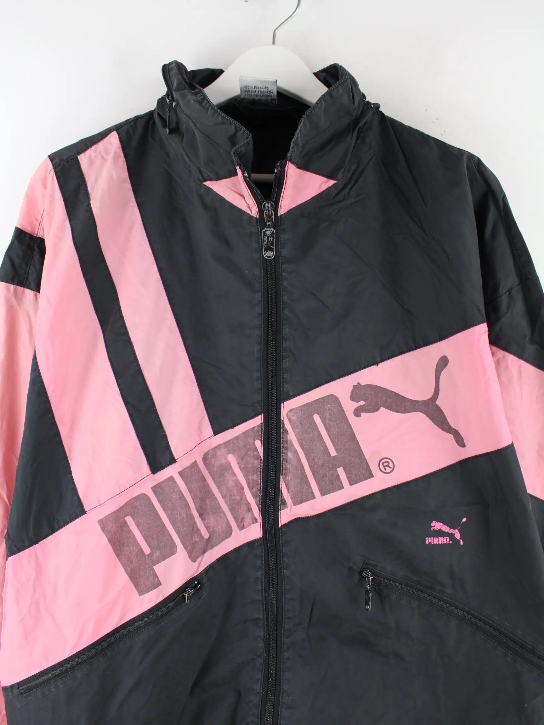 Schwarze Leichte Jacke von Puma aus den 80'ern in Größe L. Sie ist aus Synthetik gemacht. Den Zustand würden wir als 'In Ordnung' bezeichnen (vergl. Bilder).Mit tollem Vintage Print.