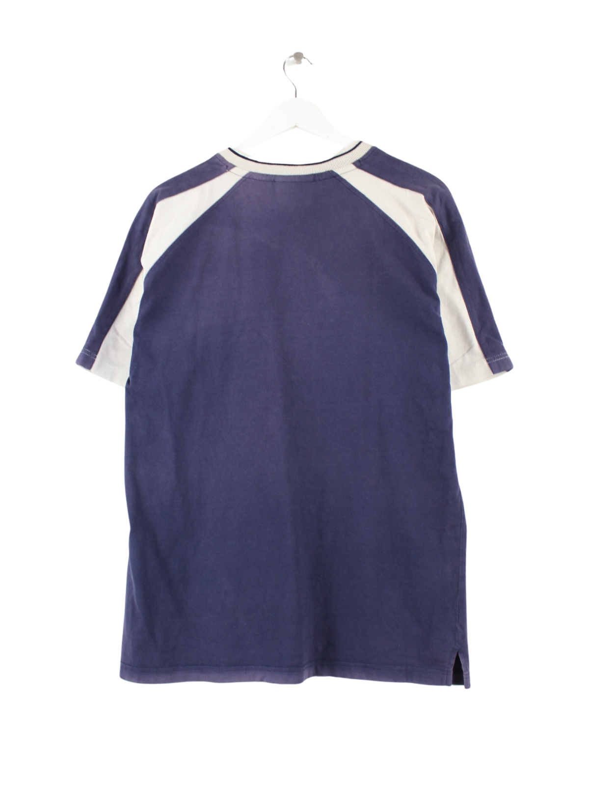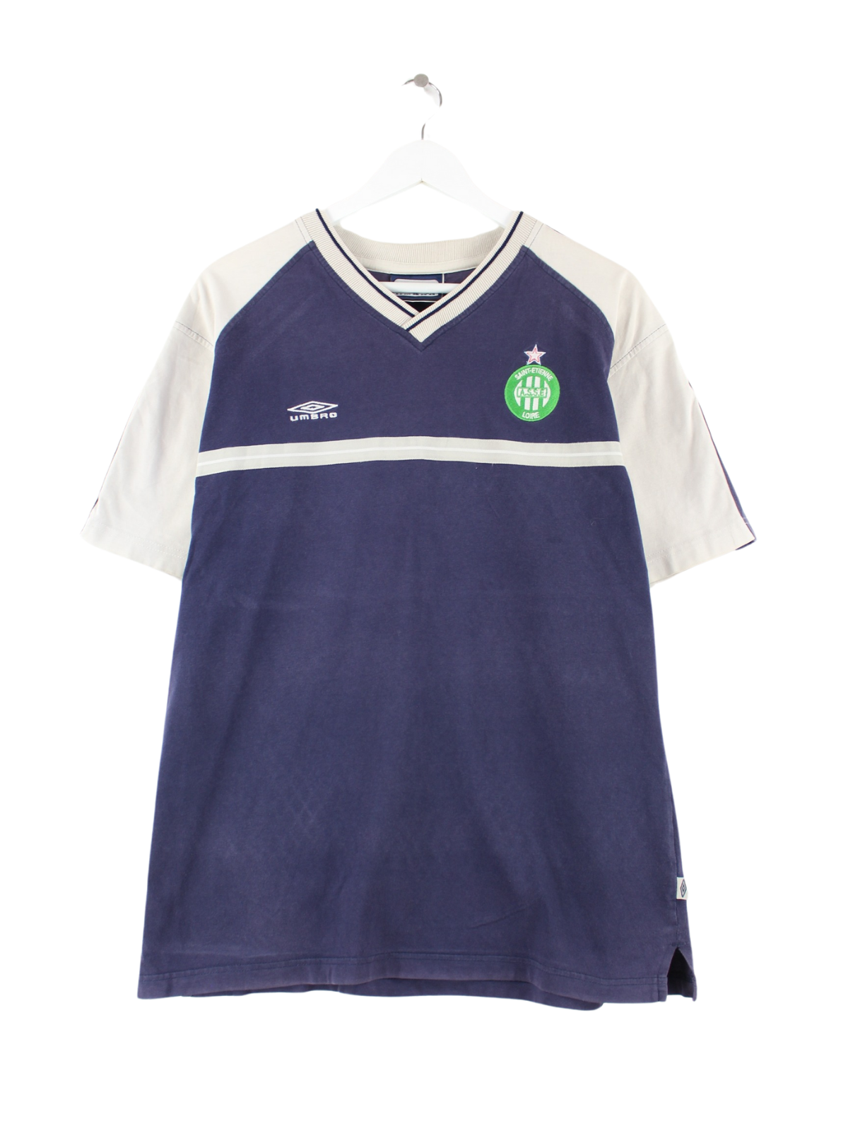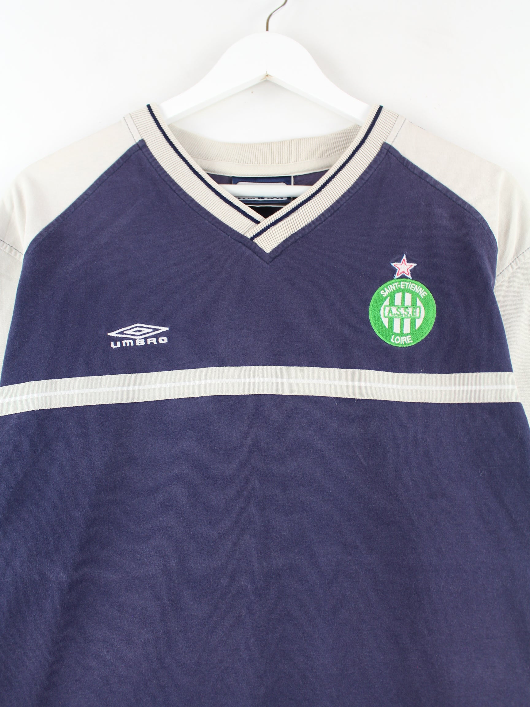 Blaues T-Shirt mit gesticktem Logo von Umbro aus den 90'ern in Größe M. Es ist aus Baumwolle hergestellt und in gutem Zustand bei uns vorrätig.