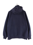 Vintage Hoodie mit Stickereien in Größe XL. Er ist aus einer Baumwollmischung produziert und in Blau in Stock.