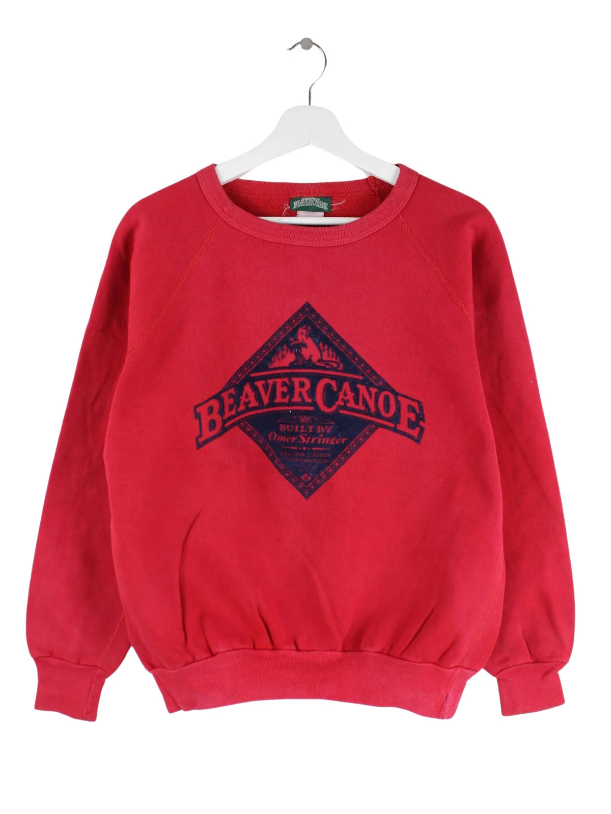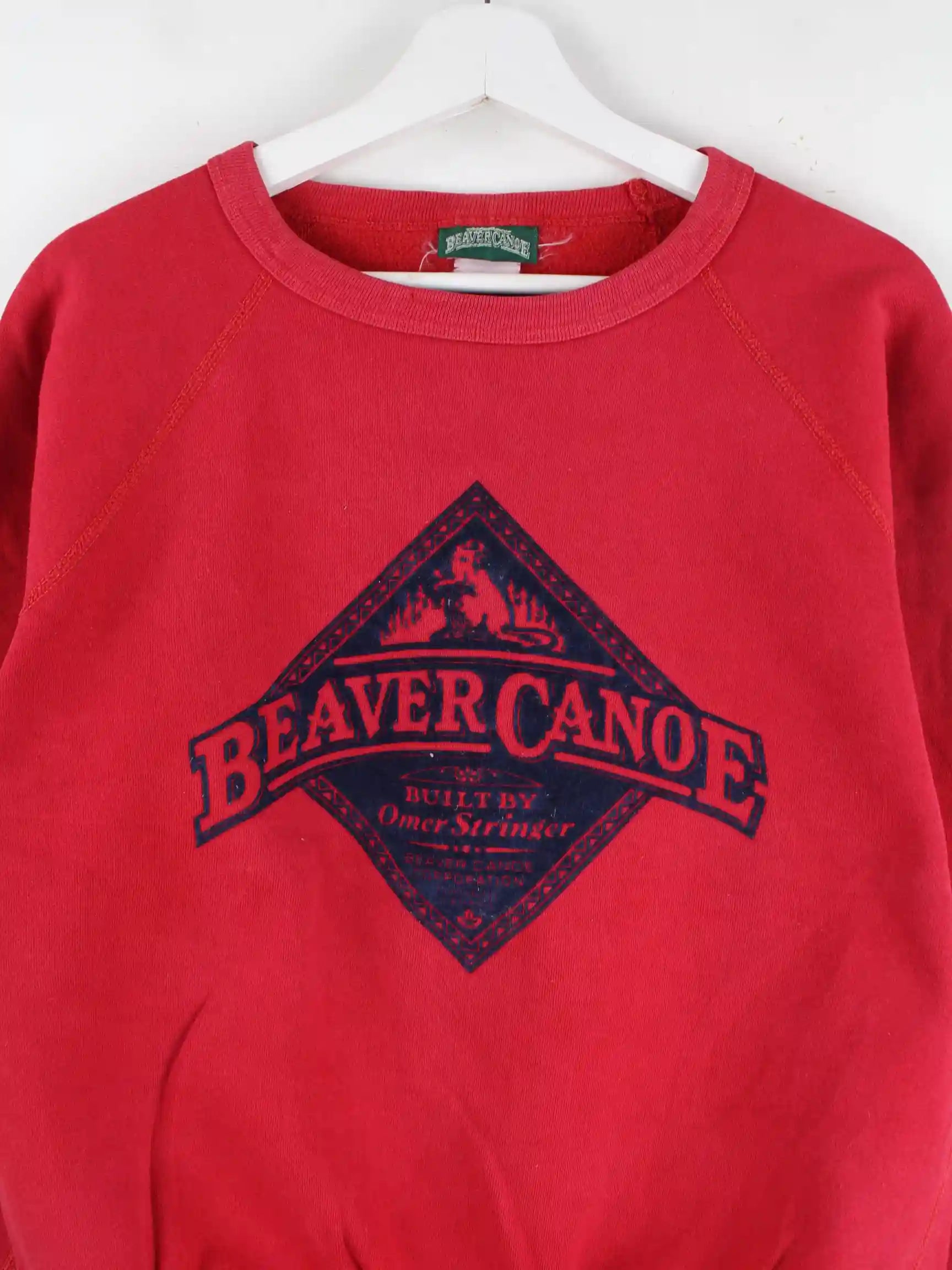 Roter Vintage Sweater aus den 90'ern in Größe XS. Er ist aus einer Baumwollmischung und in gutem Zustand auf Lager. Mit seltenem Canoe Print.