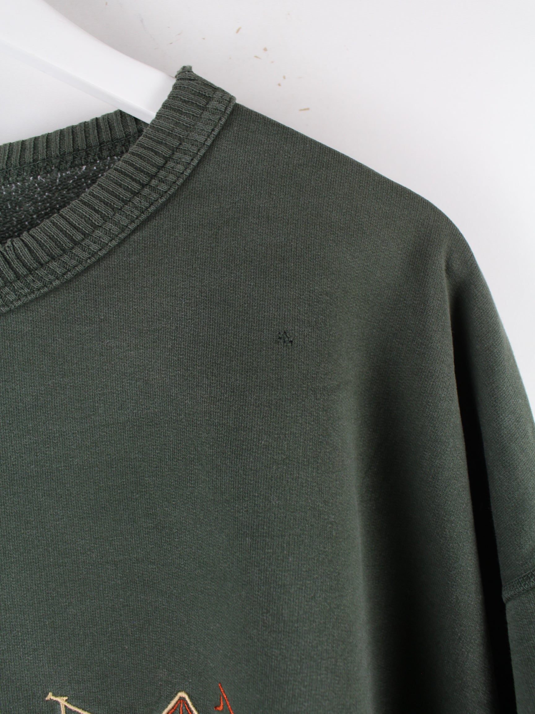 Grüner Vintage Sweater mit Stick aus den 90'ern in Größe XXL. Er ist aus einer Baumwollmischung gefertigt. Den Zustand würden wir als 'In Ordnung' bezeichnen (vergl. Bilder).