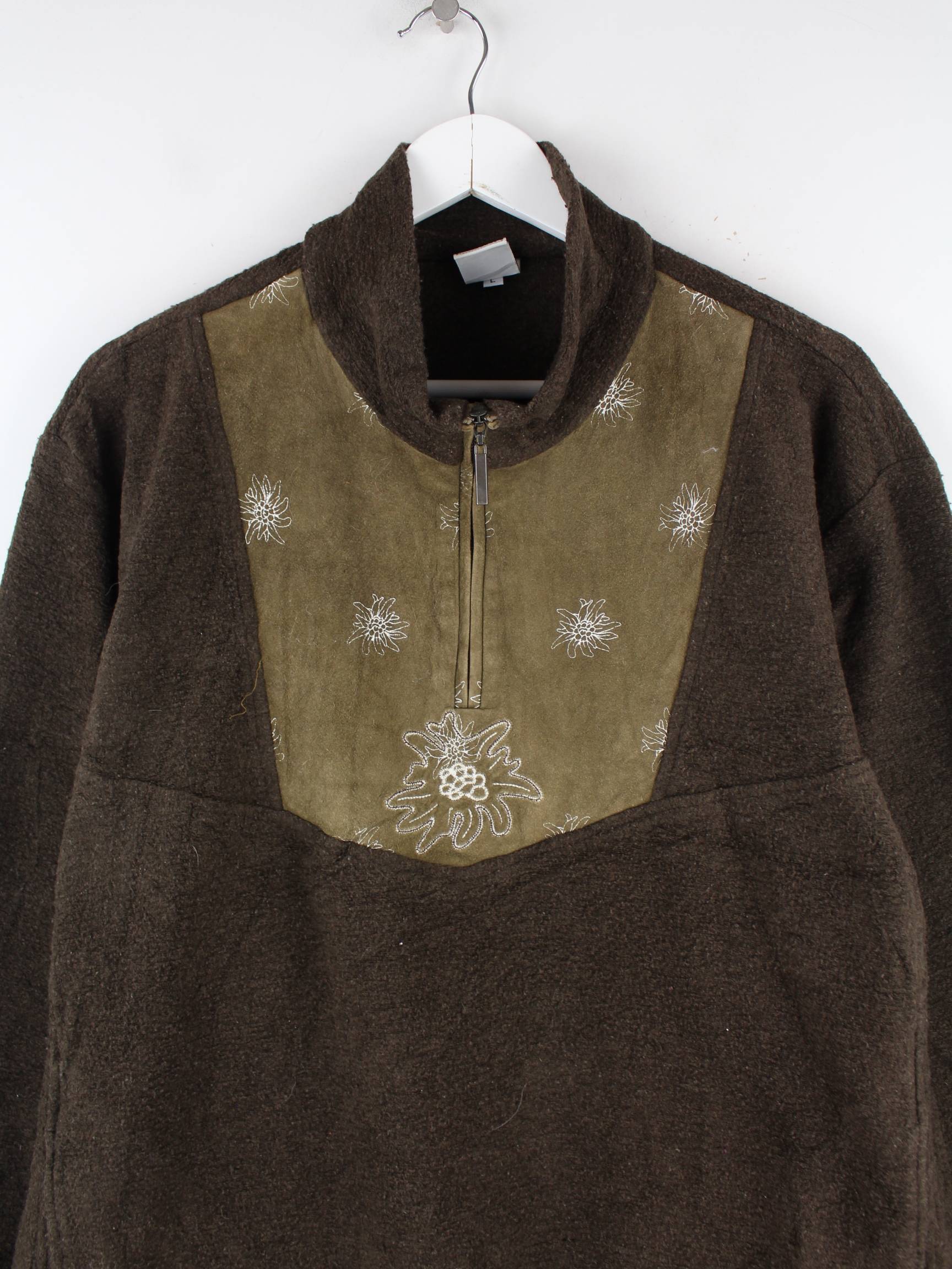 Vintage Sweater mit kurzem Reißverschluß in Größe L aus den 90'ern. Er ist aus behaglichem Fleece angefertigt und in Braun auf Lager.