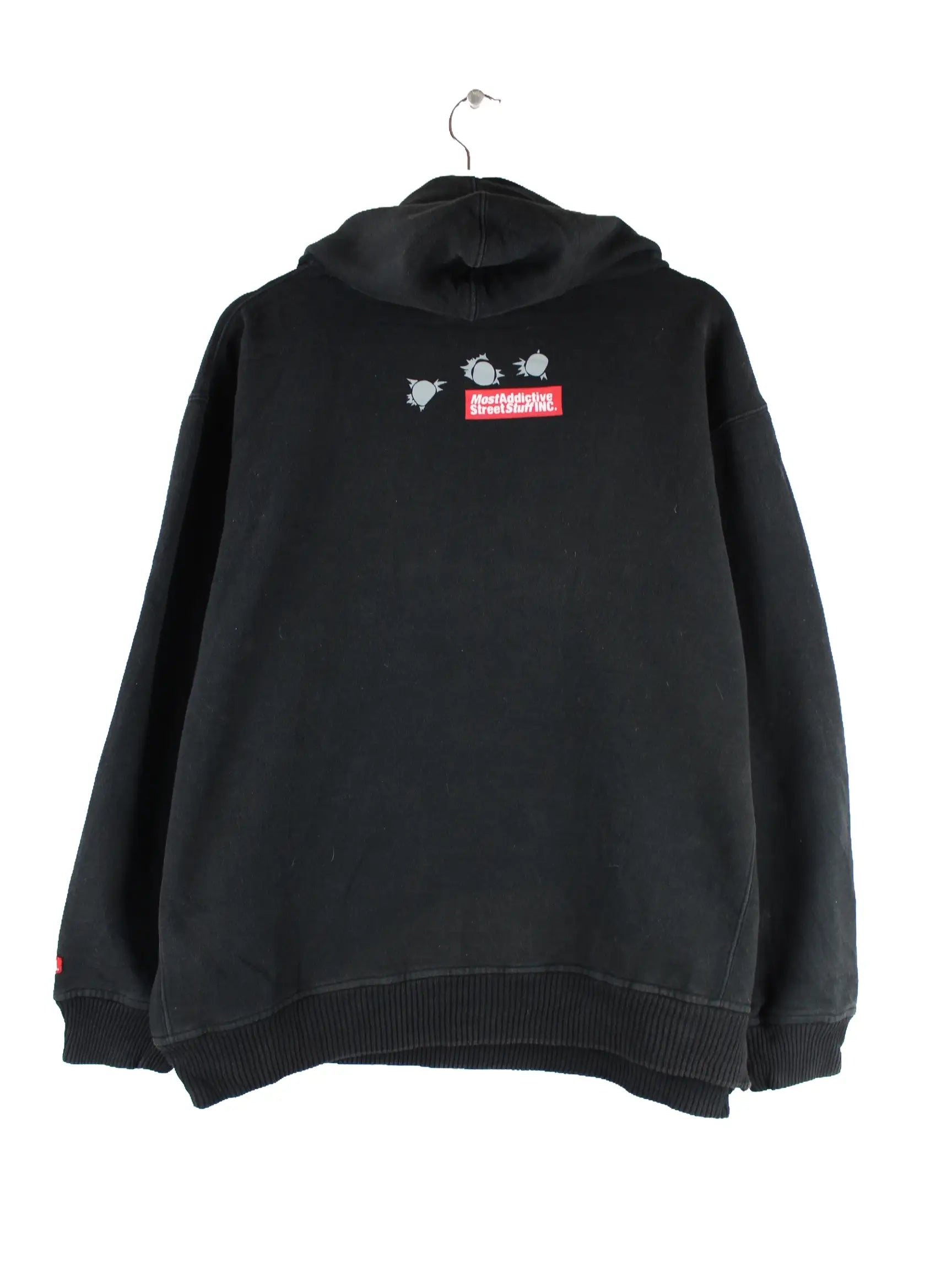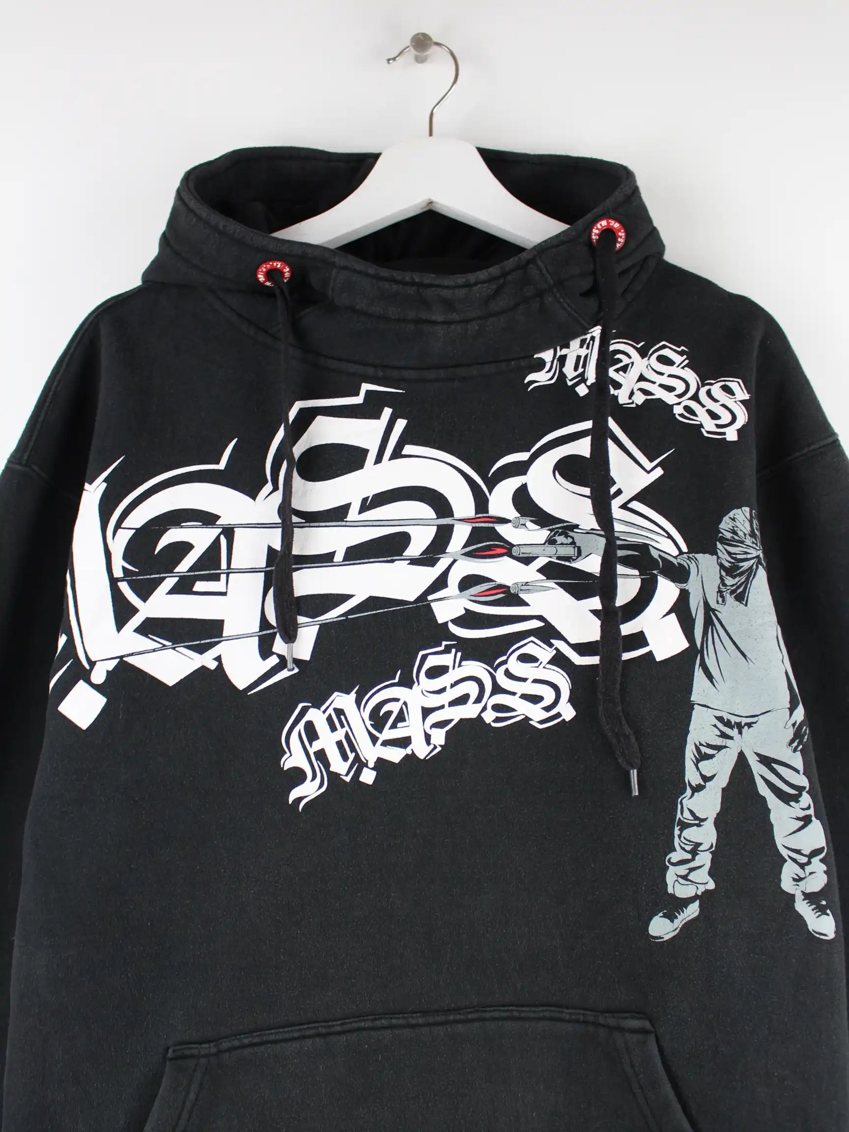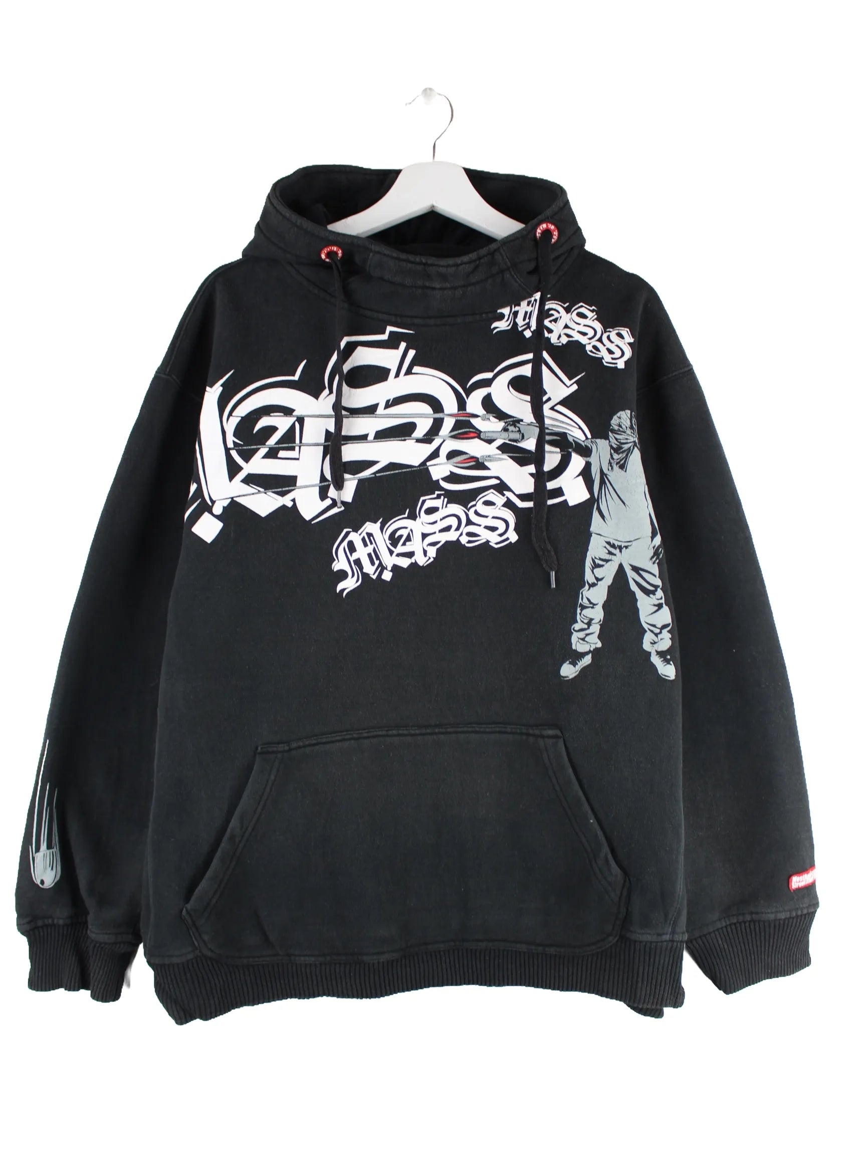 Vintage Hoodie in Größe L aus Anfang der 2000'er. Er ist aus einer Baumwollmischung hergestellt und in Schwarz lieferbar. Mit seltenem Mass Print.