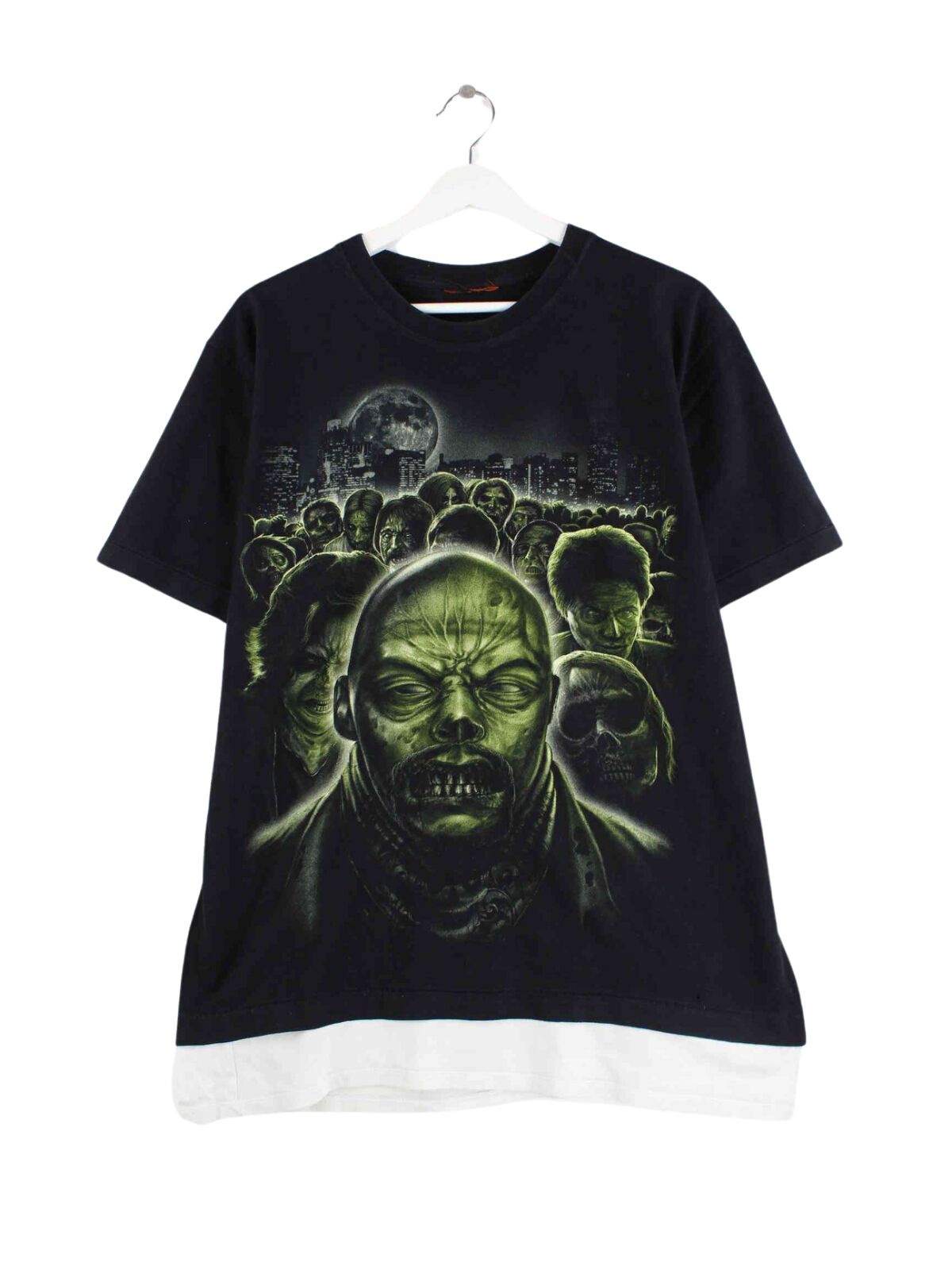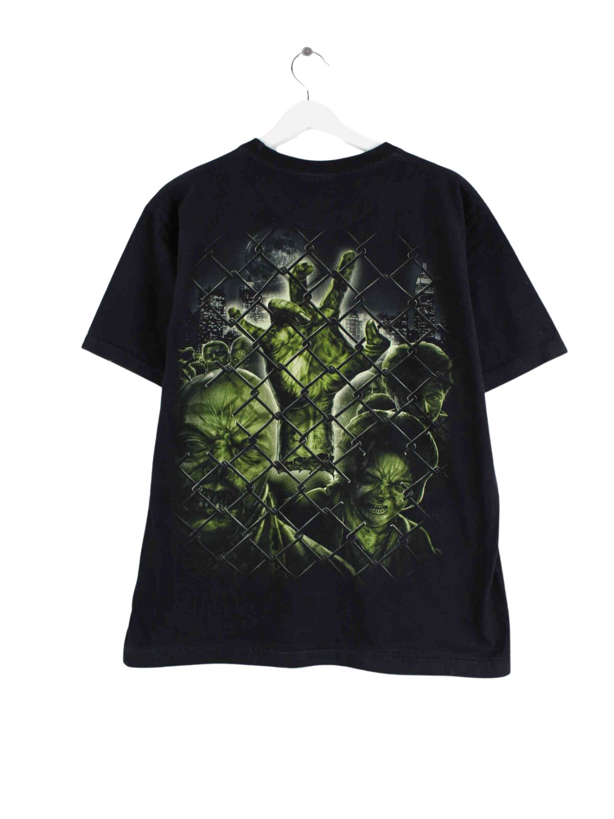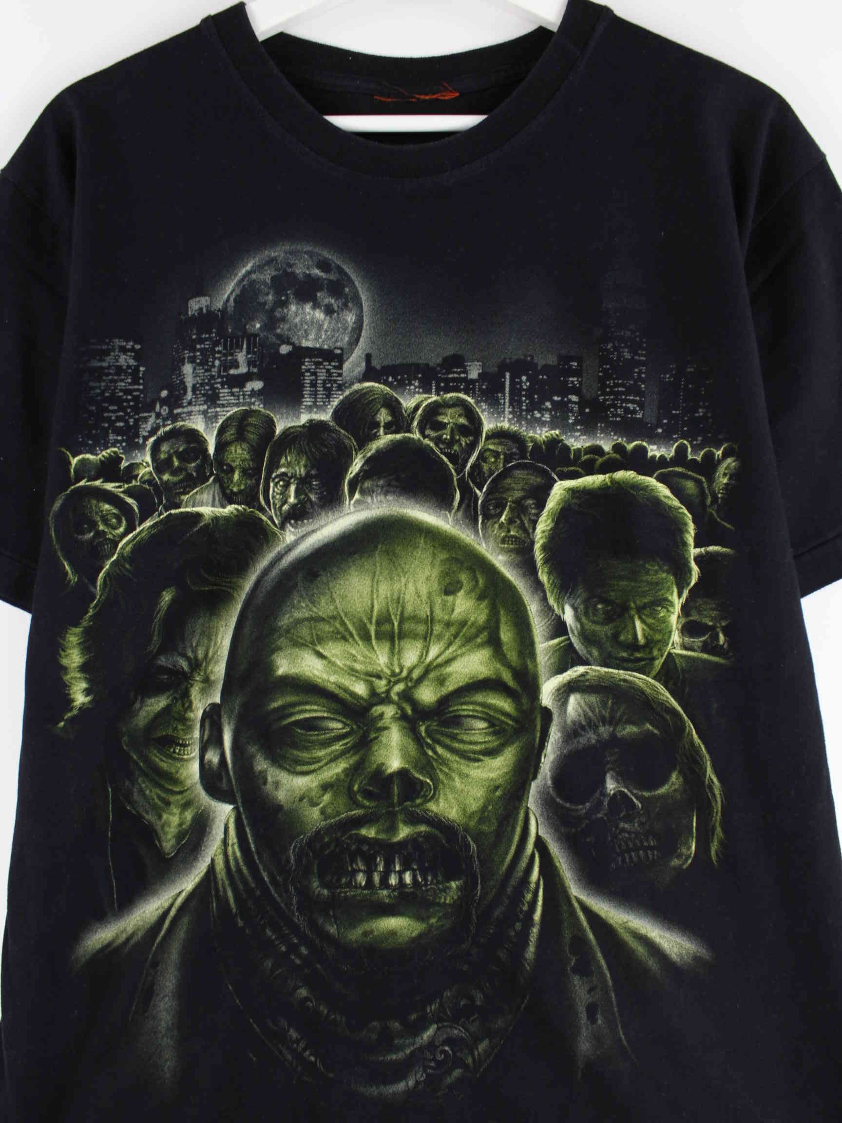 Schwarzes Vintage T-Shirt aus Anfang der 2000'er in Größe L. Es ist aus Baumwolle gefertigt und in sehr gutem Zustand vorrätig. Mit schickem Zombie Print.