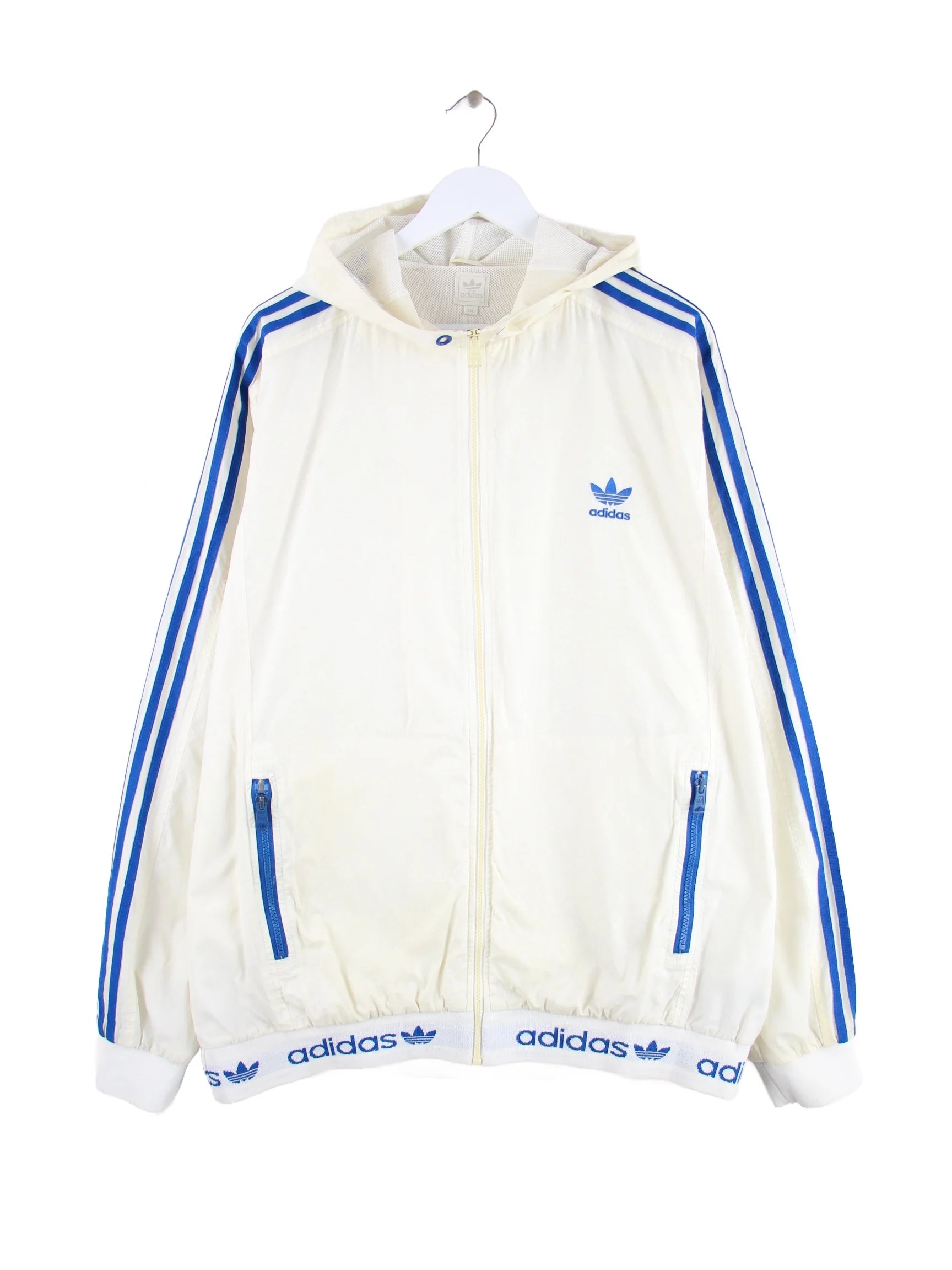 Leichte Jacke der Marke Adidas in Größe XXL. Sie ist aus Synthetik gefertigt und in Weiß bei uns vorrätig.