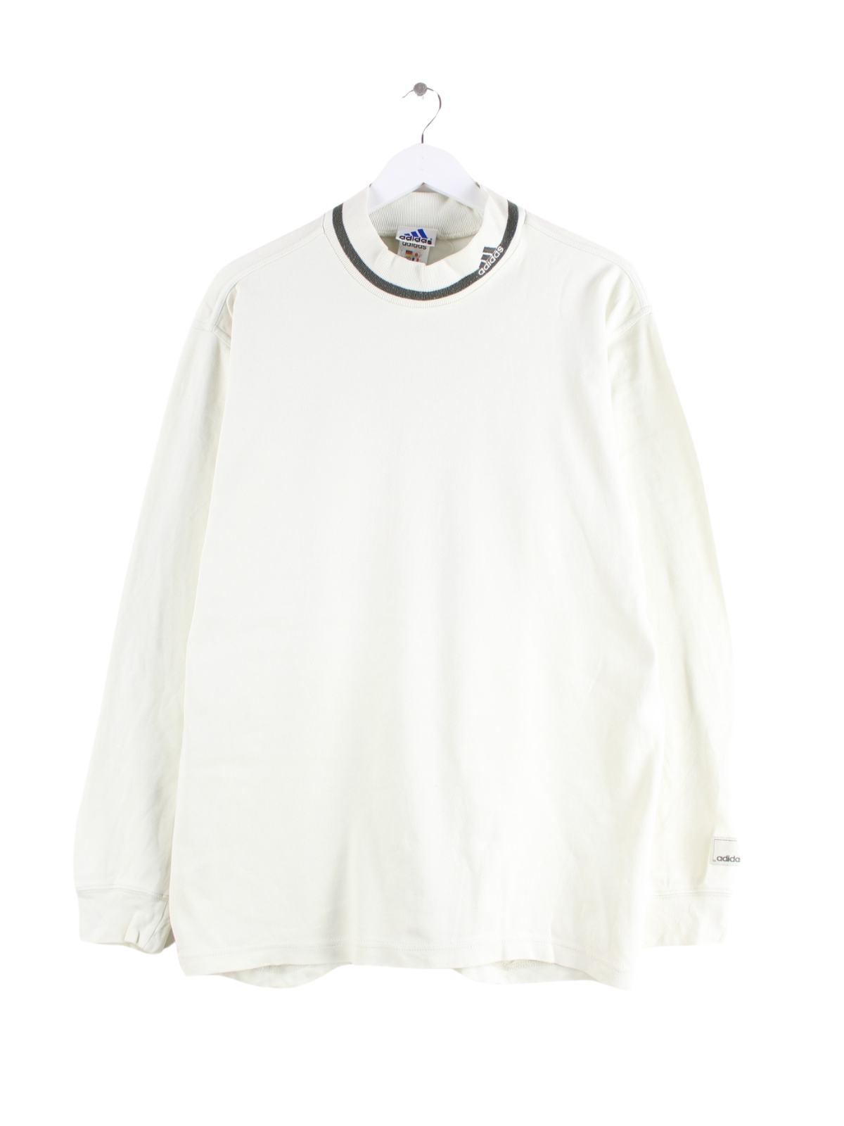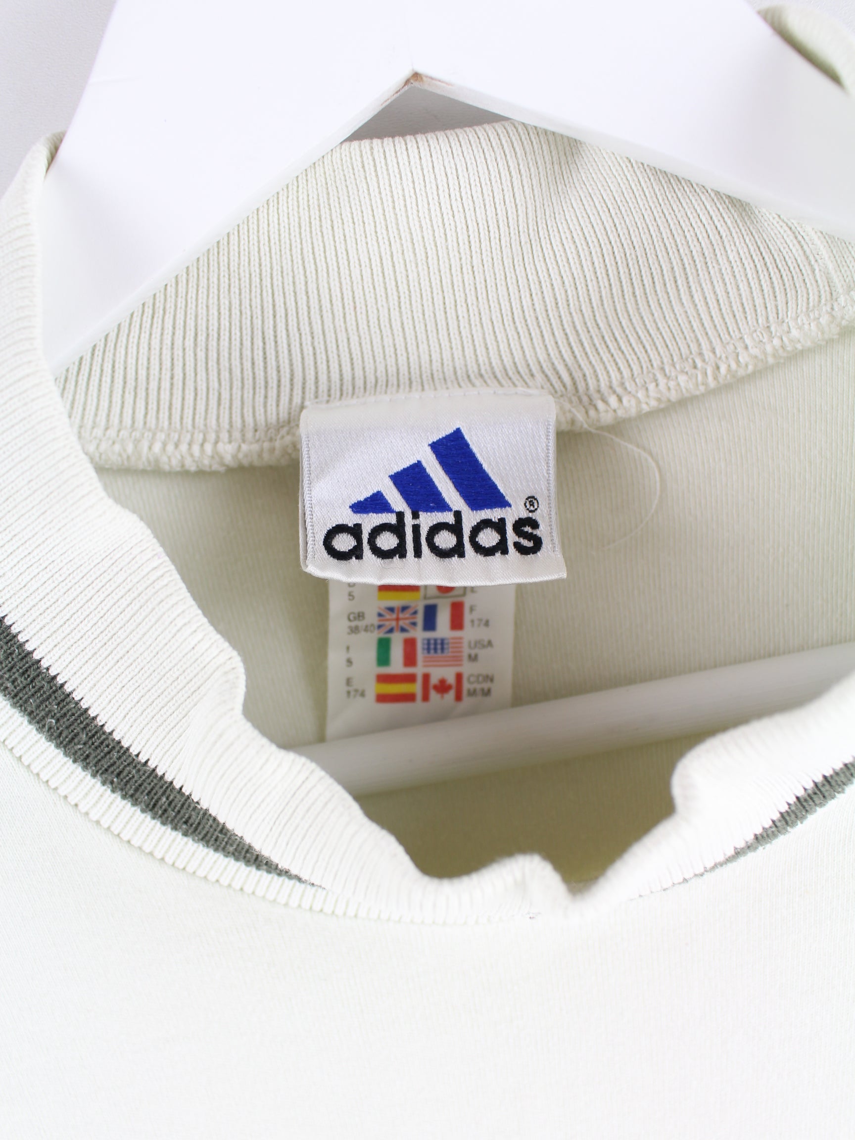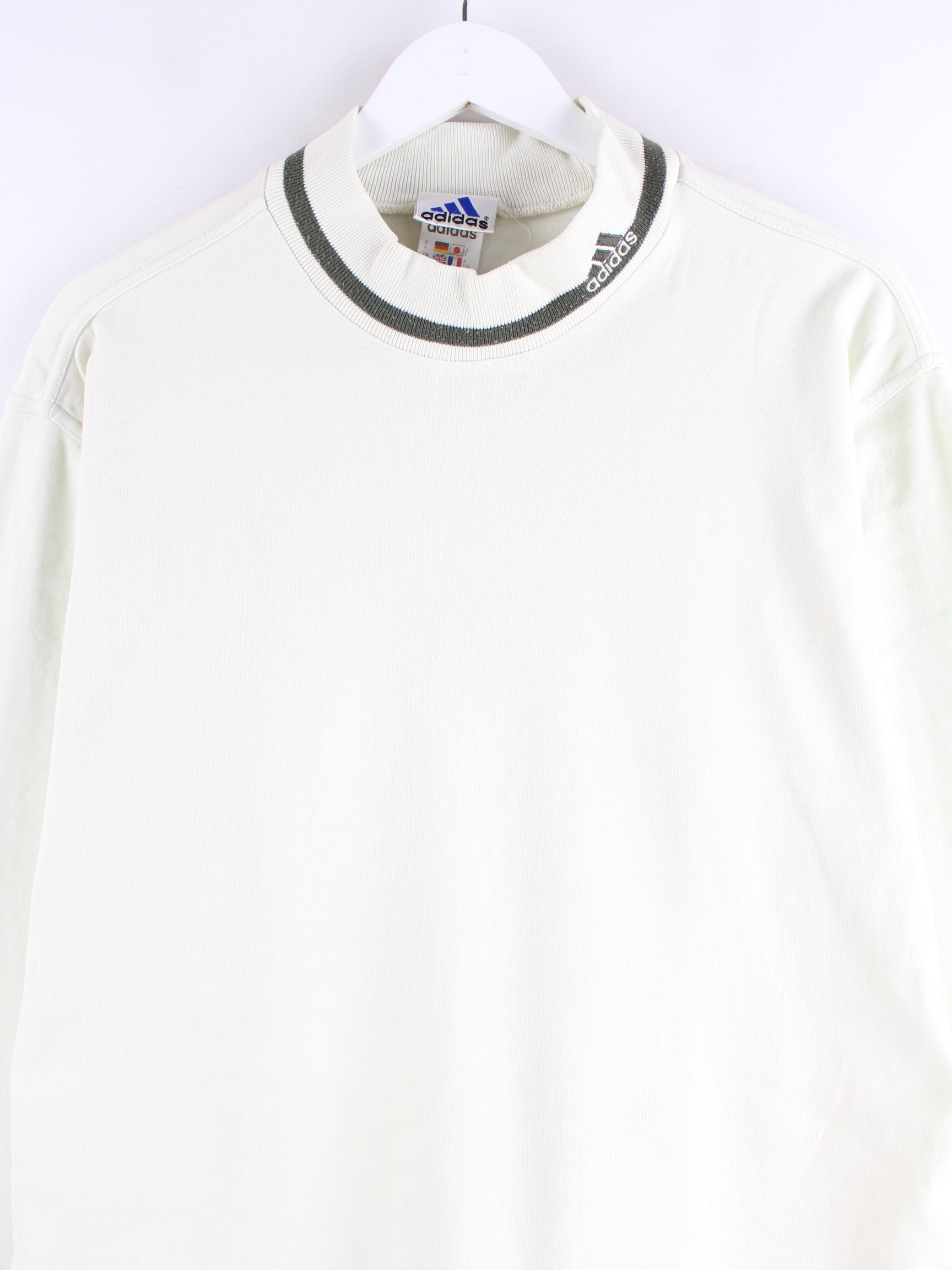 Sweater des Labels Adidas mit gesticktem Logo in Größe L aus den 90'ern. Er ist aus einer Baumwollmischung gefertigt und in Beige vorrätig.