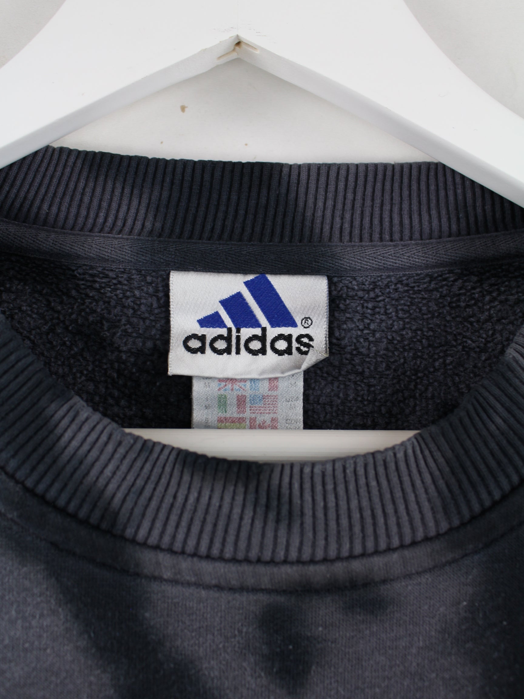 Grauer Sweater mit Stick vom Brand Adidas aus den 90'ern in Größe M. Er ist aus einer Baumwollmischung angefertigt und in gutem Zustand vorrätig.