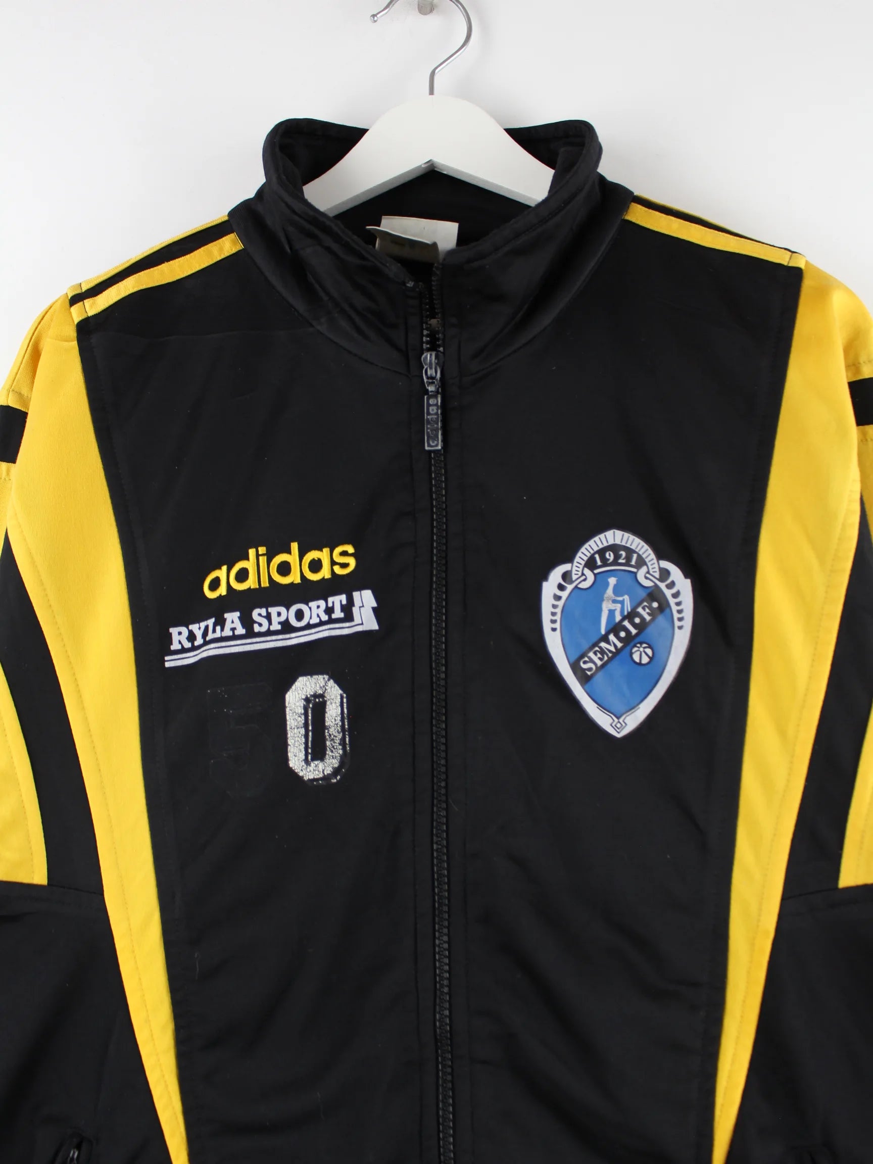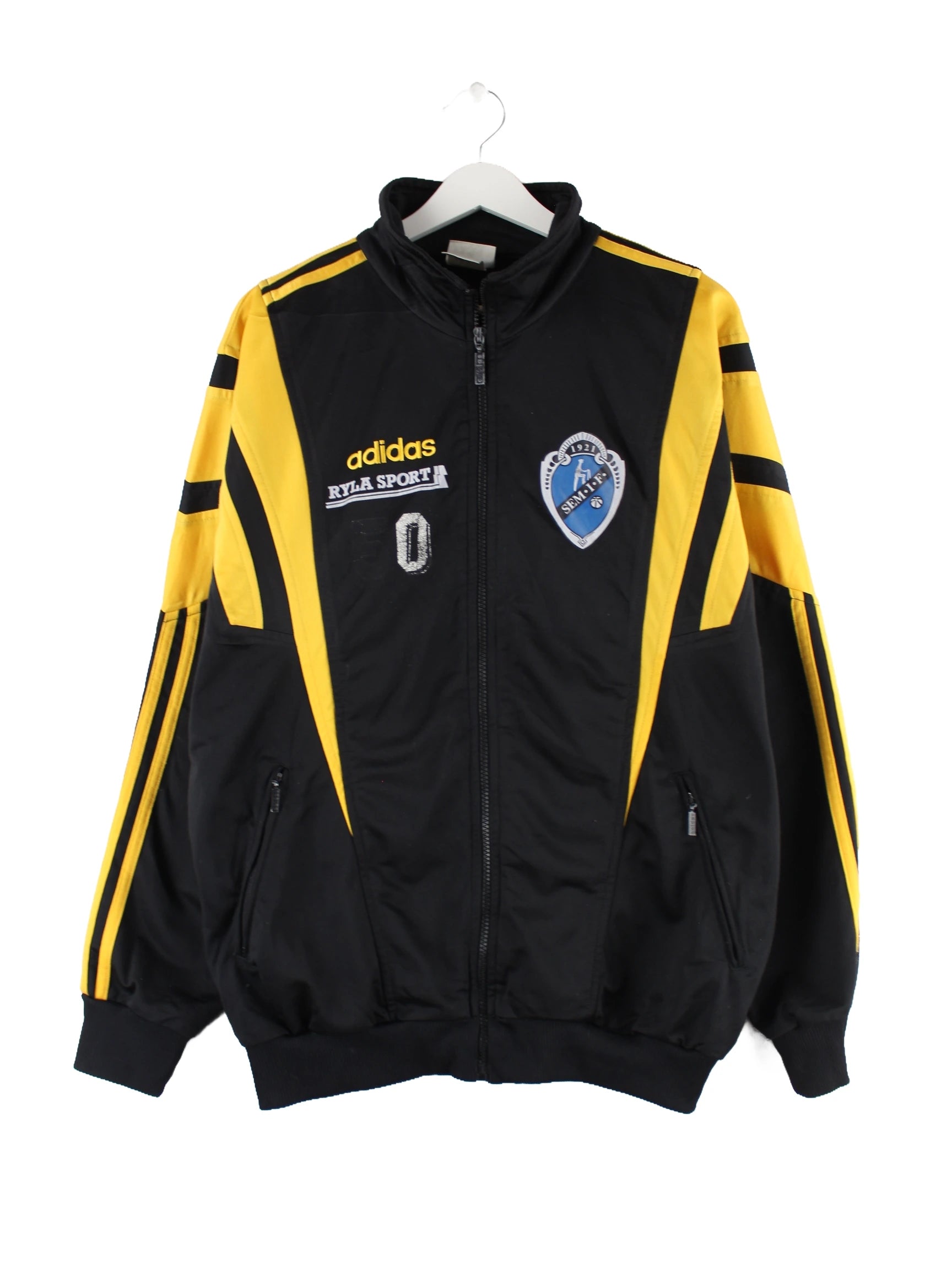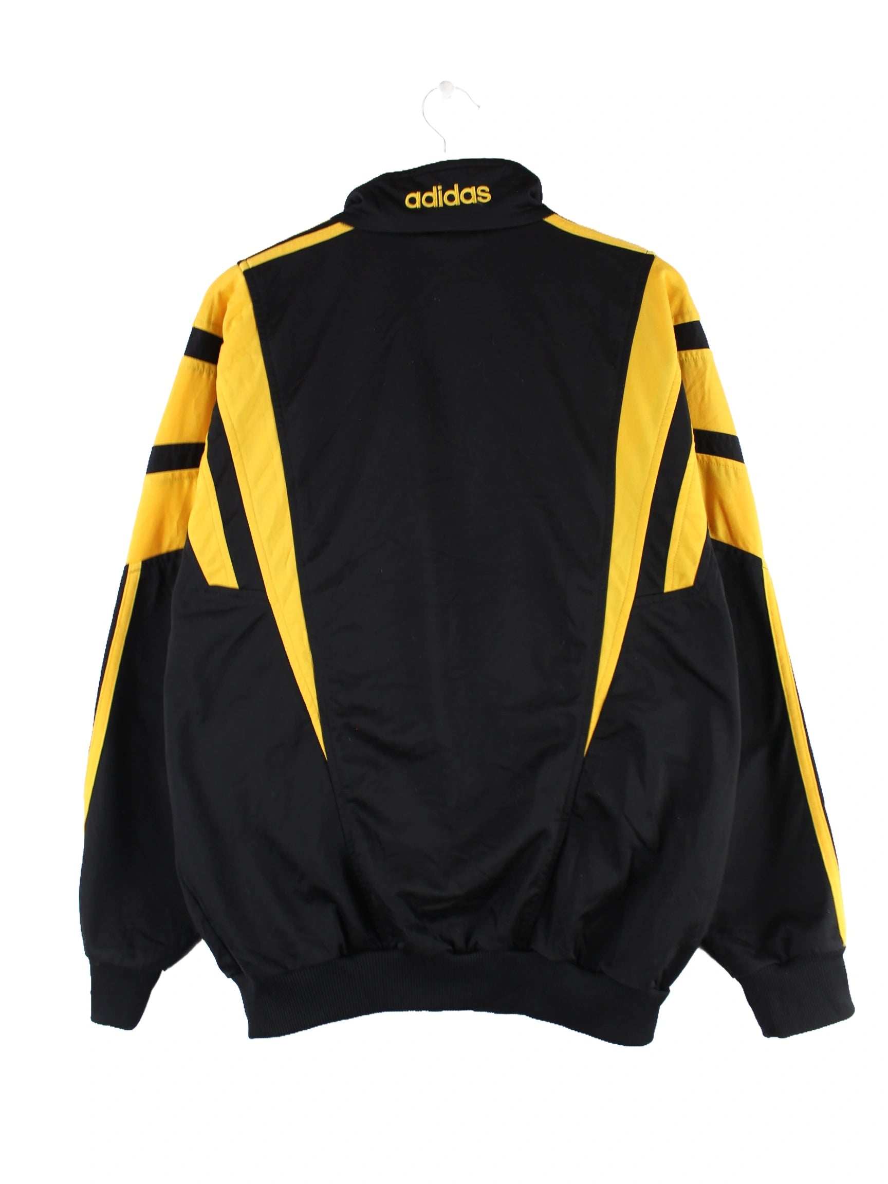 Schwarze Trainingsjacke von Adidas aus den 90'ern in Größe XL. Sie ist aus Synthetik angefertigt und in gutem Zustand bei uns zu bekommen. Mit schönem Vintage Print.