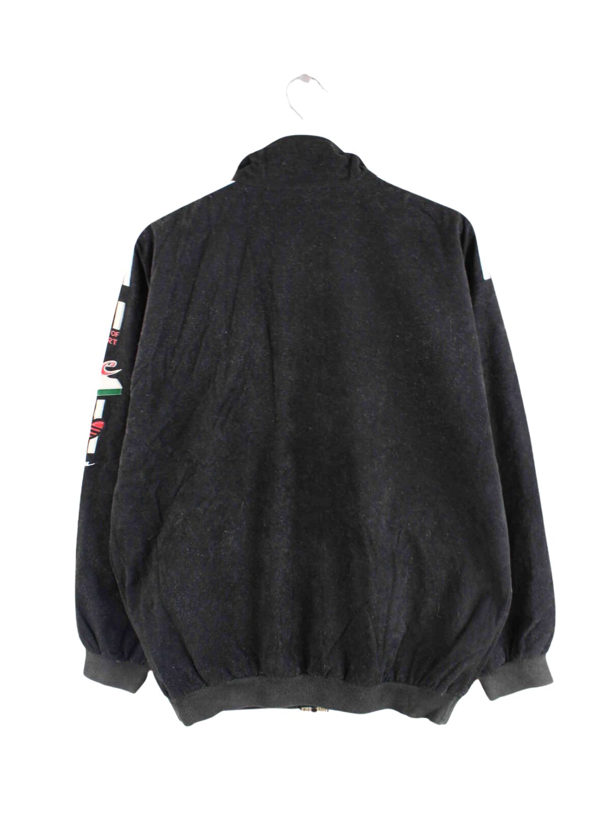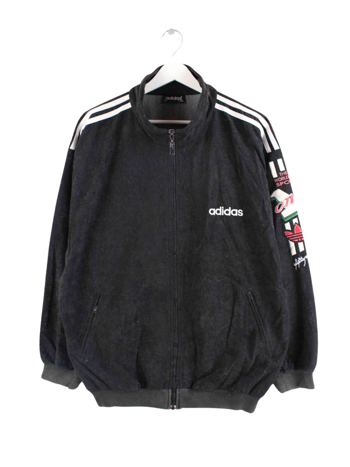 Trainingsjacke aus dem Hause Adidas mit gestickten Motiven in Größe L aus den 90'ern. Sie ist aus Synthetik gefertigt und in Schwarz bei uns vorrätig.