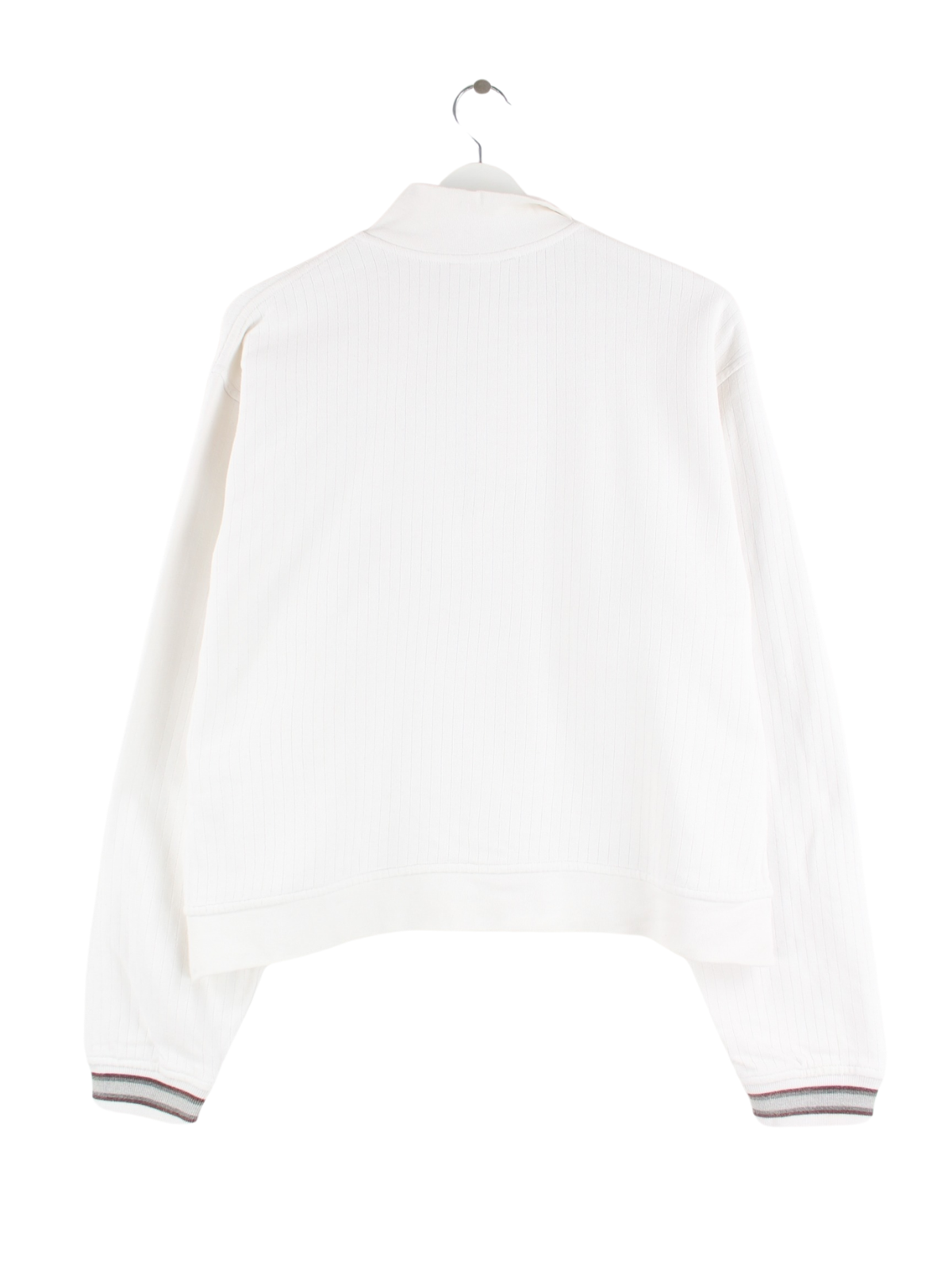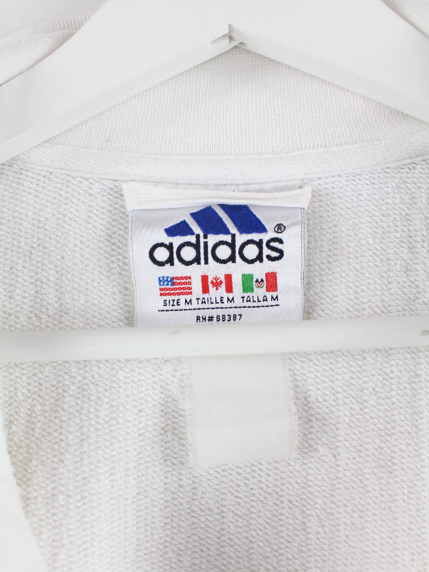 Weißer Sweater mit kurzem Reißverschluß der Brand Adidas aus den 90'ern in Größe M. Er ist aus einer Baumwollmischung produziert und in sehr gutem Zustand im Bestand.