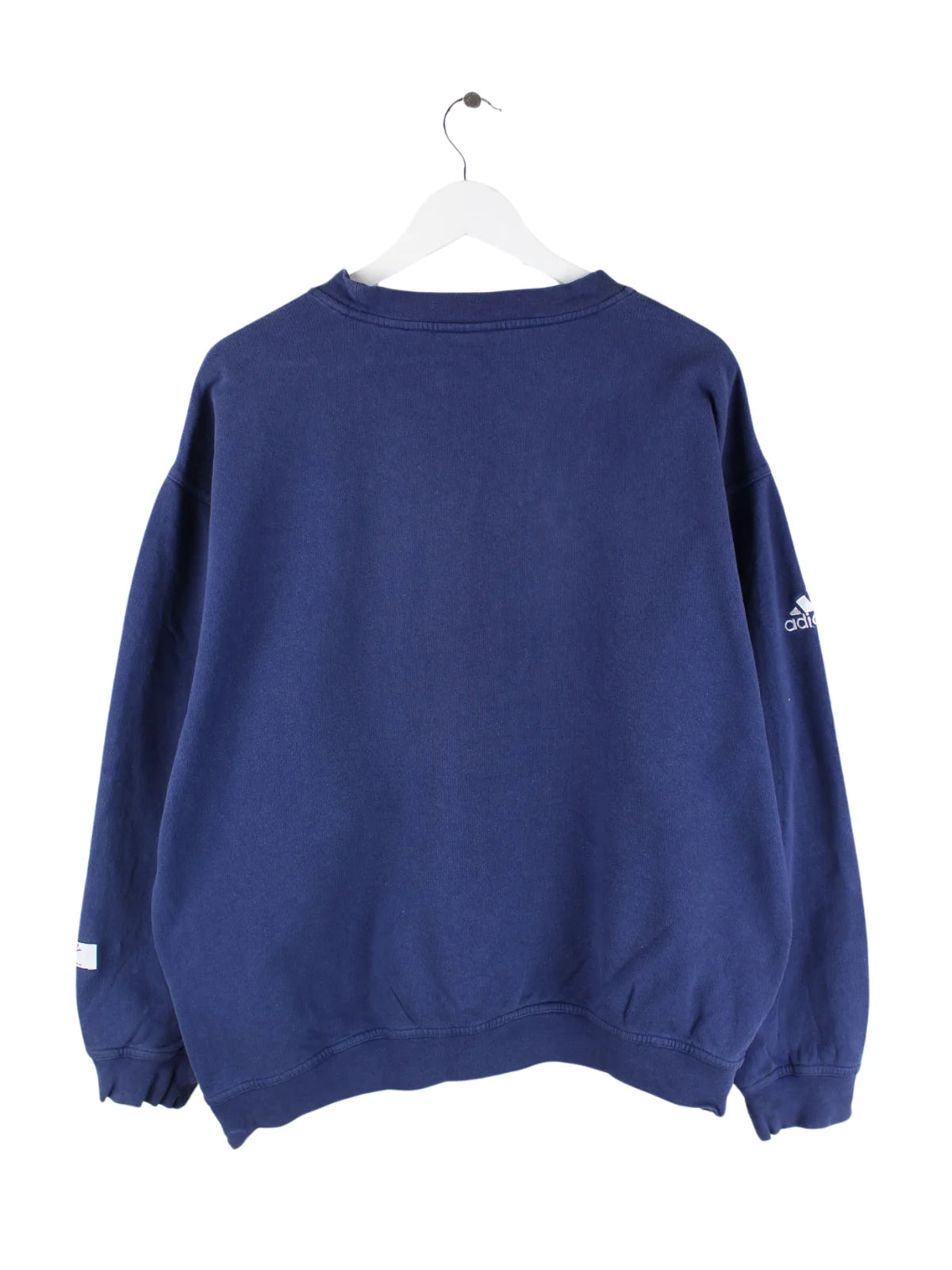 Blauer Sweater vom Label Adidas in Größe L. Er ist aus einer Baumwollmischung produziert und in gutem Zustand bei uns zu bekommen.