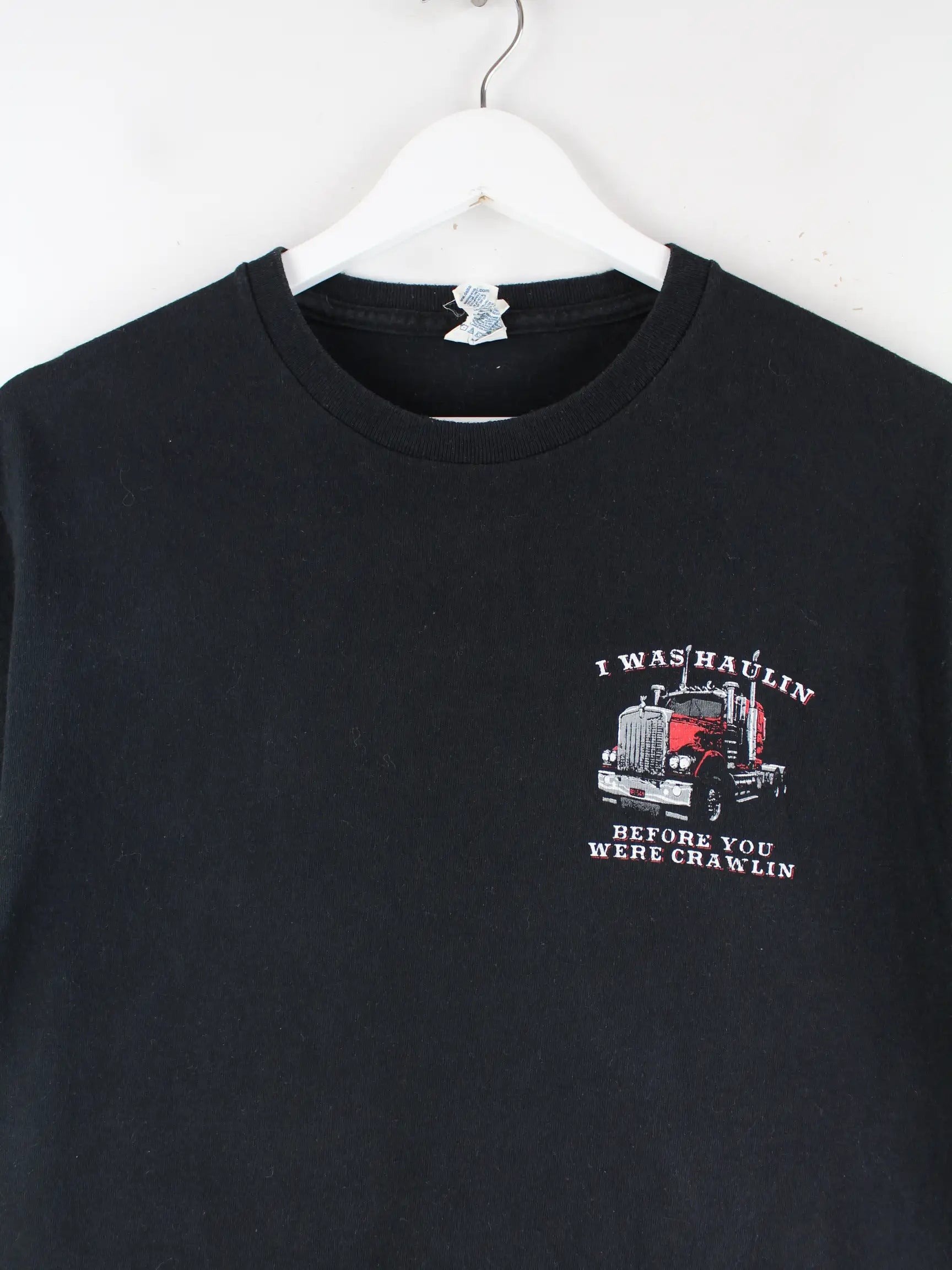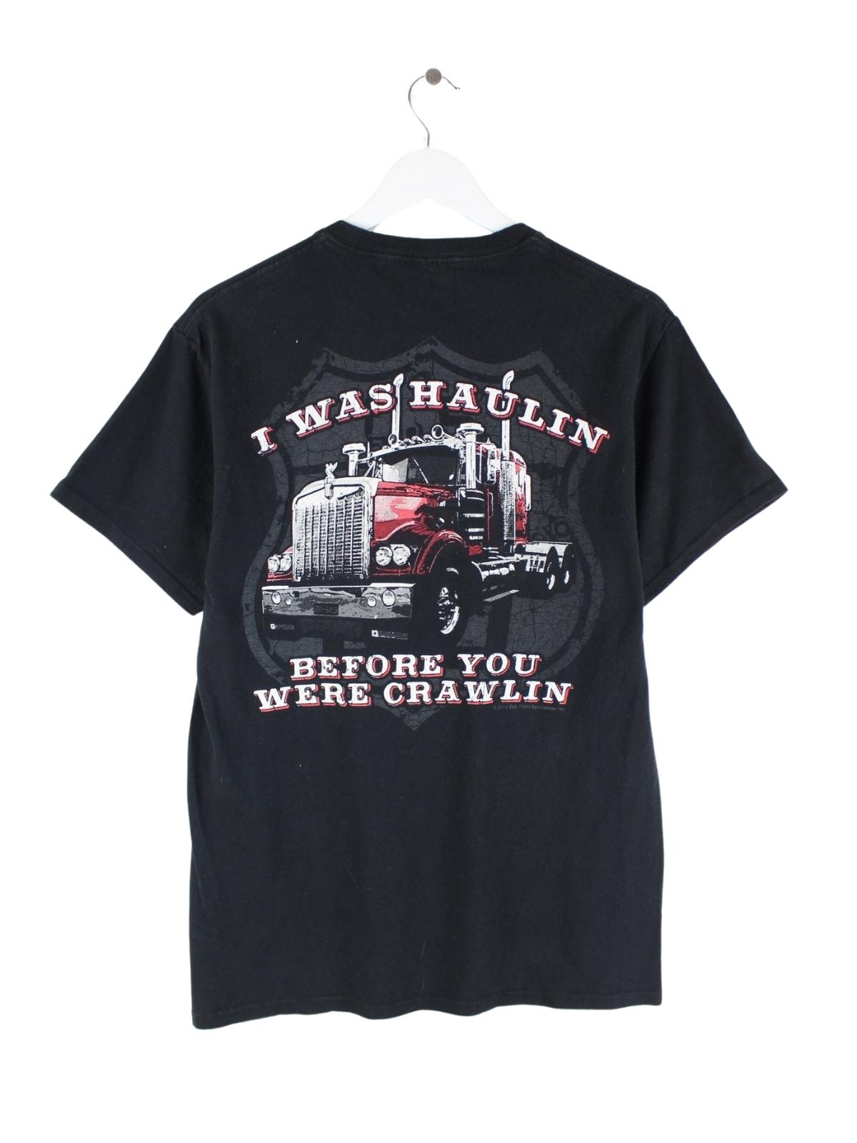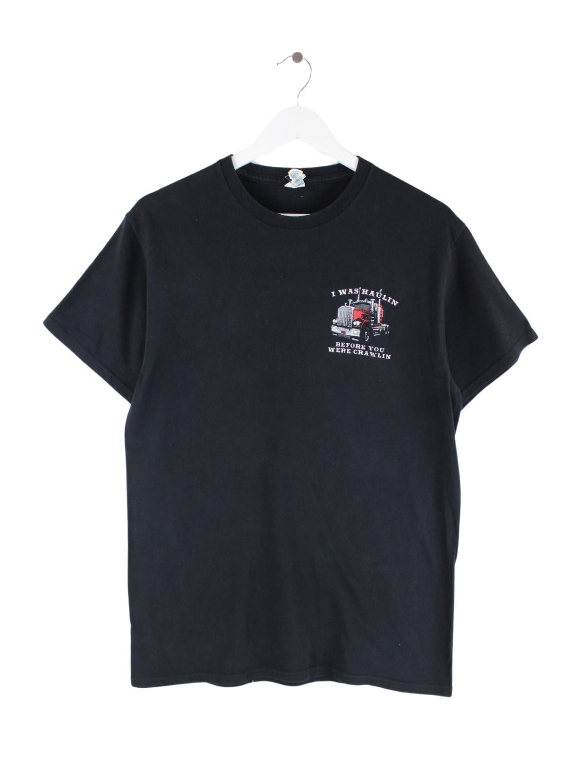 Schwarzes T-Shirt vom Label Delta in Größe M. Es ist aus Baumwolle produziert und in sehr gutem Zustand vorrätig. Mit seltenem Trucker Print.