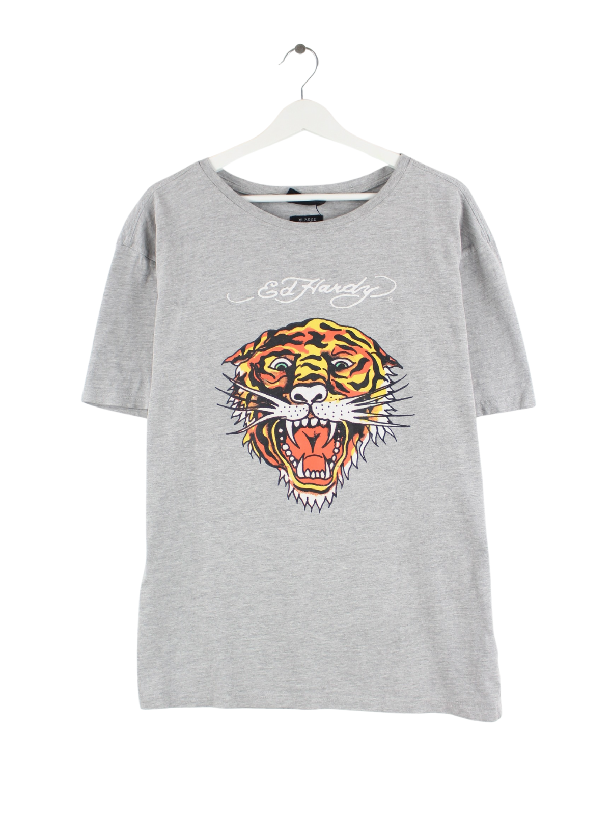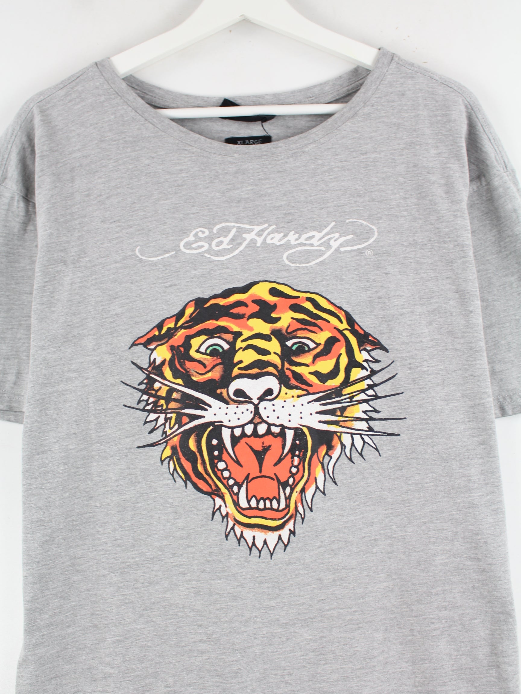 Graues T-Shirt vom Brand Ed Hardy in Größe XL. Es ist aus Baumwolle angefertigt und in sehr gutem Zustand lieferbar. Mit tollem Print.