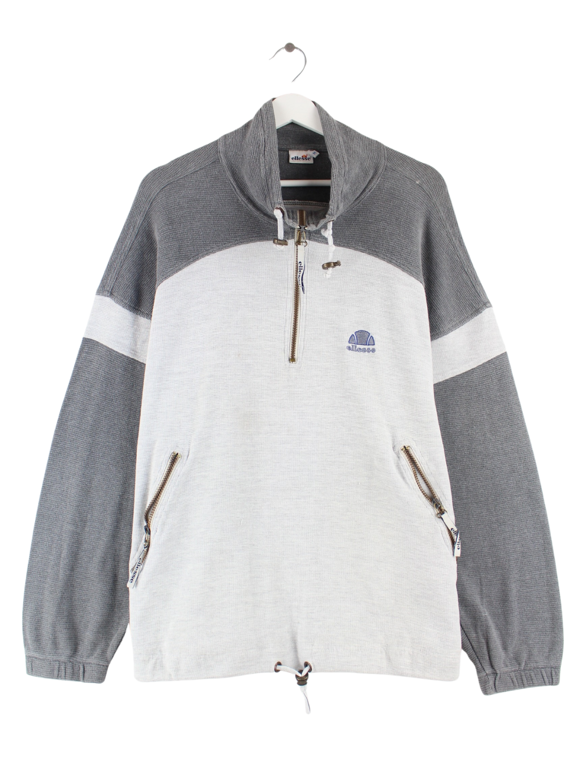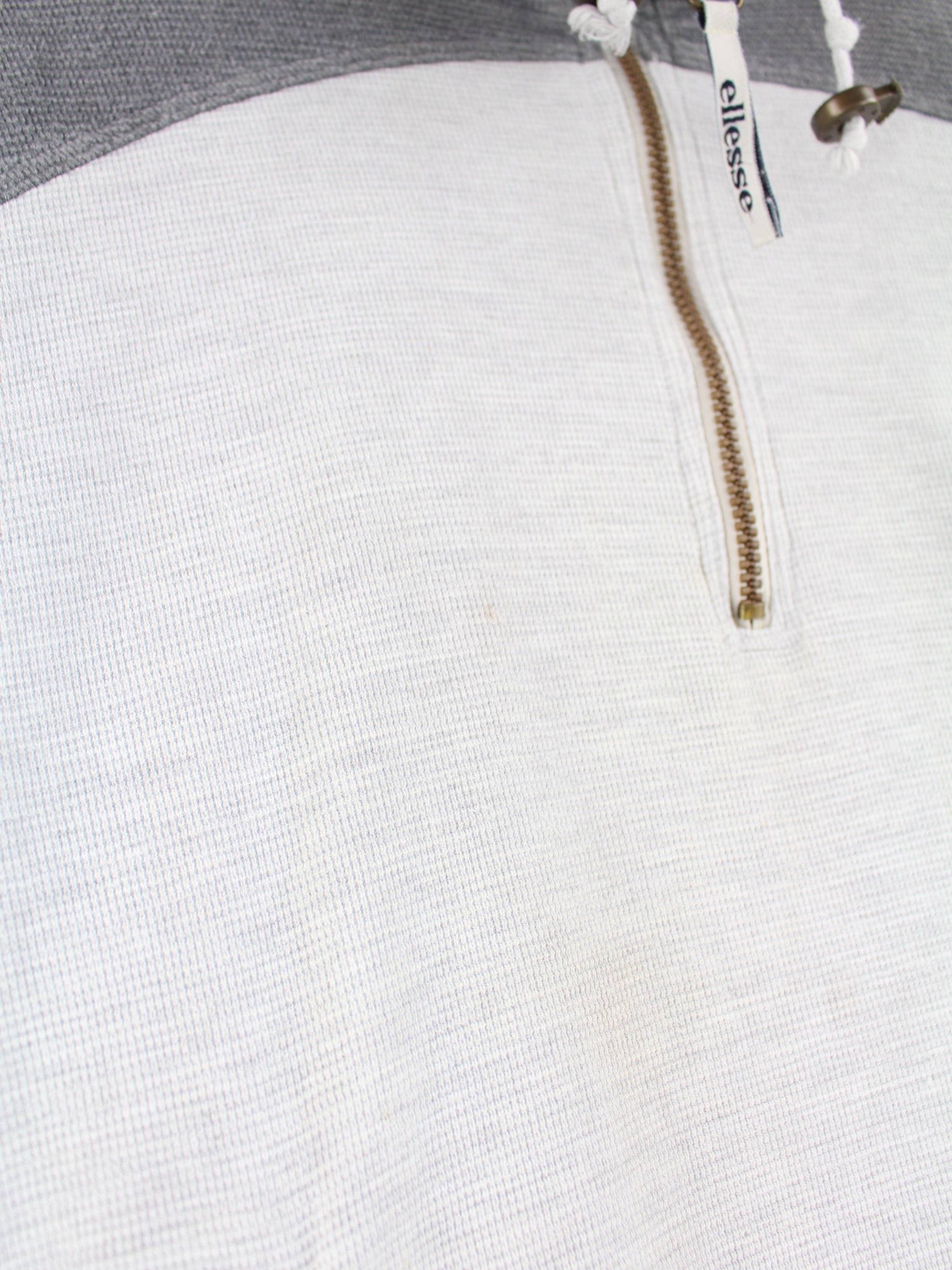 Grauer Sweater mit Stick und kurzem Reißverschluß von Ellesse in Größe L. Er ist aus einer Baumwollmischung produziert und in gutem Zustand in Stock.