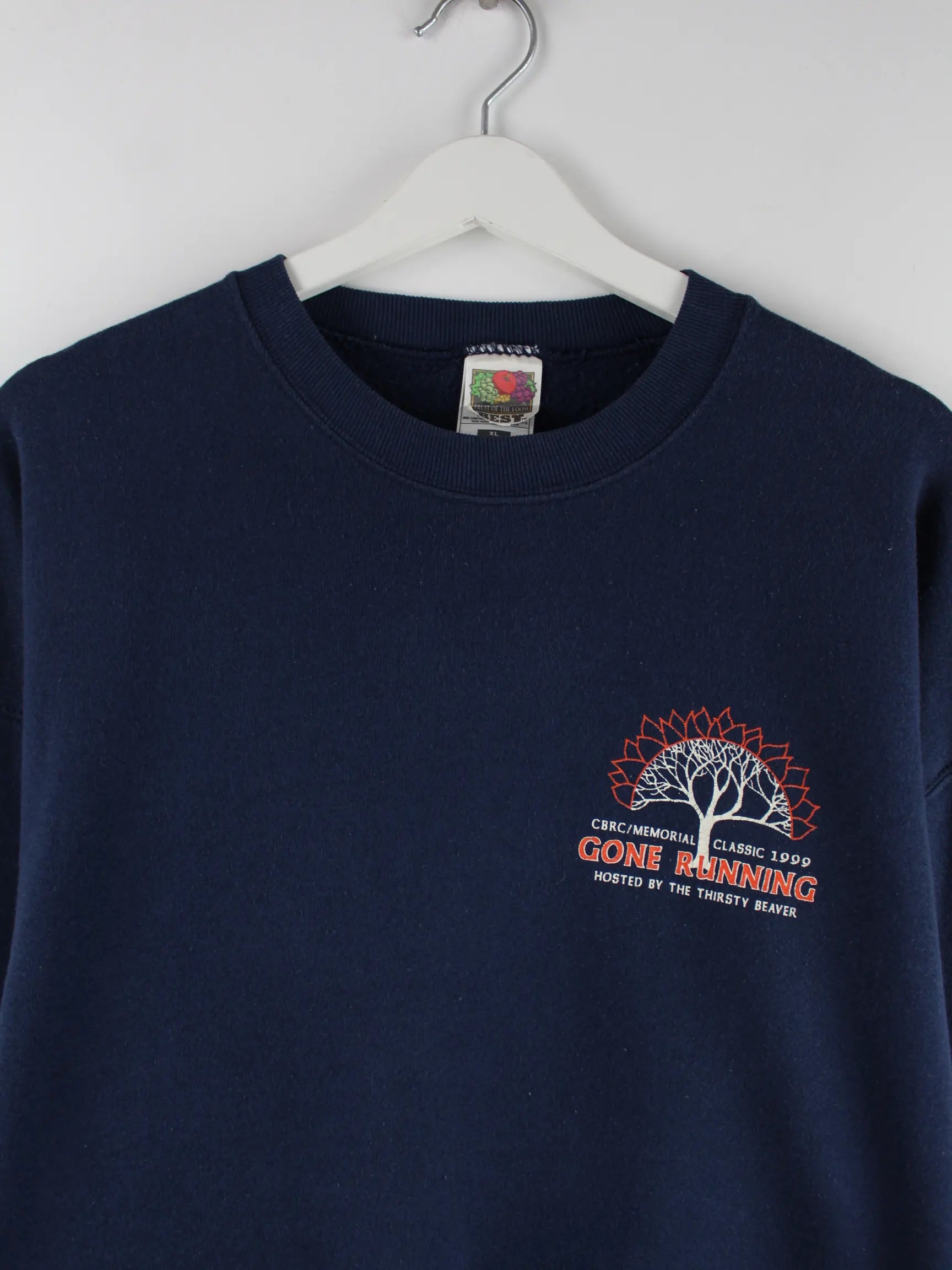 Blauer Sweater vom Label Fruit of the Loom in Größe XL. Er ist aus einer Baumwollmischung angefertigt und in sehr gutem Zustand lieferbar. Mit seltenem Run Print.