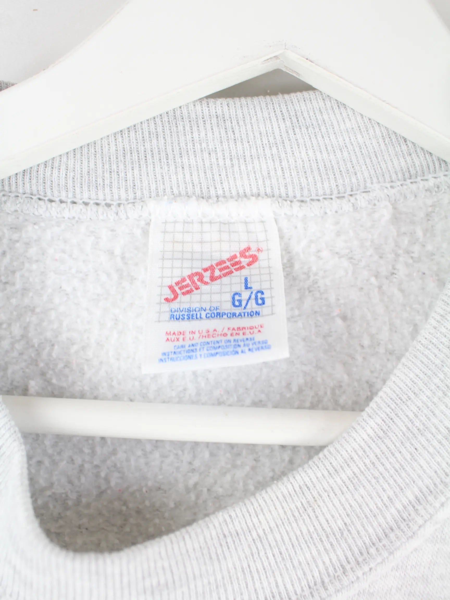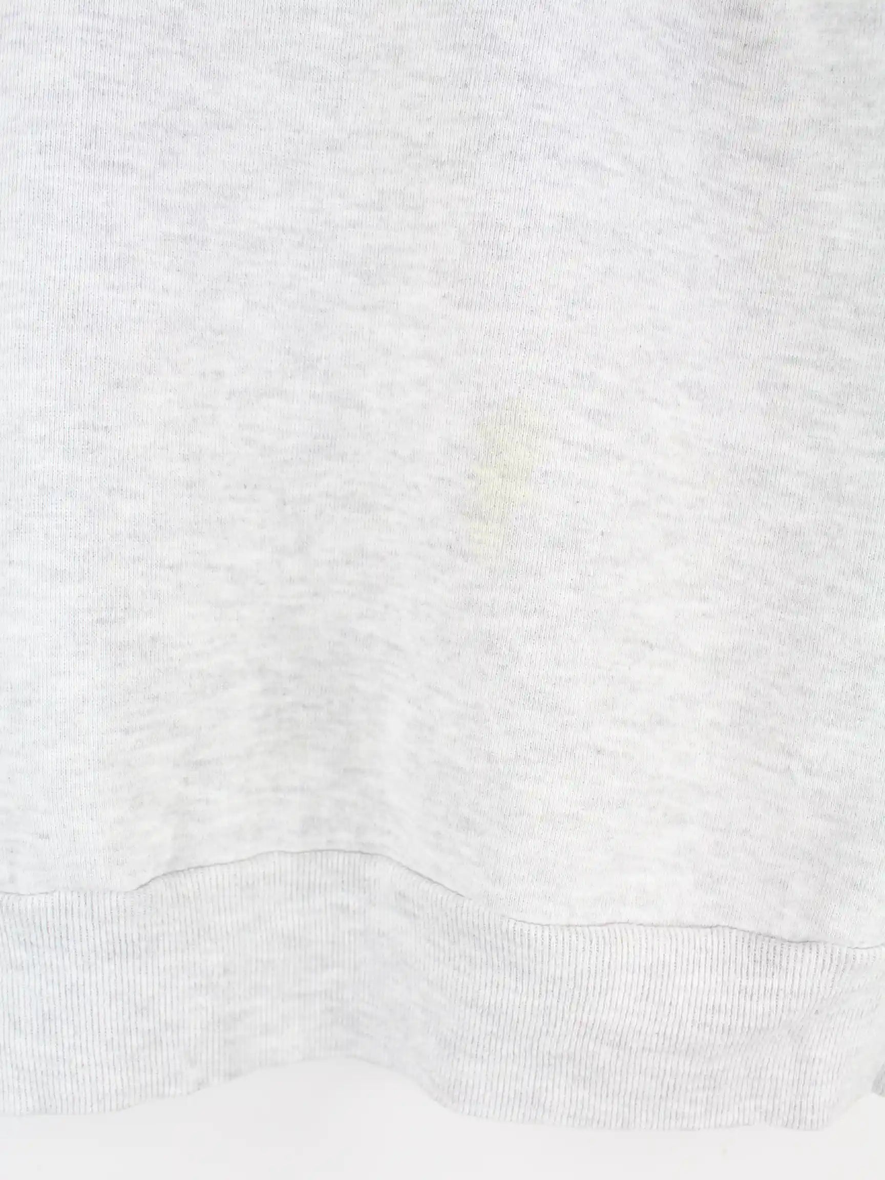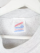 Grauer Sweater mit Stickereien der Marke Jerzees aus den 90'ern in Größe L. Er ist aus einer Baumwollmischung gemacht. Den Zustand würden wir als 'In Ordnung' bezeichnen (vergl. Bilder).
