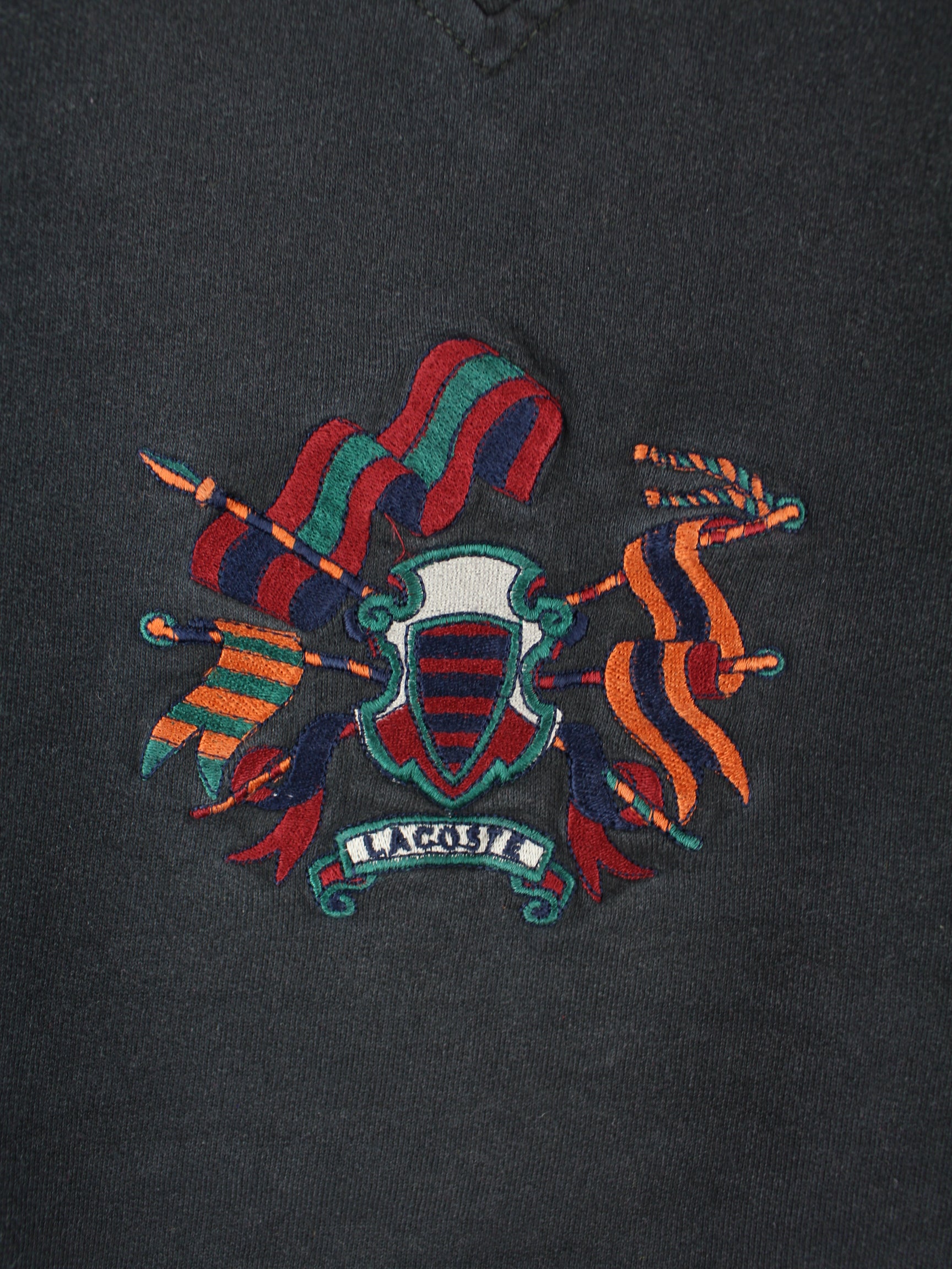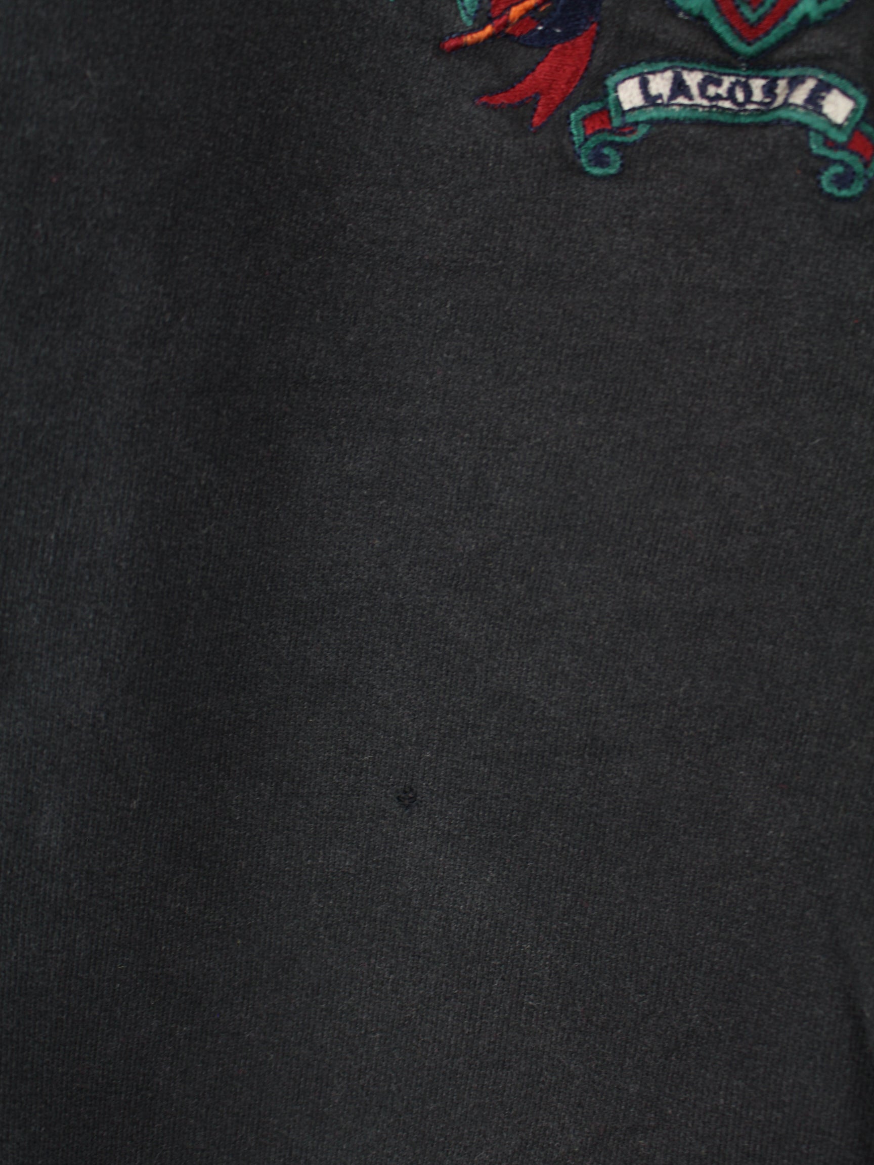 Schwarzer Sweater mit gestickten Motiven von Lacoste aus den 90'ern in Größe L. Er ist aus einer Baumwollmischung gemacht und in gutem Zustand im Bestand.
