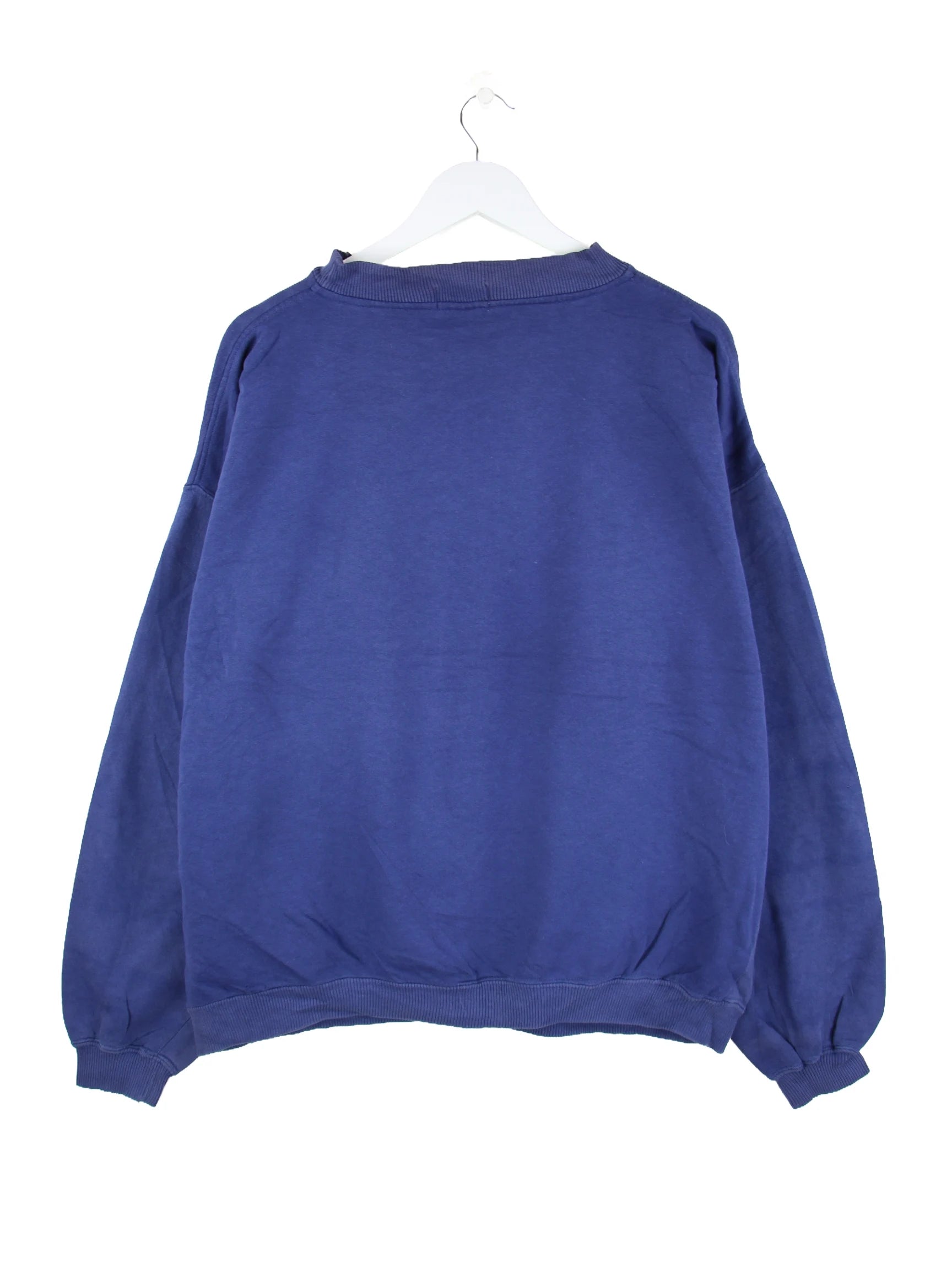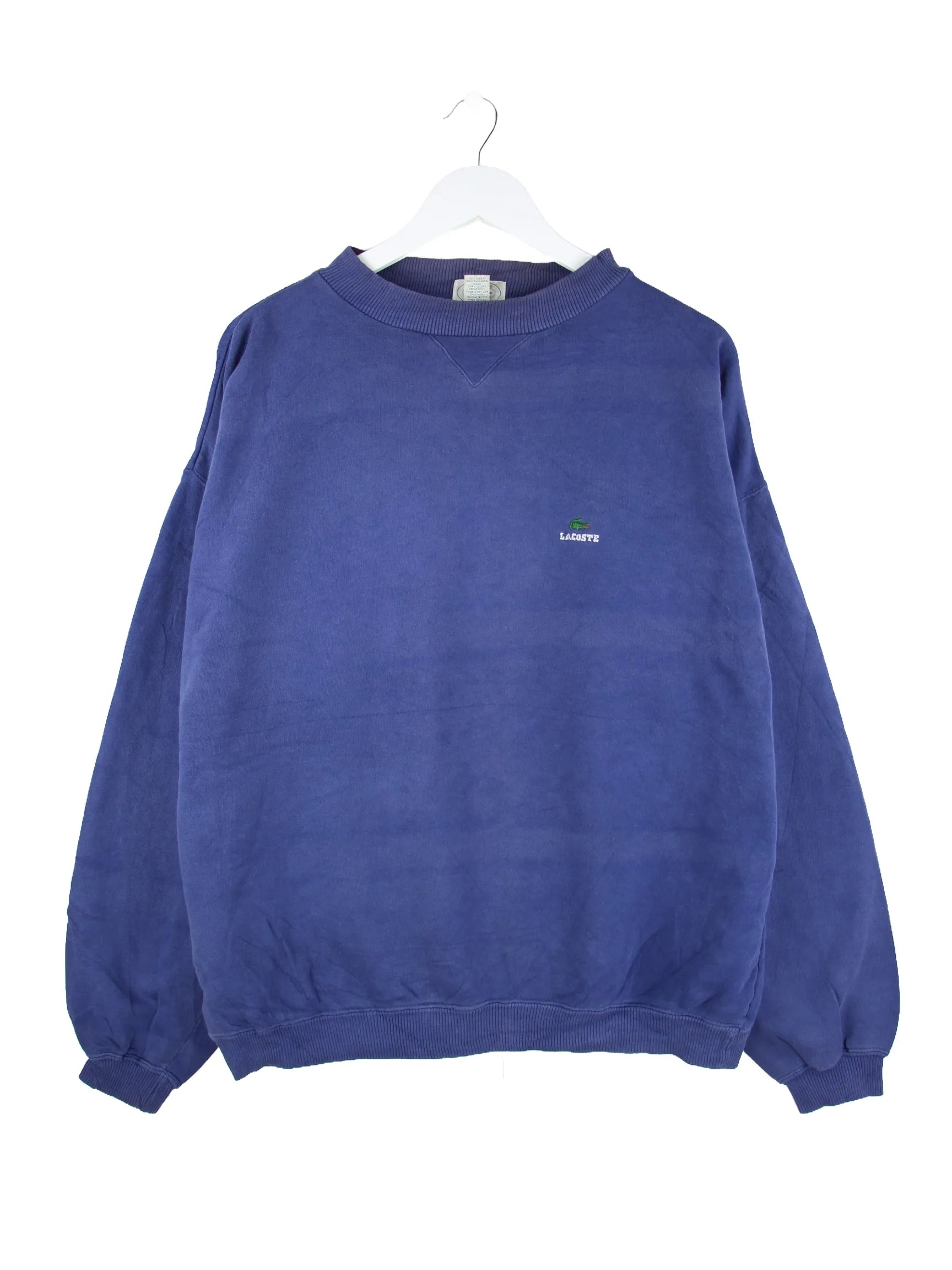 Blauer Sweater der Marke Lacoste aus den 80'ern in Größe XL. Er ist aus einer Baumwollmischung angefertigt. Den Zustand würden wir als 'In Ordnung' bezeichnen (vergl. Bilder).