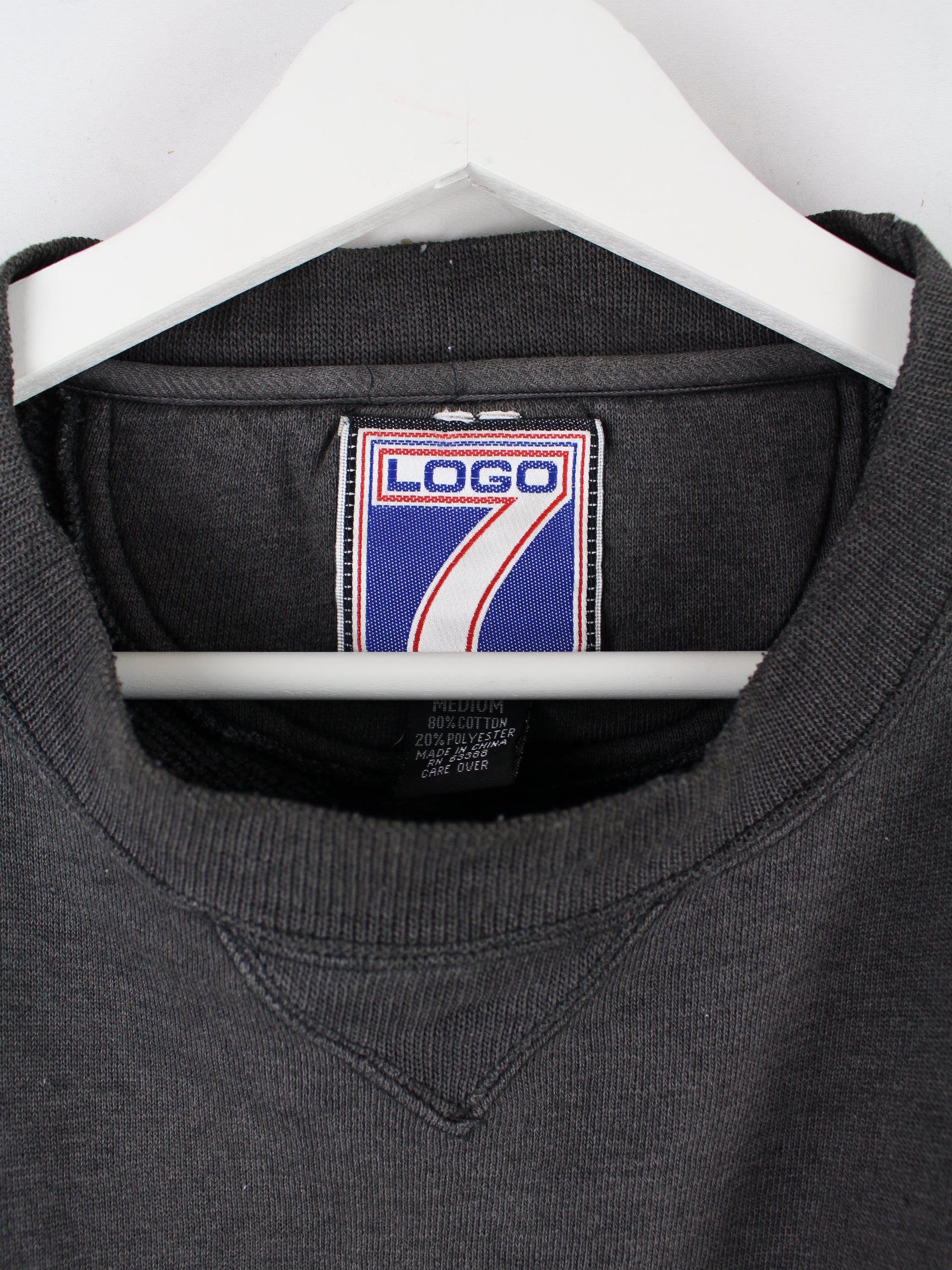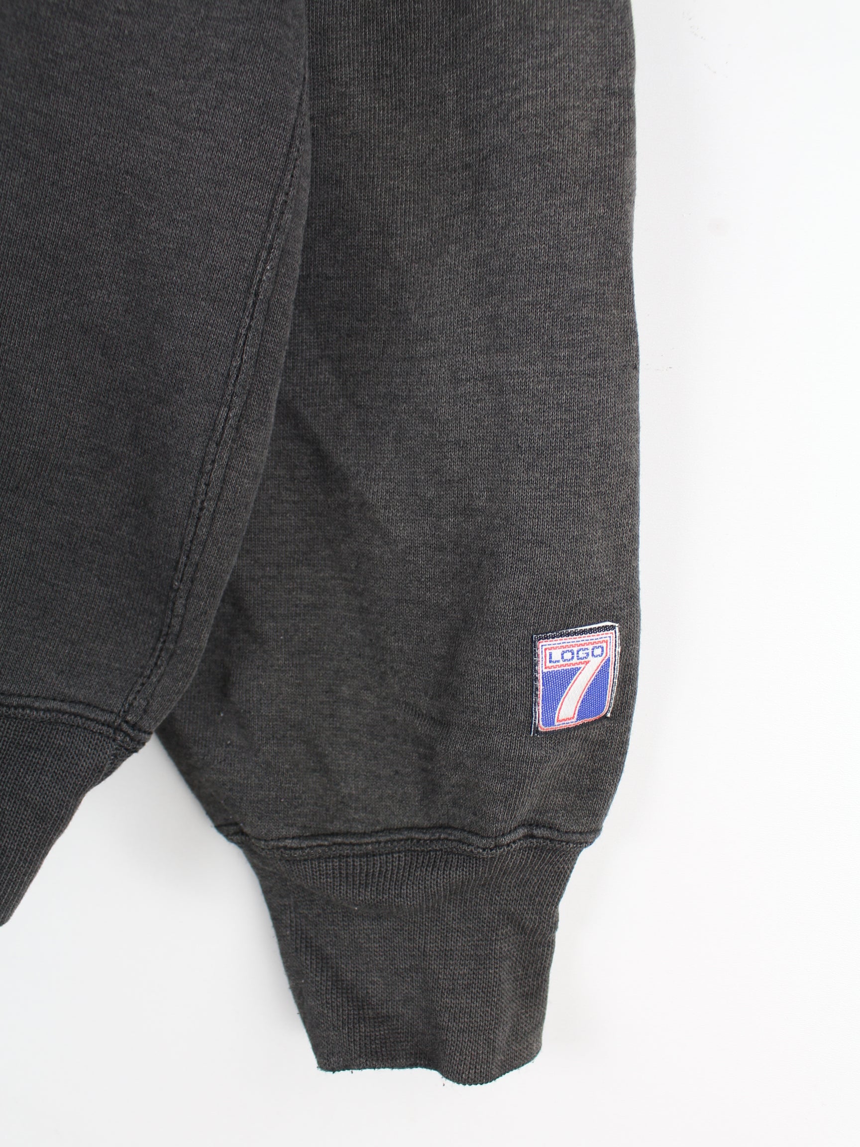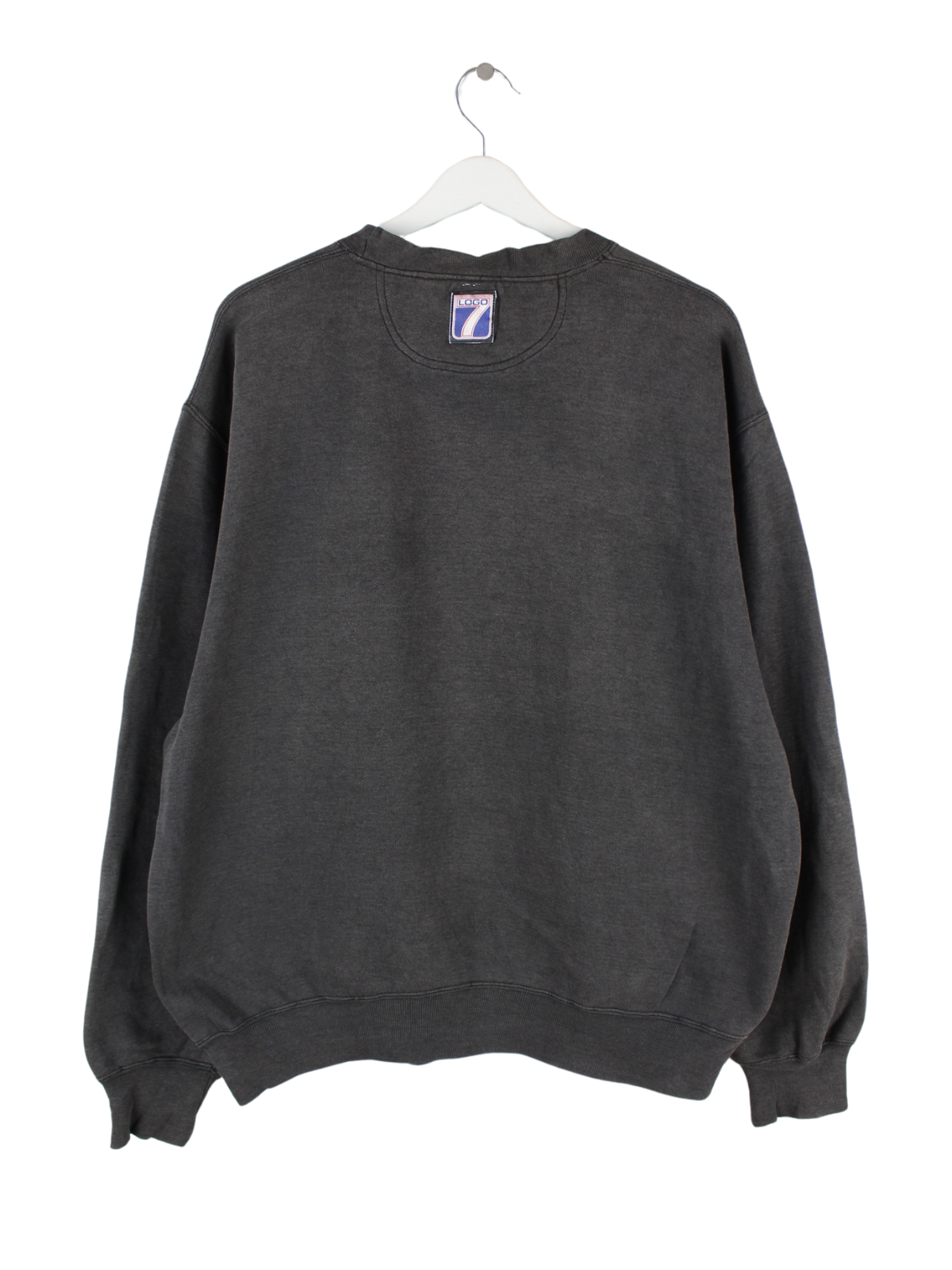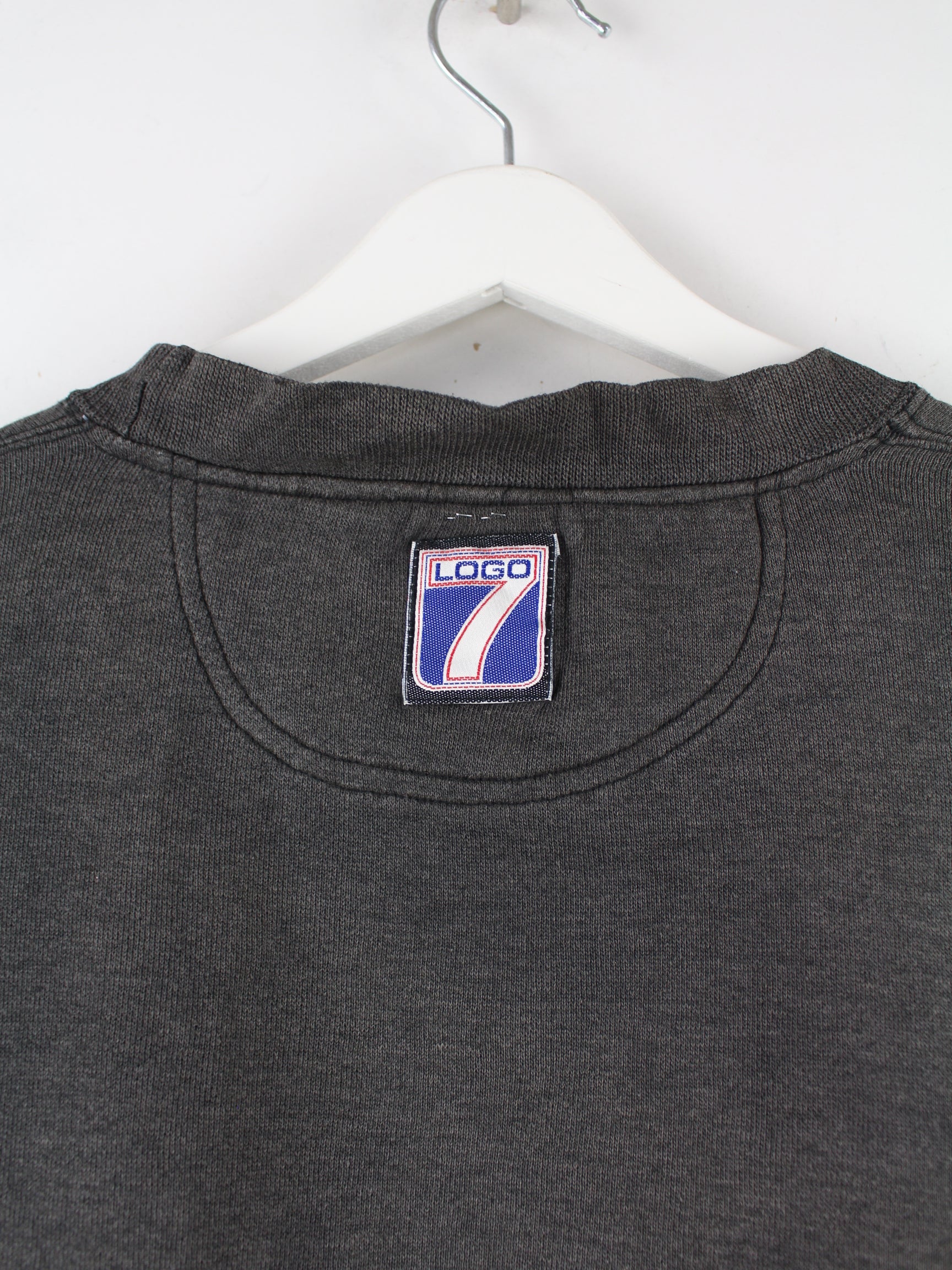 Grauer Sweater von Logo 7 aus den 90'ern in Größe XL. Er ist aus einer Baumwollmischung gefertigt und in gutem Zustand bei uns zu bekommen.