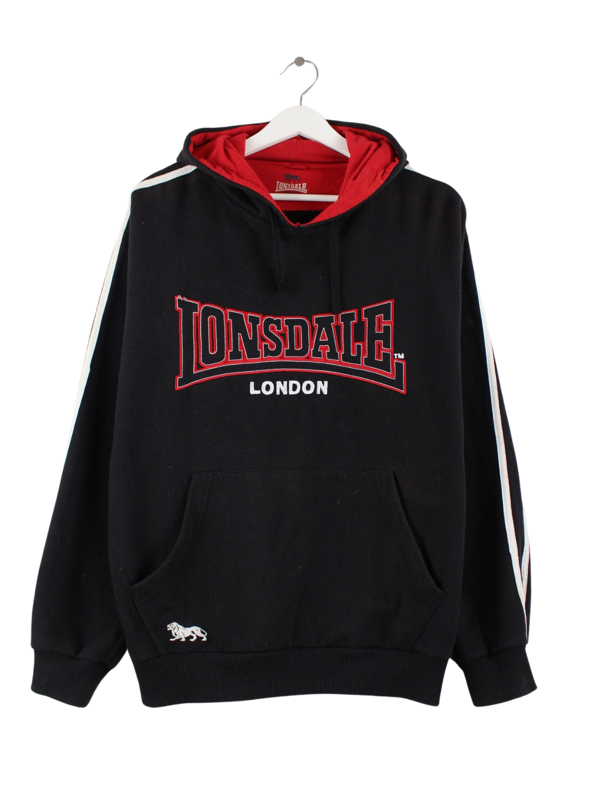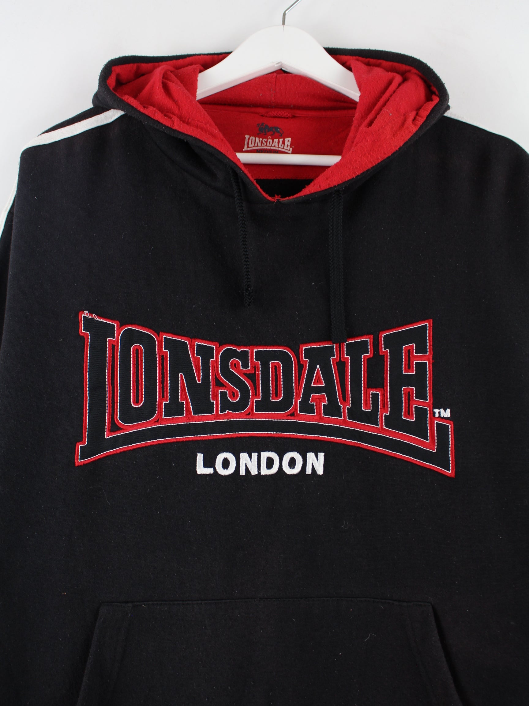 Hoodie aus dem Hause Lonsdale mit Stickereien in Größe M. Er ist aus einer Baumwollmischung produziert und in Schwarz lieferbar.