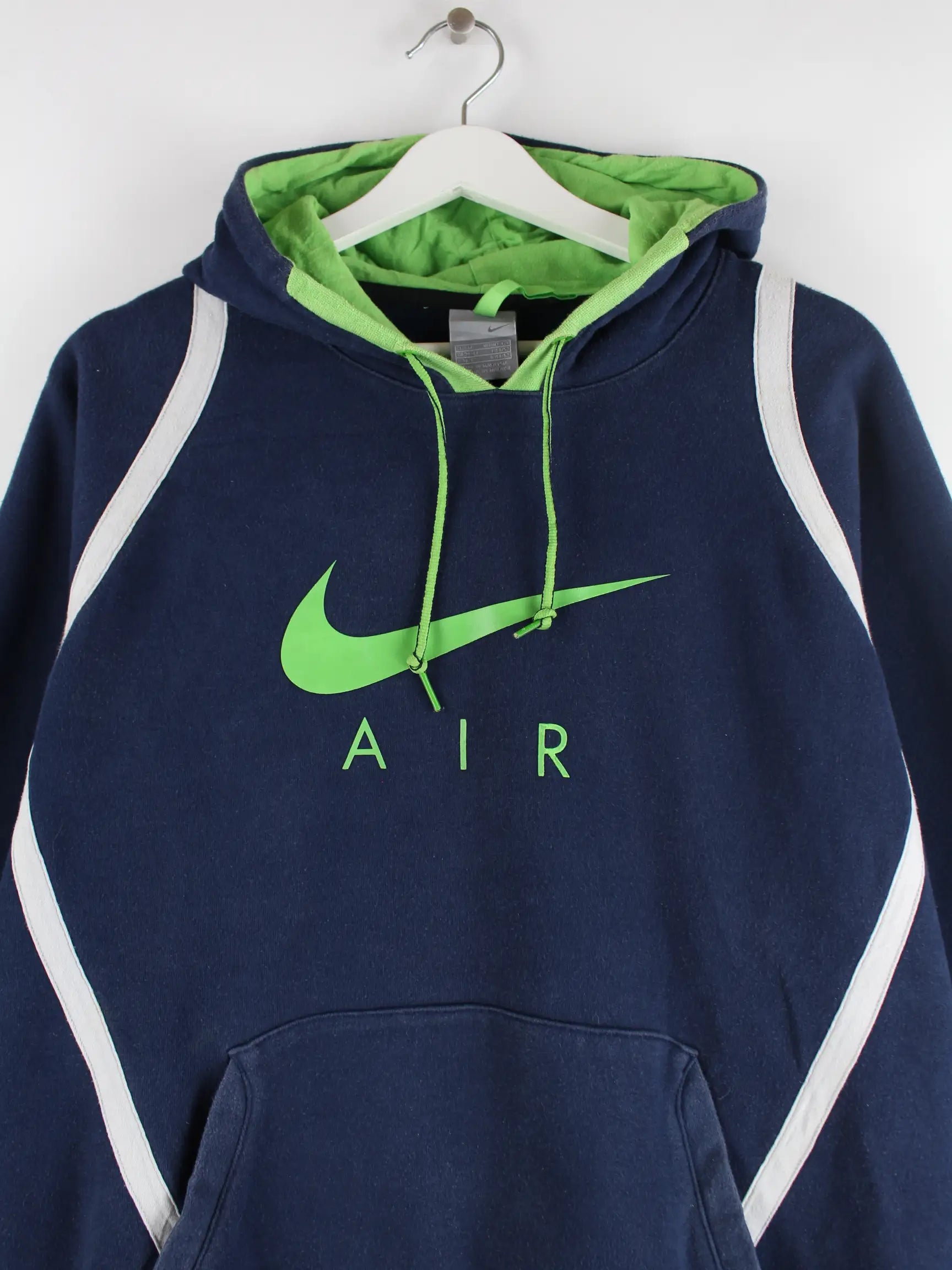 Blauer Hoodie des Labels Nike in Größe M. Er ist aus einer Baumwollmischung produziert und in gutem Zustand bei uns zu bekommen. Mit chiquem 00s Print.