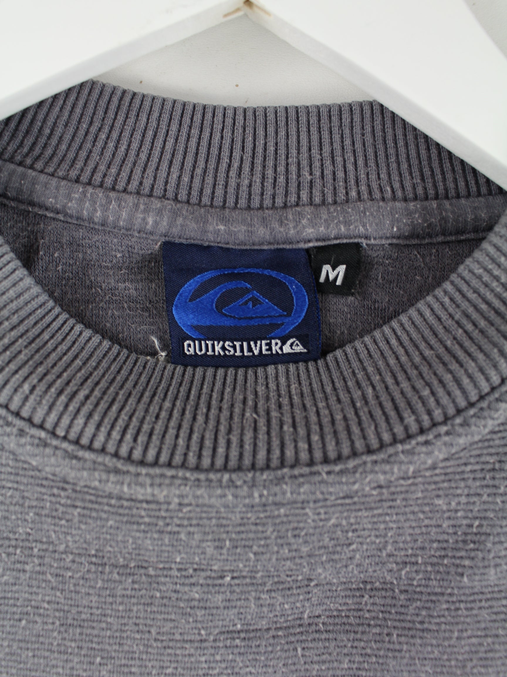 Grauer Sweater mit gestickten Motiven aus dem Hause Quiksilver aus den 90'ern in Größe M. Er ist aus einer Baumwollmischung angefertigt und in sehr gutem Zustand im Angebot.