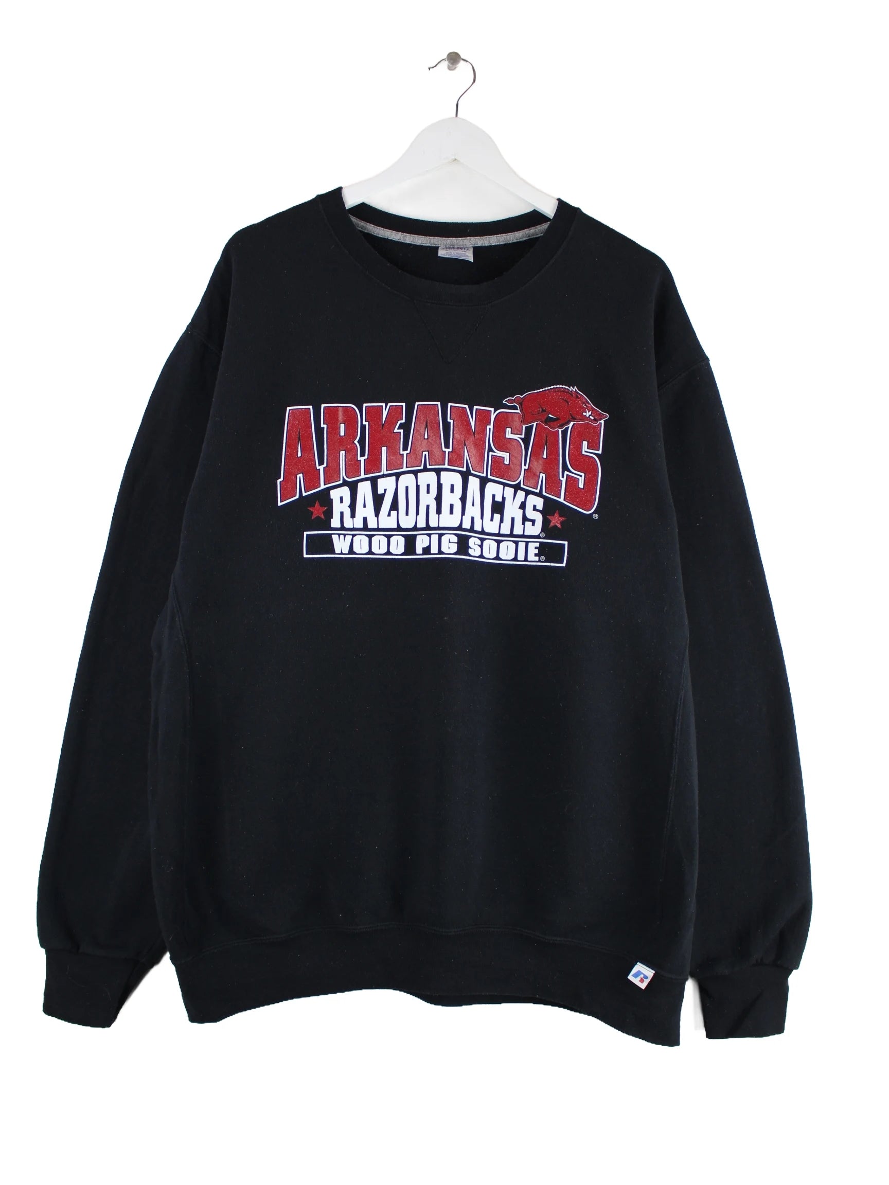 Sweater aus dem Hause Russell Athletic in Größe XL. Er ist aus einer Baumwollmischung produziert und in Schwarz vorrätig. Mit seltenem Razorbacks Print.